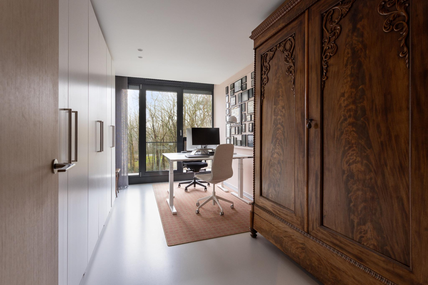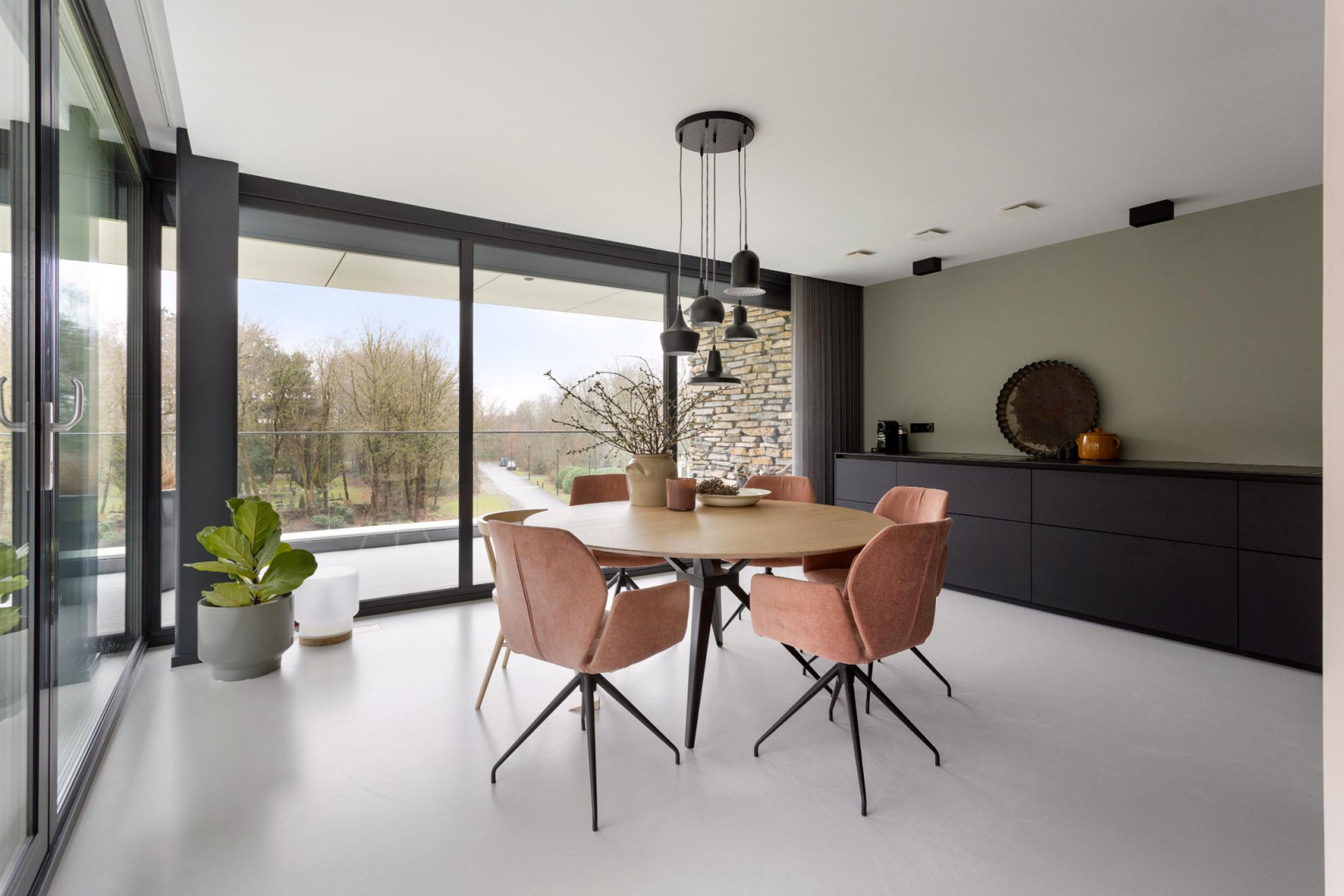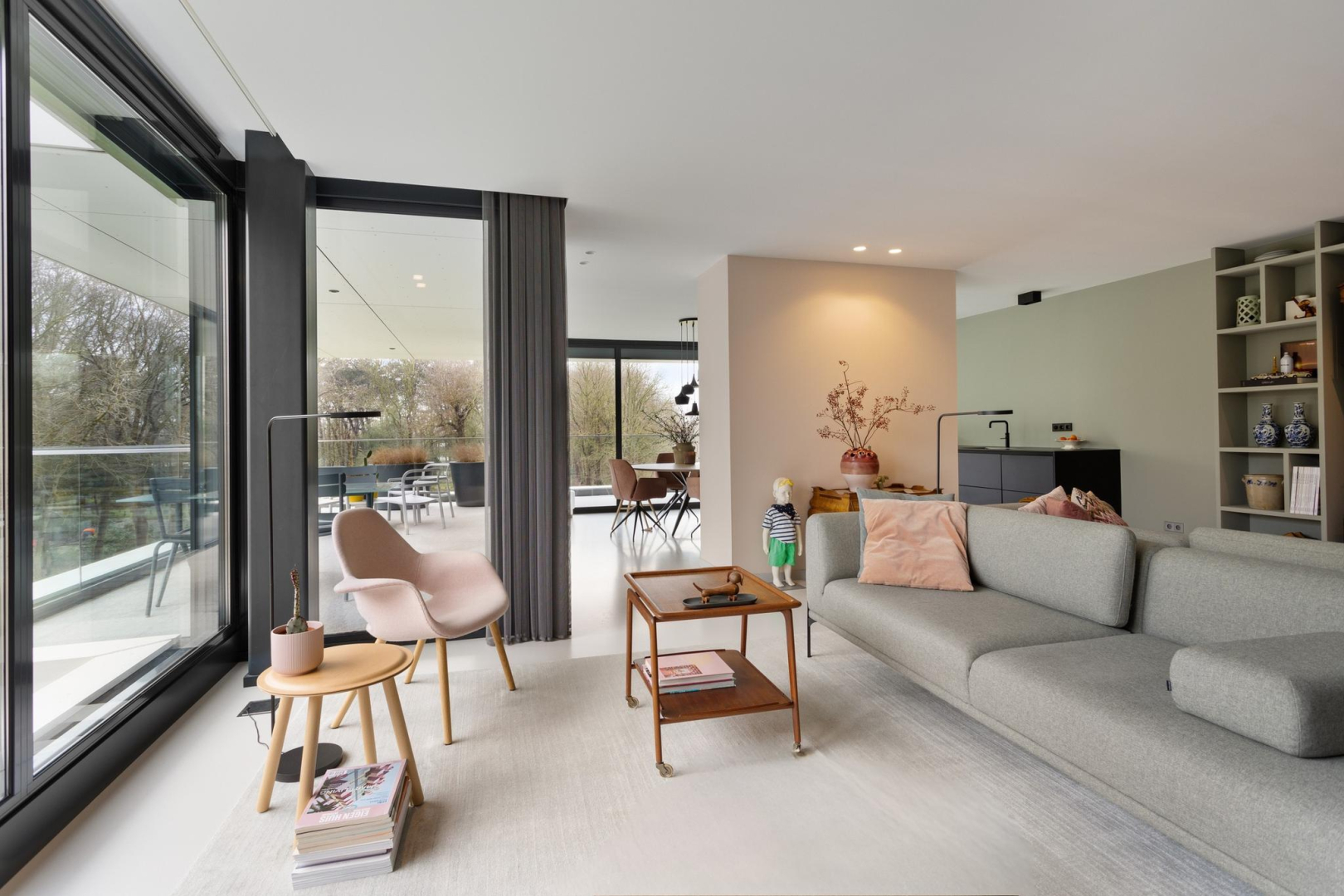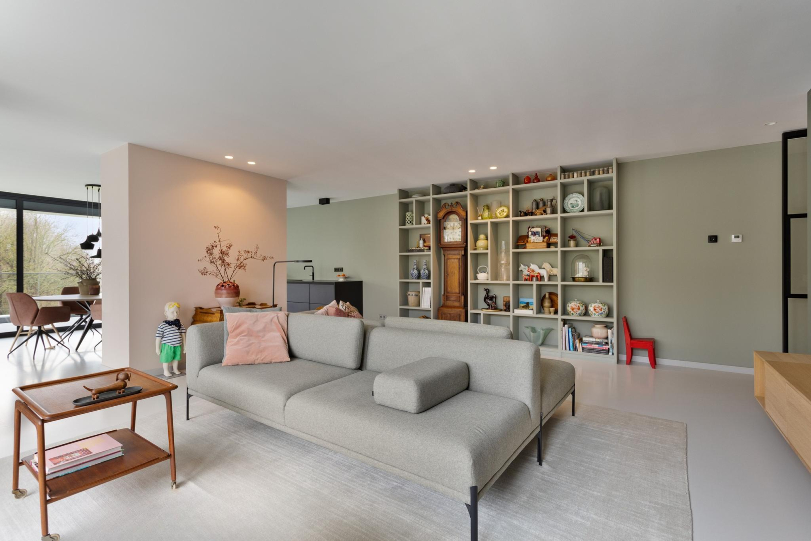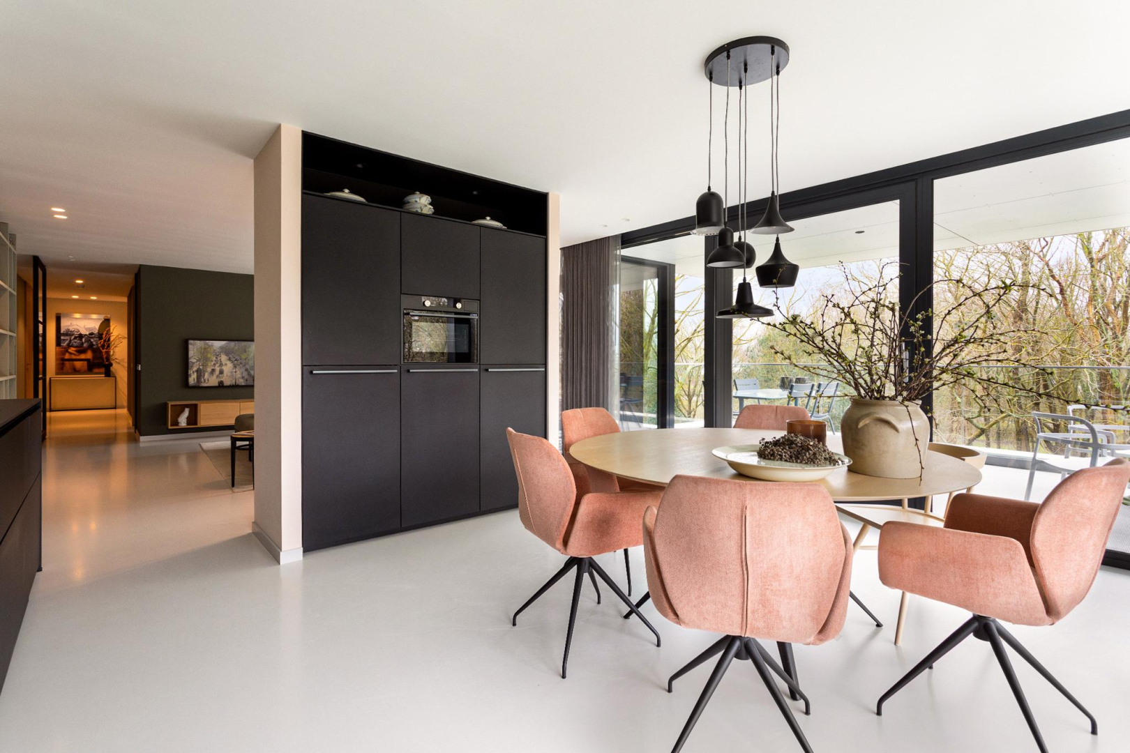 Vanuit de hal heeft u direct een mooie zichtlijn door de stalen taatsdeur van 120 cm breed (De Rooy) richting het terras en de prachtige groene omgeving en blauwe luchten. Het verlaagde plafond met Wever & Ducre inbouwspots en de verdiepingshoge ramen en schuifpui naar het terras geven een ruimtelijk effect, een optimale lichtinval èn zorgen ervoor dat binnen buiten wordt en buiten binnen. In de living is een comfortabel zitgedeelte met een fraai uitzicht over het park en een maatwerk vakken kast. De moderne gietvloer, het hoge afwerkingsniveau en de open ruimte, versterken de aangename sfeer van luxe en warmte.