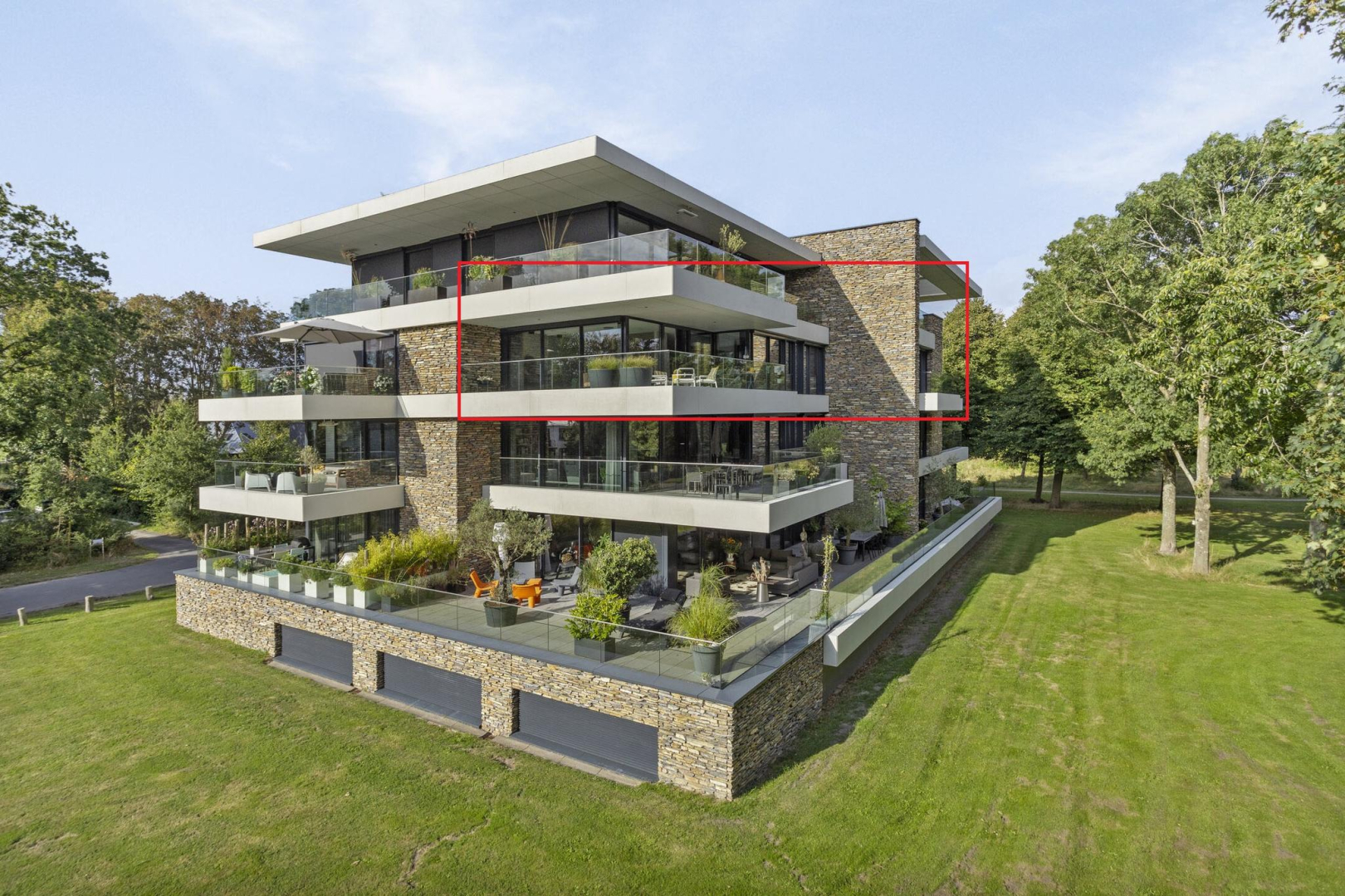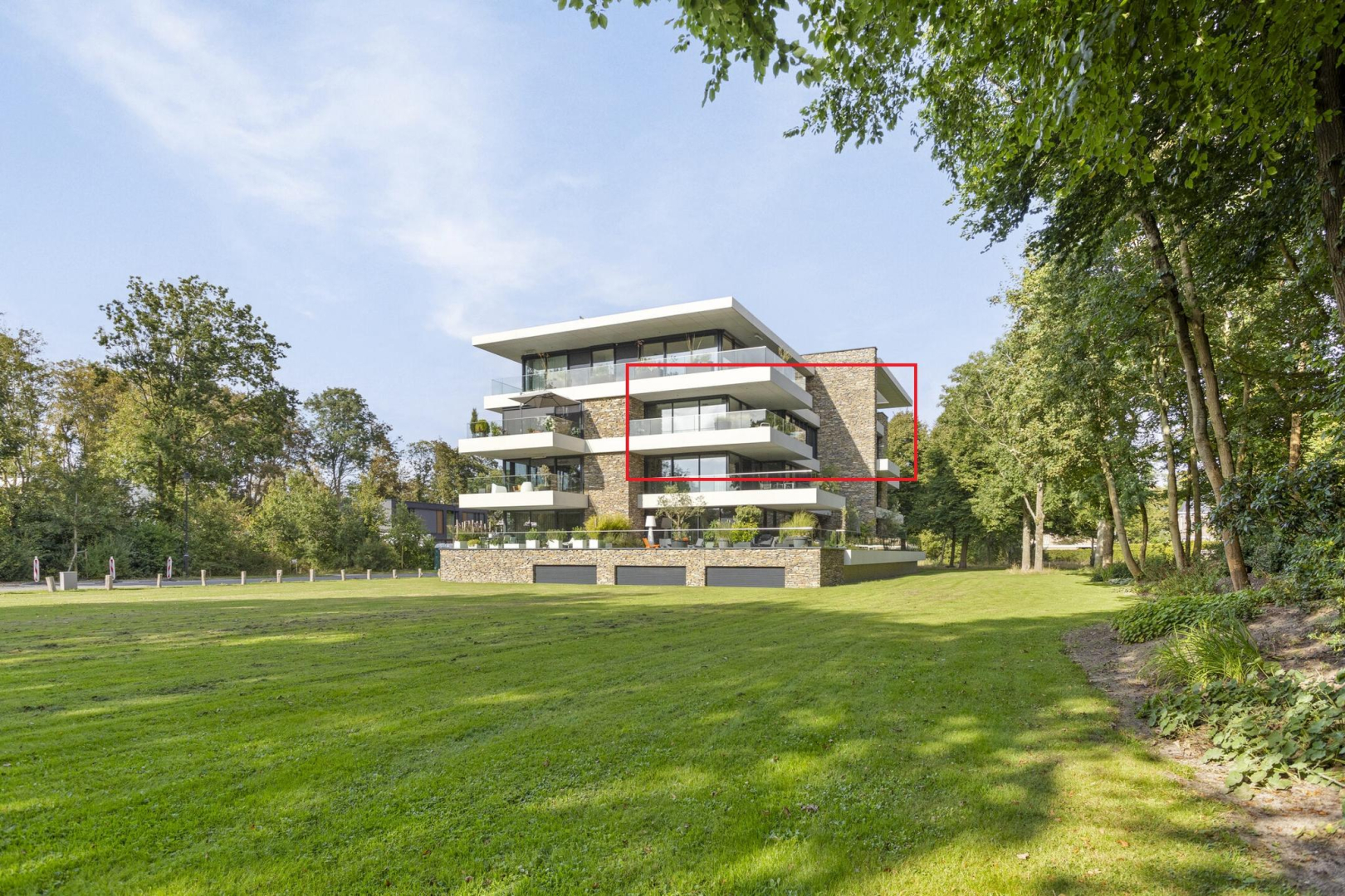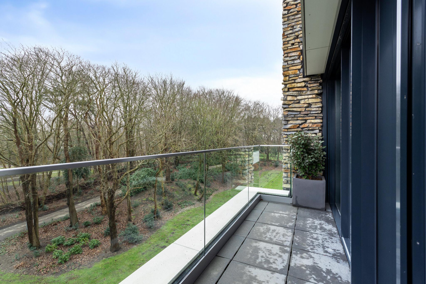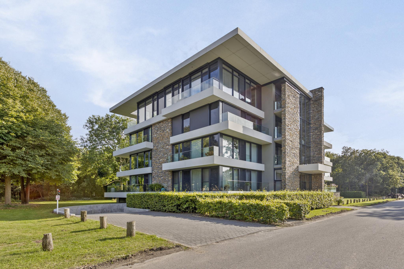 Het luxe woongebouw is van internationale allure met zijn natuurstenen gevels en beschikt over veel glas (triple), waardoor het appartement heerlijk licht is en het uitzicht op de omliggende natuur is adembenemend. Het fantastische terras is deels overkapt, waardoor u met alle weersomstandigheden hiervan kan genieten, zowel s ‘ochtends met een heerlijk kopje koffie als s ’avonds tijdens een gezellig diner met vrienden.