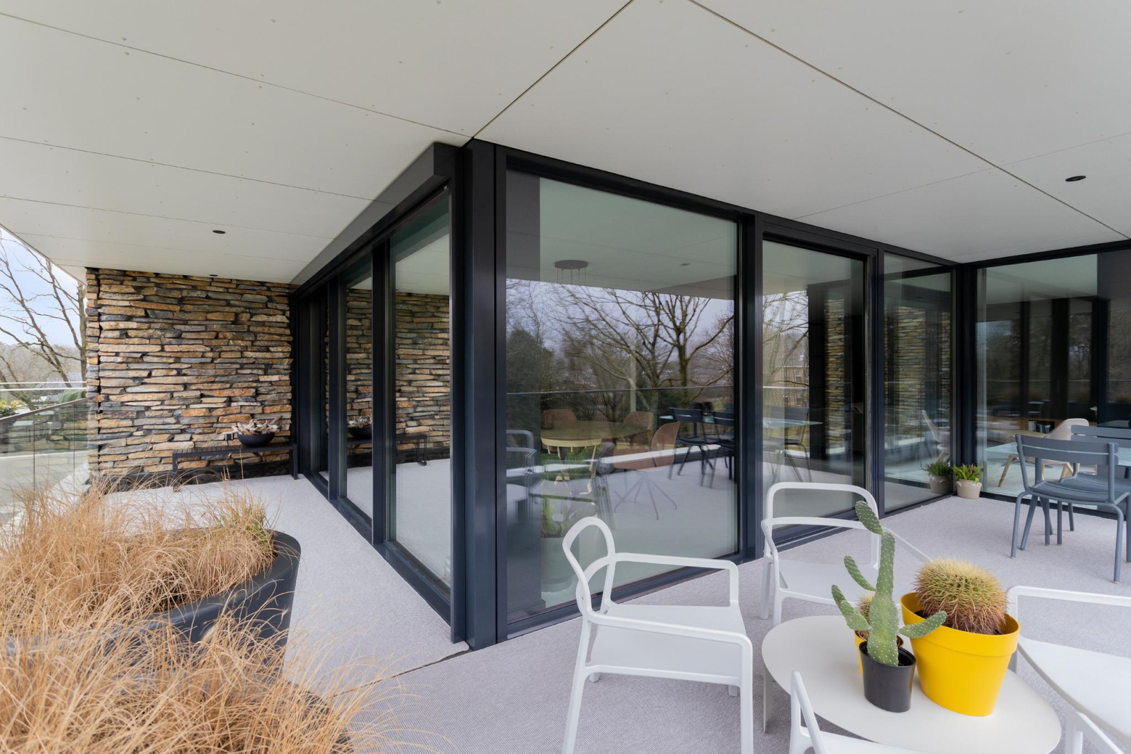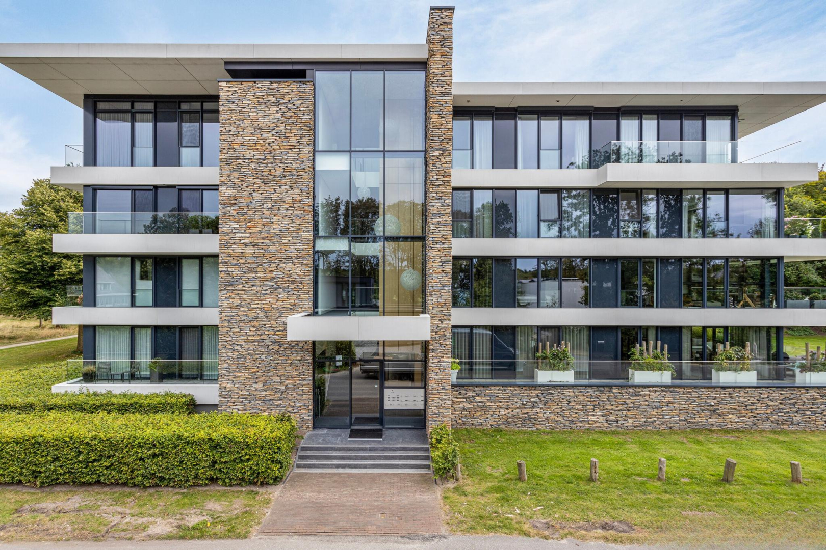 Complex van internationale allure met veel glas en natuurstenen gevels.
