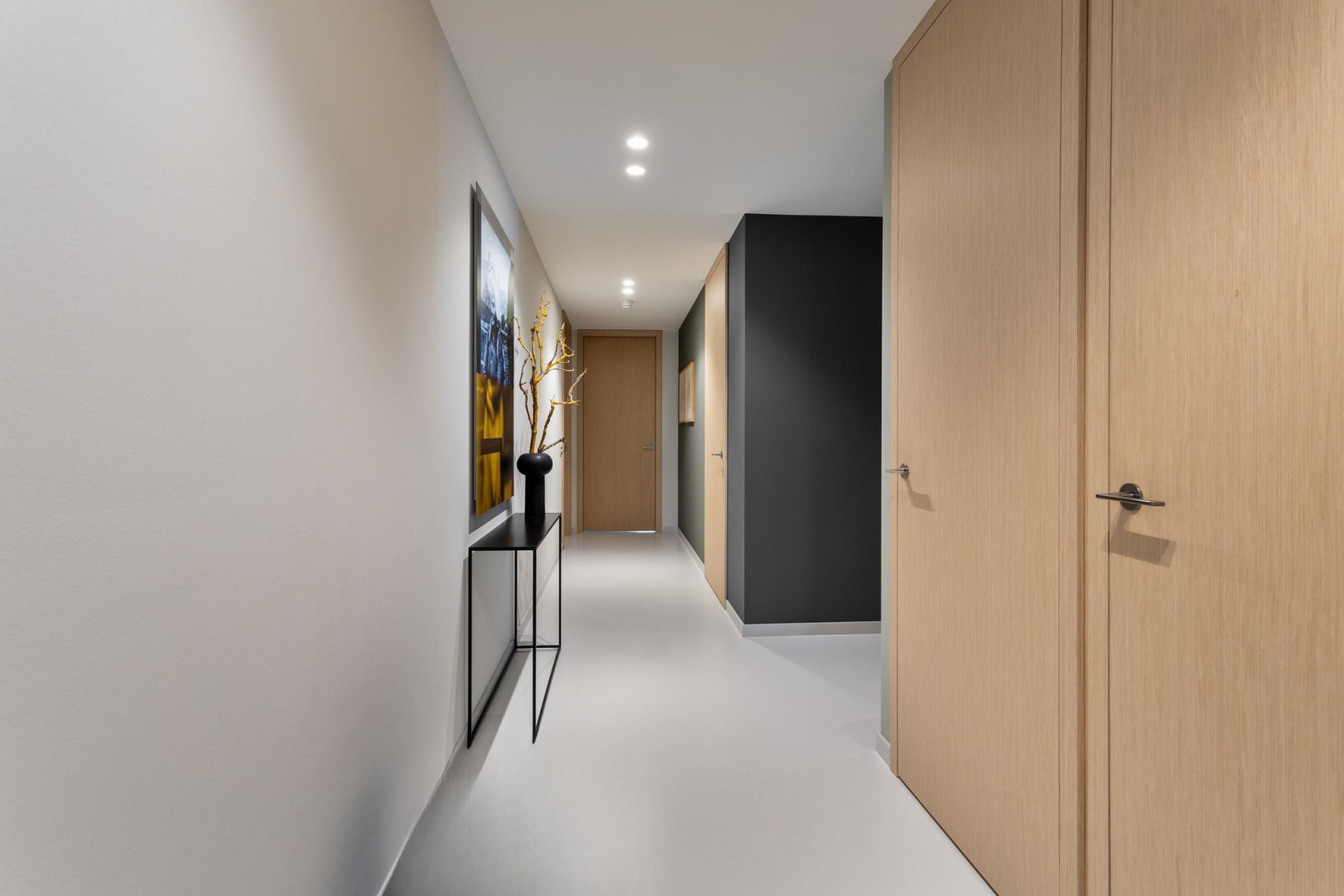 Glad gestuukte plafonds met inbouwspots.