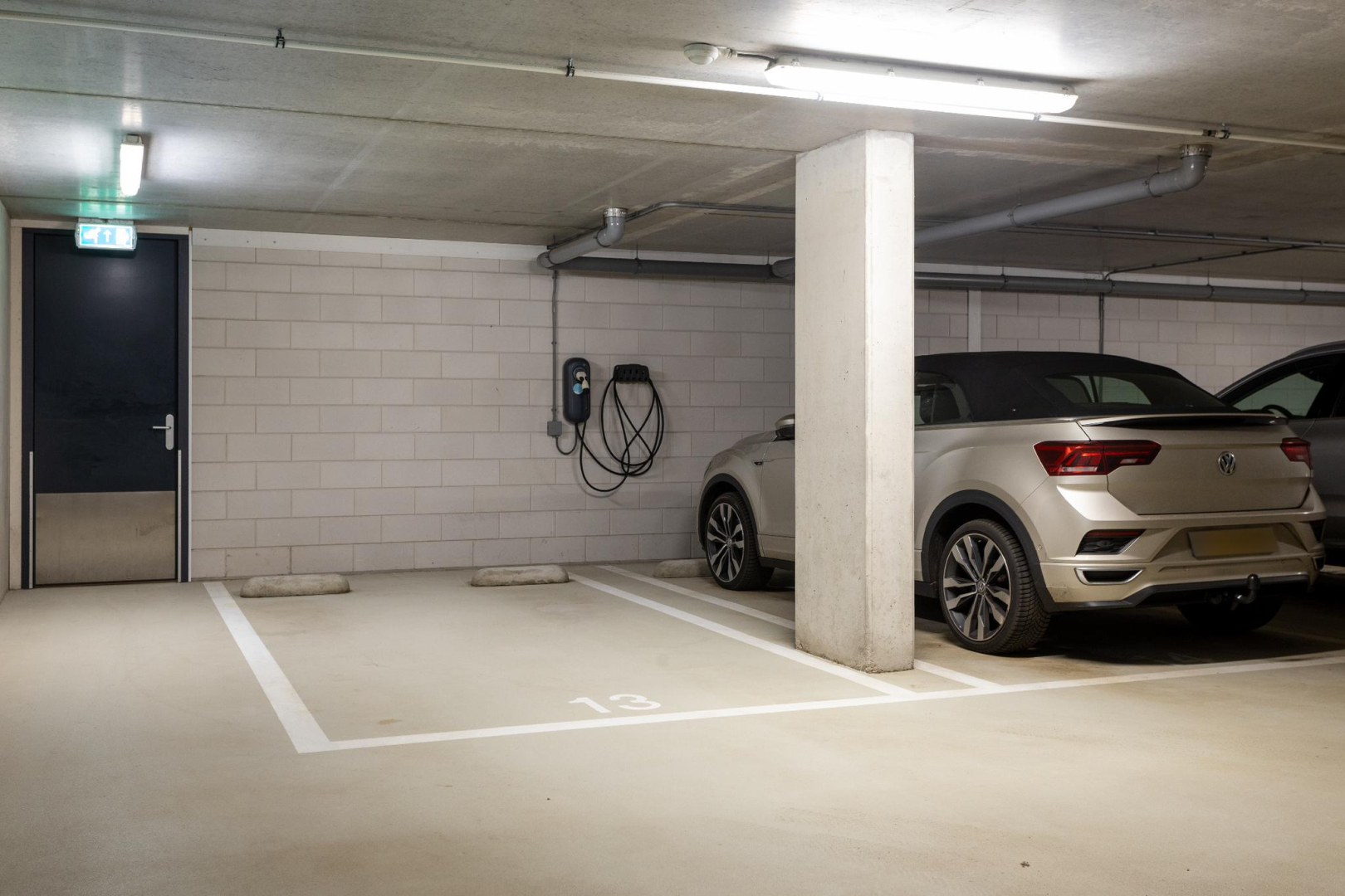Twee eigen ruime parkeerplaatsen in onderbouw met snellader laadpaal.