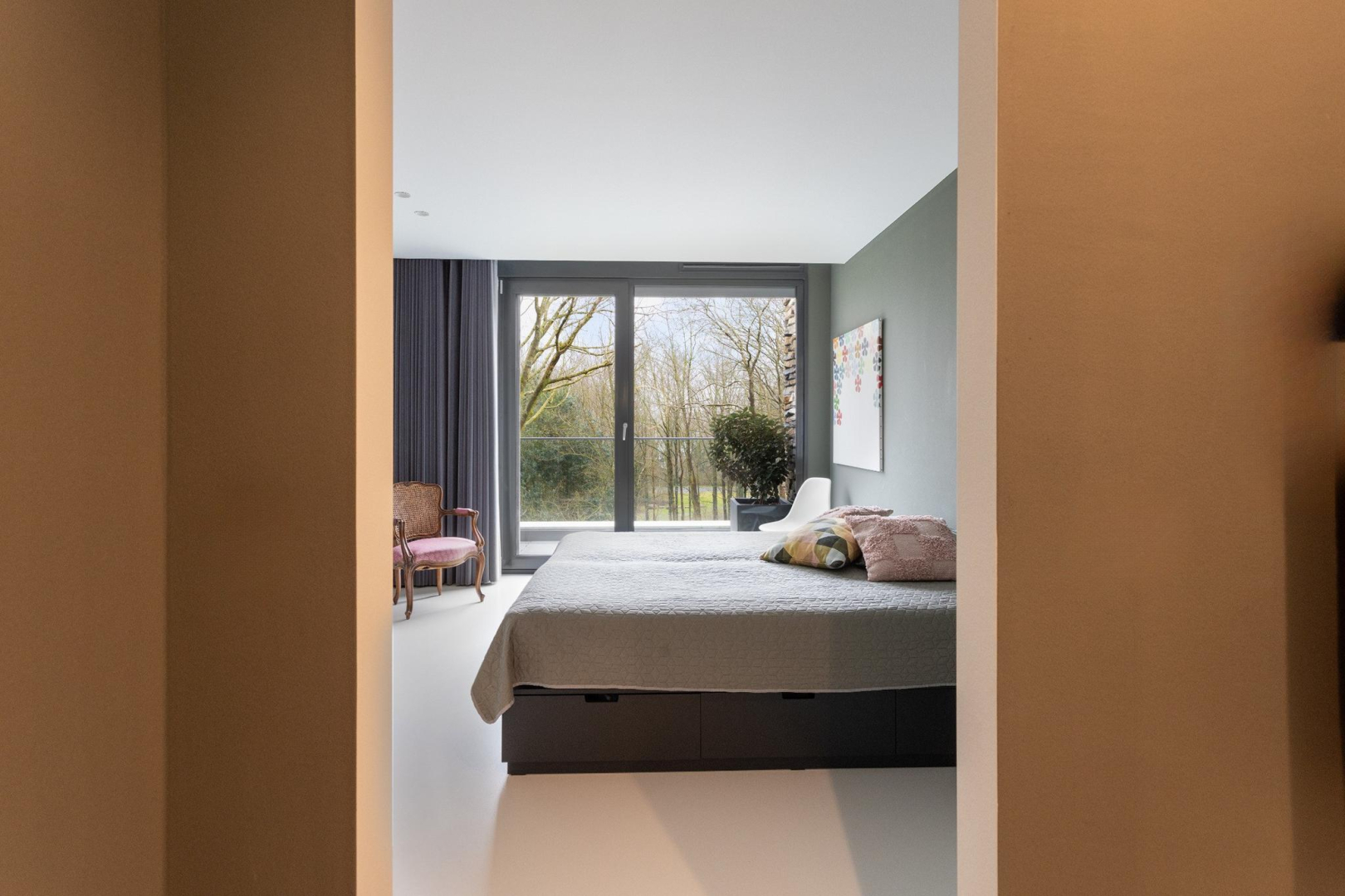 Er zijn drie royale slaapkamers, waarvan twee met aangrenzende badkamer uitgevoerd met Duravit ME by Starck sanitair. Alle slaapkamers hebben eveneens verdiepingshoge ramen met een draai-/kiepfunctie. U ontwaakt midden in de natuur! Ook de slaapkamers zijn voorzien van een gietvloer en verlaagd plafond met inbouw spots.