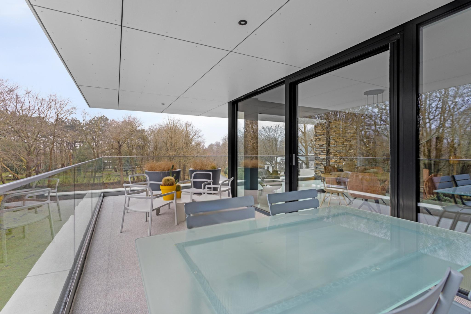 En door de zeldzaam grote raampartijen en balkonafscheidingen van glas, bent u zich steeds bewust van uw bevoorrechte positie midden in de natuur, op dit prachtige landgoed.