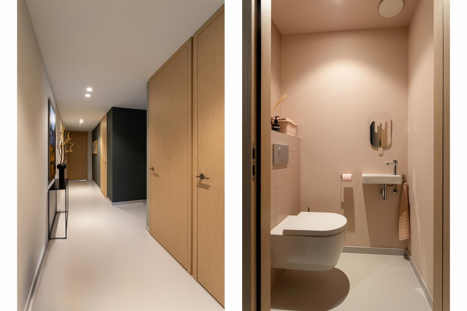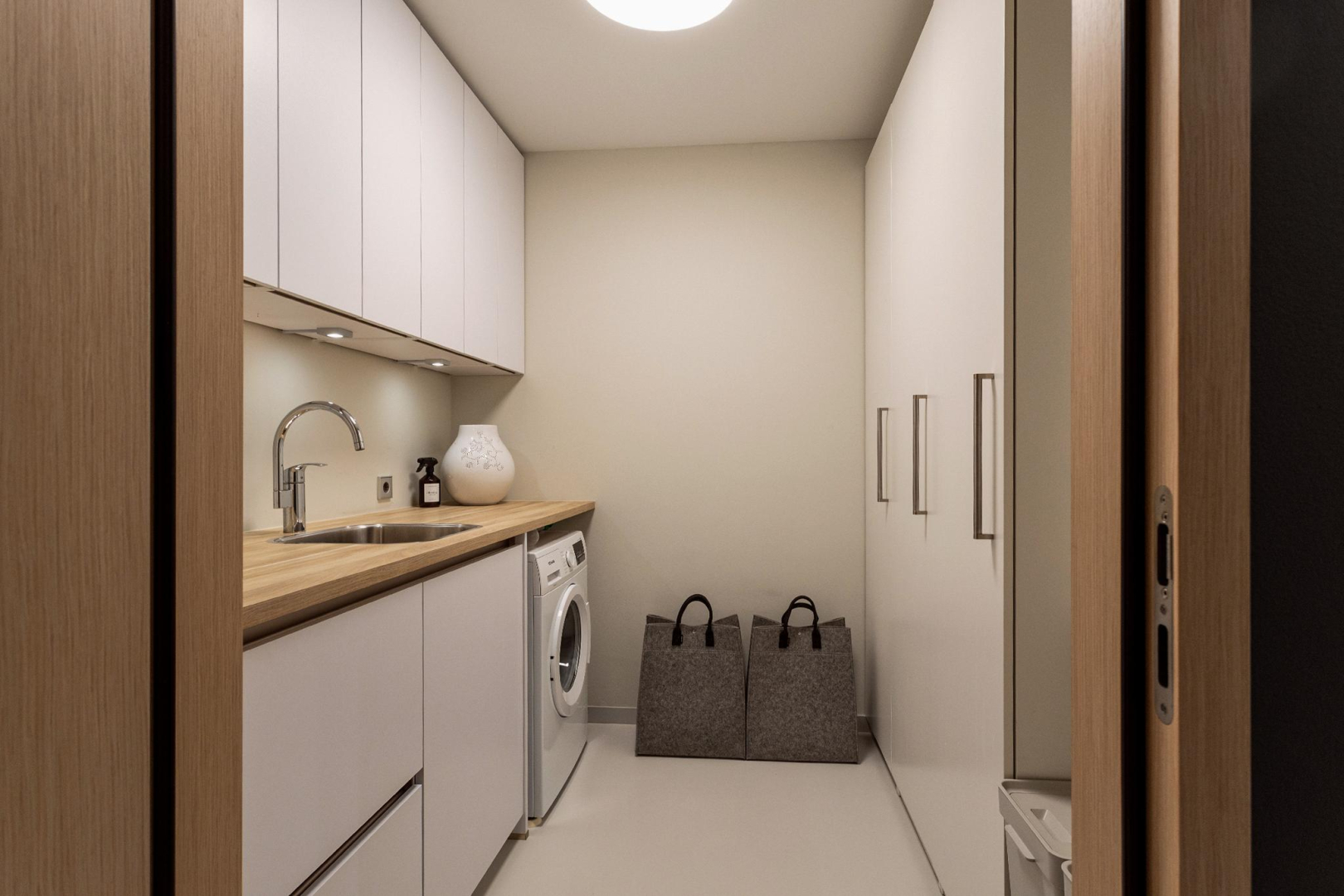 Binnenkomend valt uw blik direct op de luxe eiken fineer Bodor Cube kozijnen en deuren met magneetsluiting, blinde scharnieren en Olivari deurbeslag. De hal heeft een aparte schoenenkast en ruime garderobekast waarin tevens de opstelplaats van de cv ketel, omvormer zonnepanelen en het mechanisch ventilatiesysteem zijn gesitueerd. Tevens bevindt zich hier een grote, praktische bijkeuken/waskamer met veel bergruimte, een aanrecht met spoelbak met warm en koud water en de opstelplaats van de wasapparatuur. Apart toilet met wandcloset en fontein.