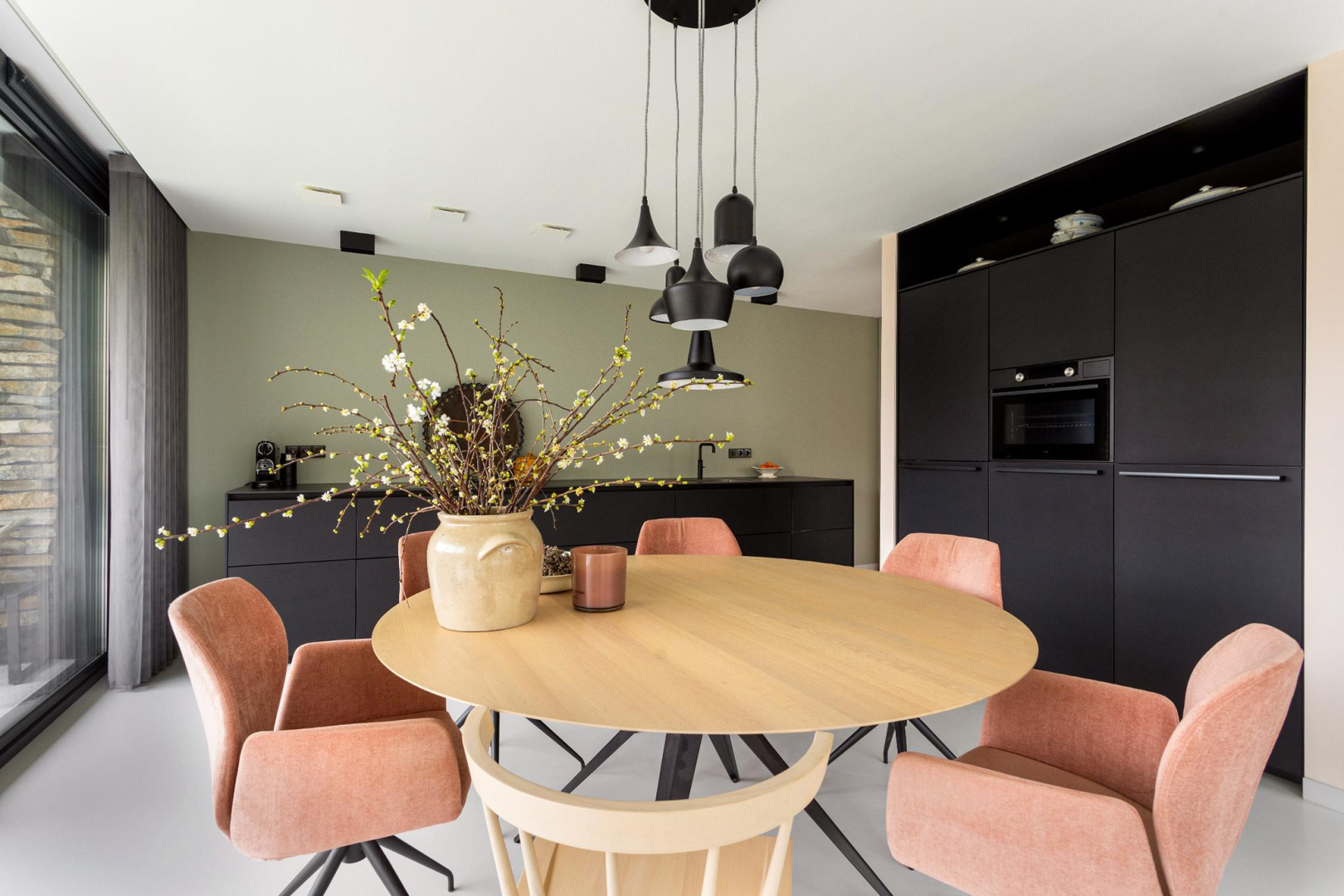 Luxe keuken met kastenwand en hoogwaardige apparatuur.
