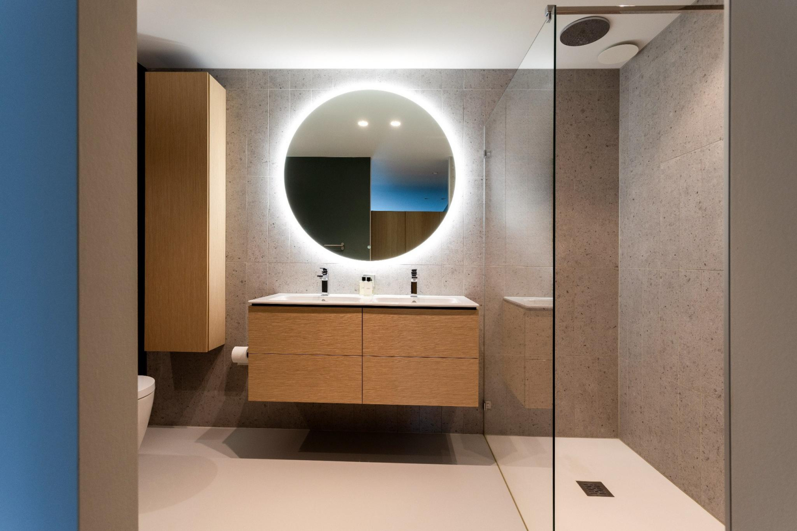 De master bedroom heeft een aangrenzende badkamer met grote inloopdouche met composiet douchevloer, plafond regendouche, en luxe Hans Grohe kranen. Verder is er een luxe dubbele wastafelmeubel, verwarmde ronde spiegel, wandcloset en bidet. De tweede slaapkamer is ook voorzien van een aangrenzende badkamer met luxe douche, verwarmde spiegel en luxe wastafelmeubel. Vanuit de master bedroom en de 2e slaapkamer is het aangesloten balkon bereikbaar. Derde slaapkamer met Frans balkon.