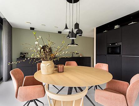 De keuken wordt gescheiden van de living door de ingebouwde kastenwand met (stoom) oven, extra grote koelkast, vrieskast en veel bergruimte. In de tegen de wand geplaatste extra diepe (75 cm) keuken opstelling zijn veel praktische lades, een inductie kookplaat met down draft afzuigsysteem, Quooker, vaatwasser en een kerlite aanrechtblad. Tevens bevindt zich hier een extra kraan om buiten makkelijk de planten water te geven. In de leefkeuken is meer dan voldoende ruimte voor een royale eettafel. Vanuit dit gedeelte is er een schuifpui naar het fijne terras met ook daar de mogelijkheid voor een royale tafel, waar u op mooie zomerse avonden heerlijk met vrienden lang en comfortabel kunt natafelen.
