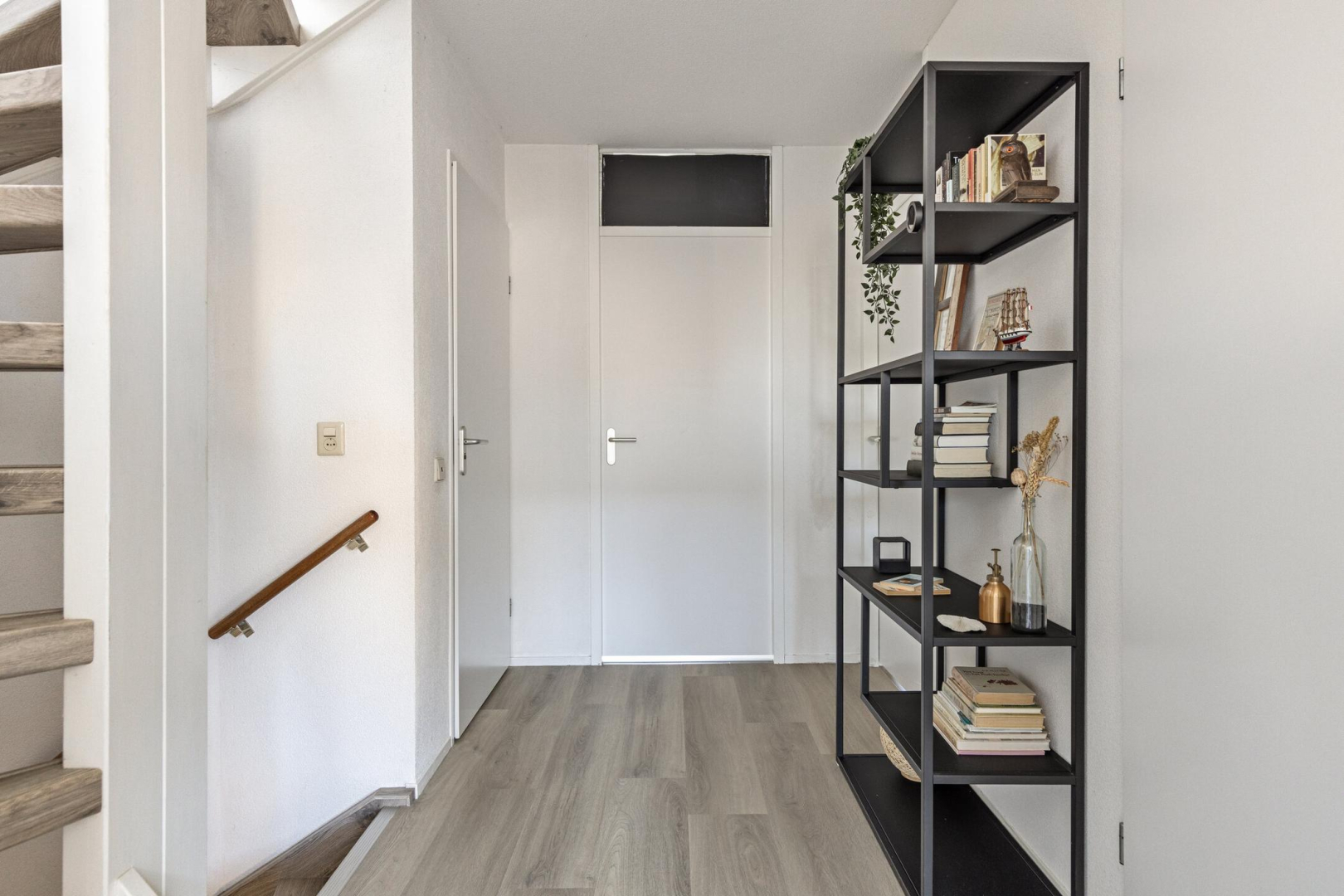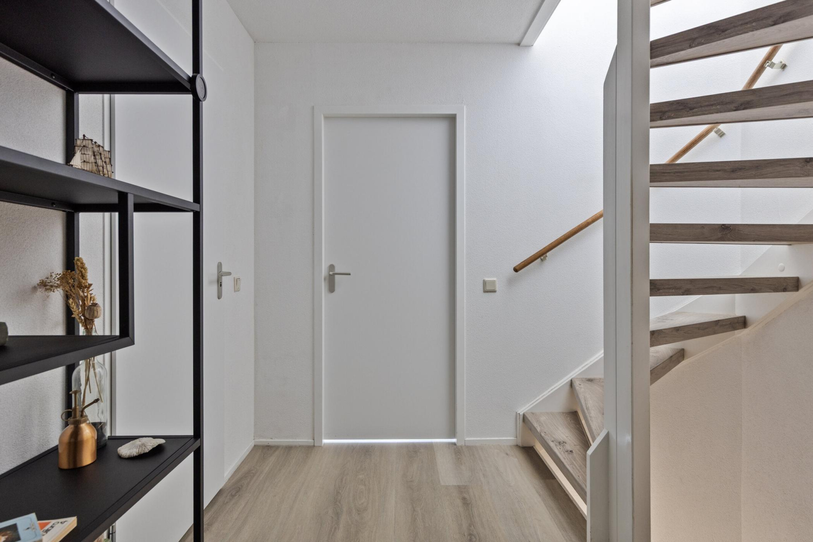 Via de entree kom je binnen in de ruime hal met garderobe, meterkast, een separaat toilet en de trapopgang naar de eerste verdieping. Vanuit de hal bereikt je de royale en lichte woonkamer, die dankzij de grote raampartijen een prettige lichtinval heeft en een fraai uitzicht biedt op het water. De woonkamer biedt volop ruimte voor een comfortabele zithoek en een grote eettafel en staat in open verbinding met de keuken, wat zorgt voor een ruimtelijk en gezellig geheel. Via de schuifpui in de woonkamer loop je zo de zonnige achtertuin aan het water in, waardoor binnen en buiten op een natuurlijke manier in elkaar overlopen. De keuken is uitgevoerd in een praktische L-opstelling en voorzien van een composiet werkblad, een Siemens vaatwasser, een dubbele spoelbak en een inductiekookplaat. Daarnaast beschikt de keuken over voldoende werk- en bergruimte. Aangrenzend bevindt zich de bijkeuken, ideaal voor extra opslag, met directe toegang tot de garage. De hal, woonkamer, keuken en het toilet zijn voorzien van vloerverwarming.