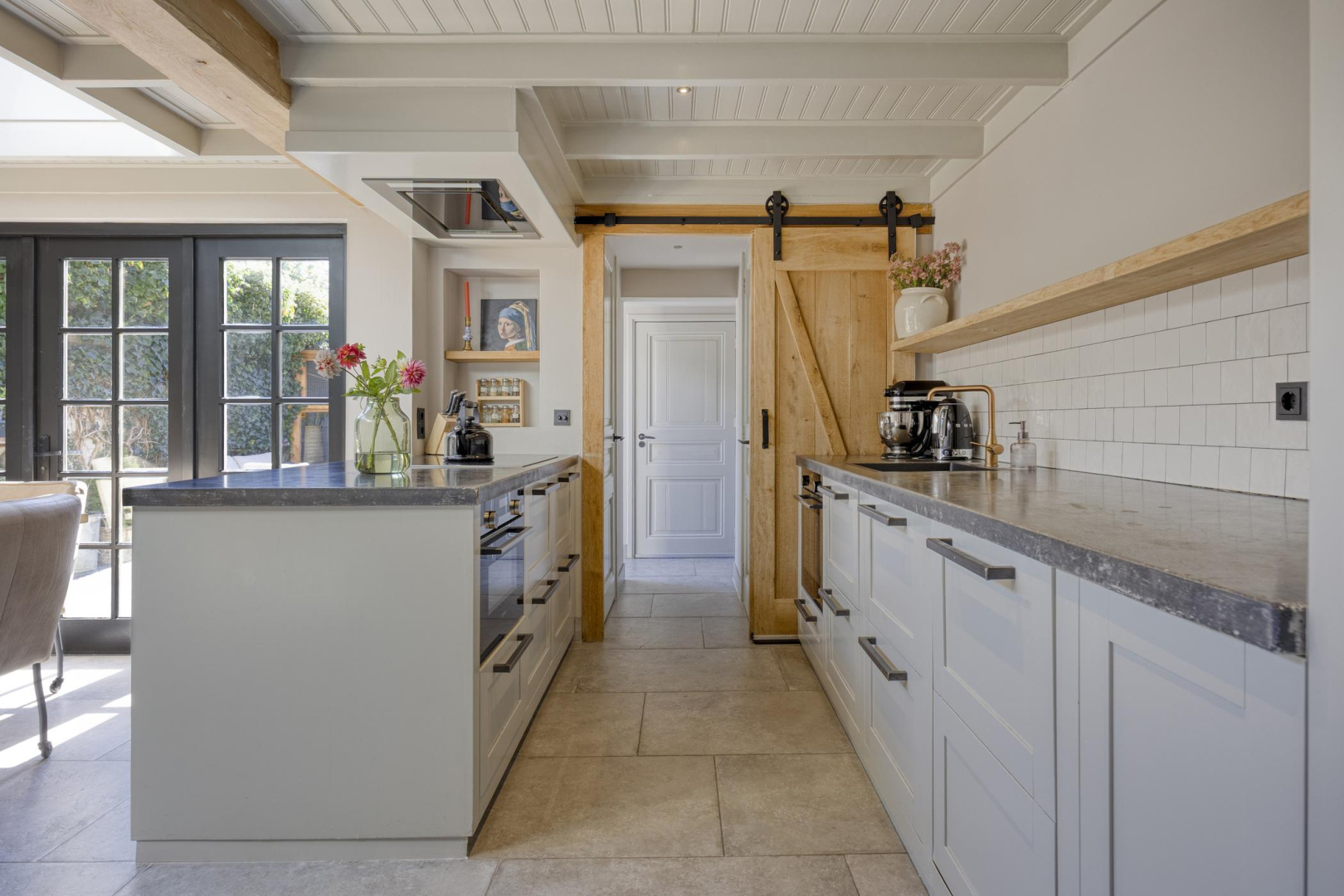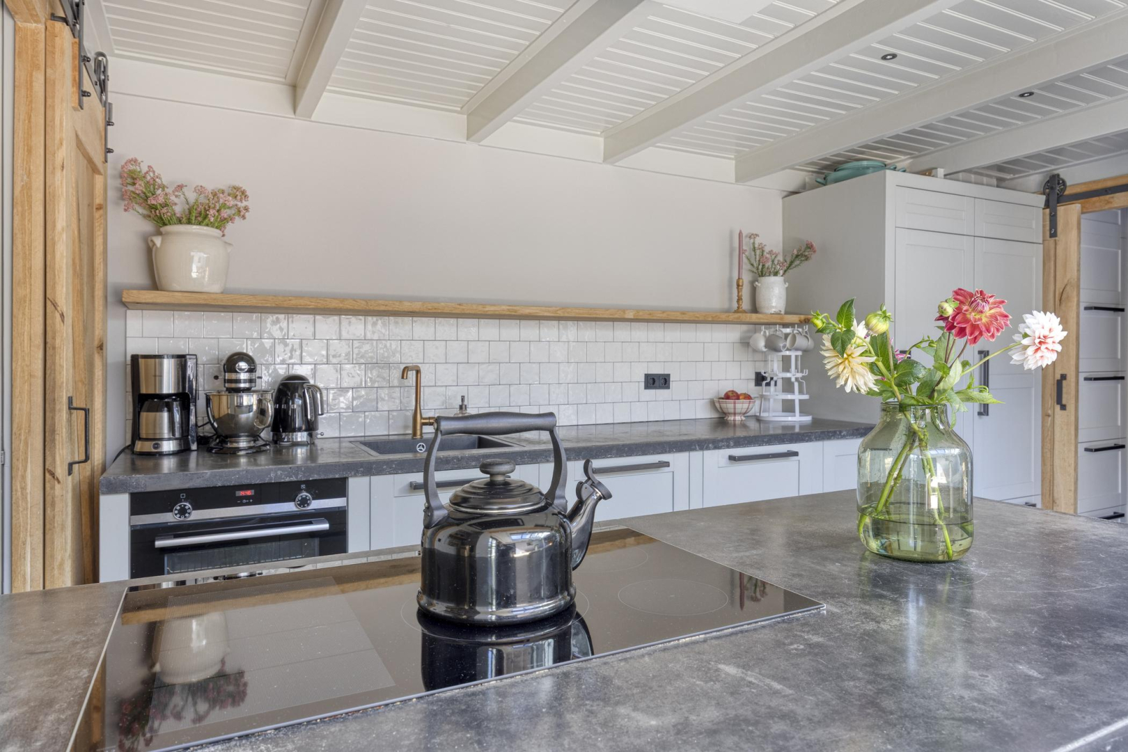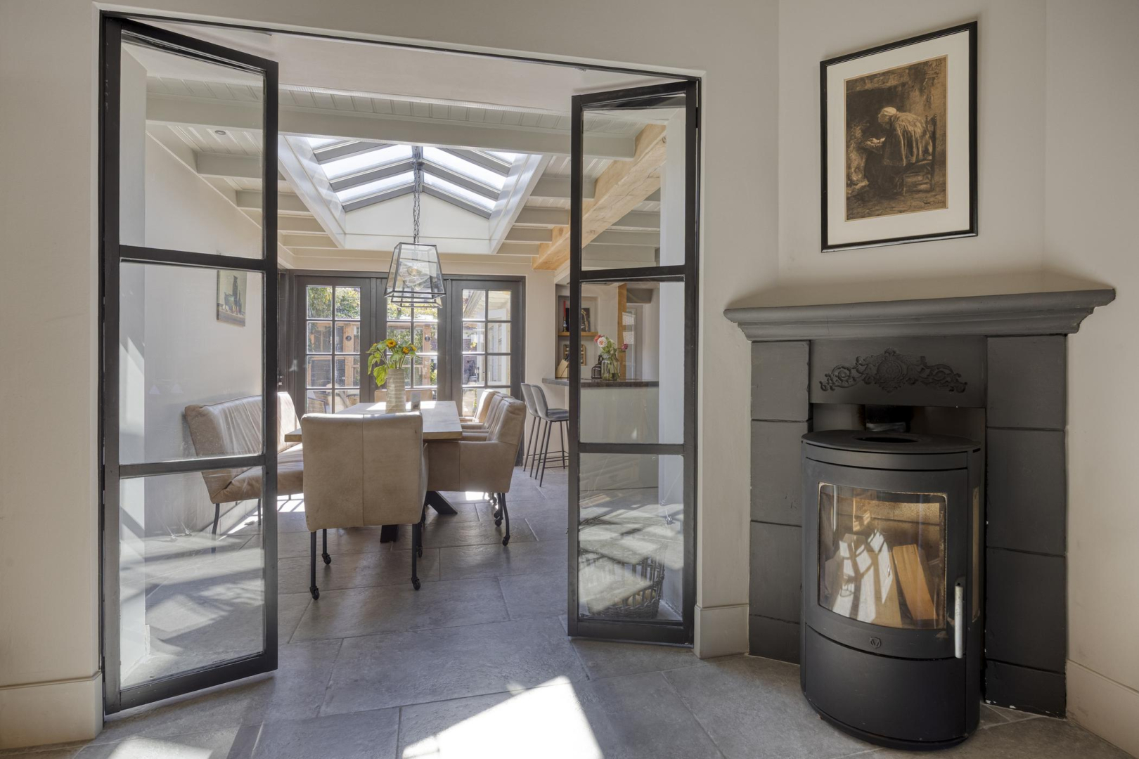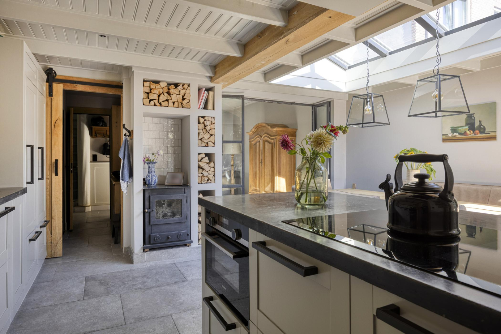 Via de entree komt u in de hal, met garderobe en de toiletruimte met wandcloset en fontein. Vanuit de hal is er toegang tot de woonkamer. De gezellige woonkamer straalt warmte uit met haar sfeervolle houtkachel en prachtige plavuizenvloer met vloerverwarming. De paneel- en schuifdeuren naar de woonkeuken zorgen voor een naadloze verbinding tussen de verschillende ruimtes. De woonkeuken is een echte eyecatcher: een ruim kook (schier)eiland met betonnen aanrechtblad, inductiekookplaat met (in het plafond verwerkt) afzuigsysteem, een combimagnetron. Daarnaast is er een rechte opstelling met nog meer werkblad, een oven, vaatwasser, koelkast en vriezer. De lichtstraat zorgt voor een natuurlijke lichtinval en de houtkachel maakt het geheel extra sfeervol. Via openslaande deuren is er toegang tot de tuin. Op de begane grond bevindt zich tevens een moderne badkamer met inloopdouche en stoer wastafelmeubel. Via de keuken bereikt u de bijkeuken. De bijkeuken is voorzien van prachtige inbouwkast als garderobe en een inloop was/stook ruimte met aansluiting wasapparatuur en opstelling CV-combiketel. Aansluitend vindt u een apart verblijf met eigen keuken, toilet en douche, vaste kast en trap naar de verdieping – ideaal als gastenverblijf, mantelzorgwoning of werkruimte.