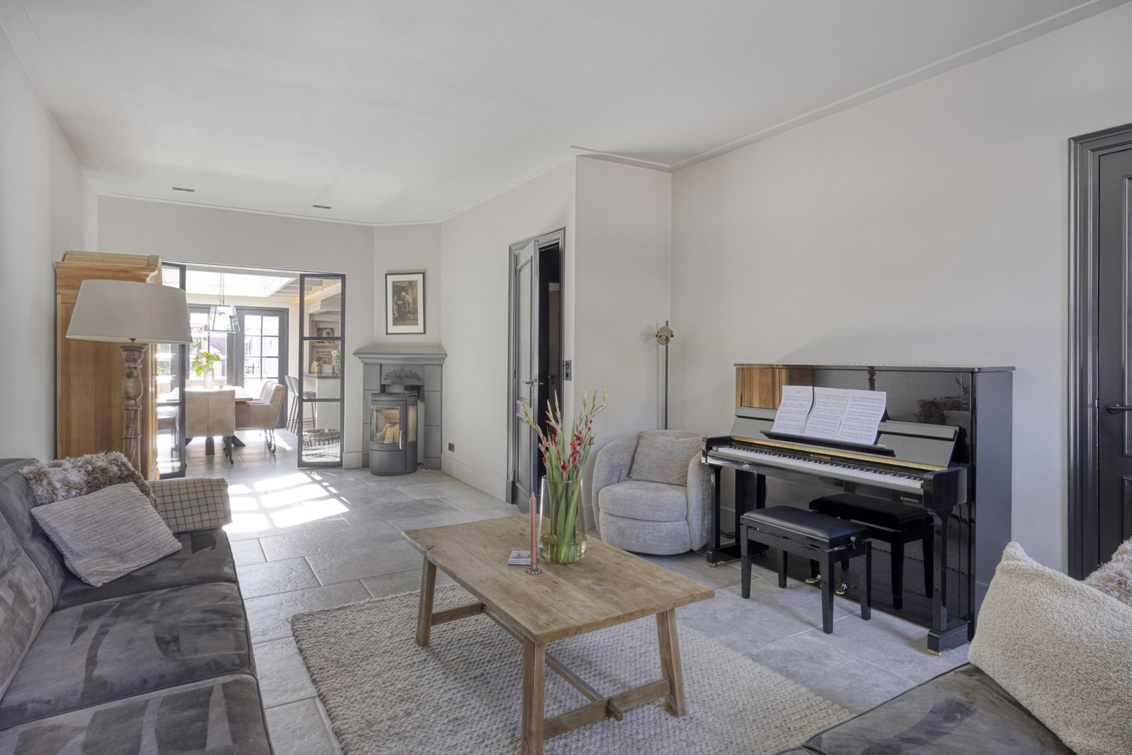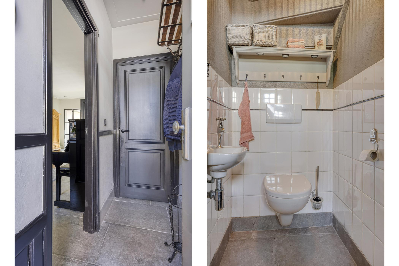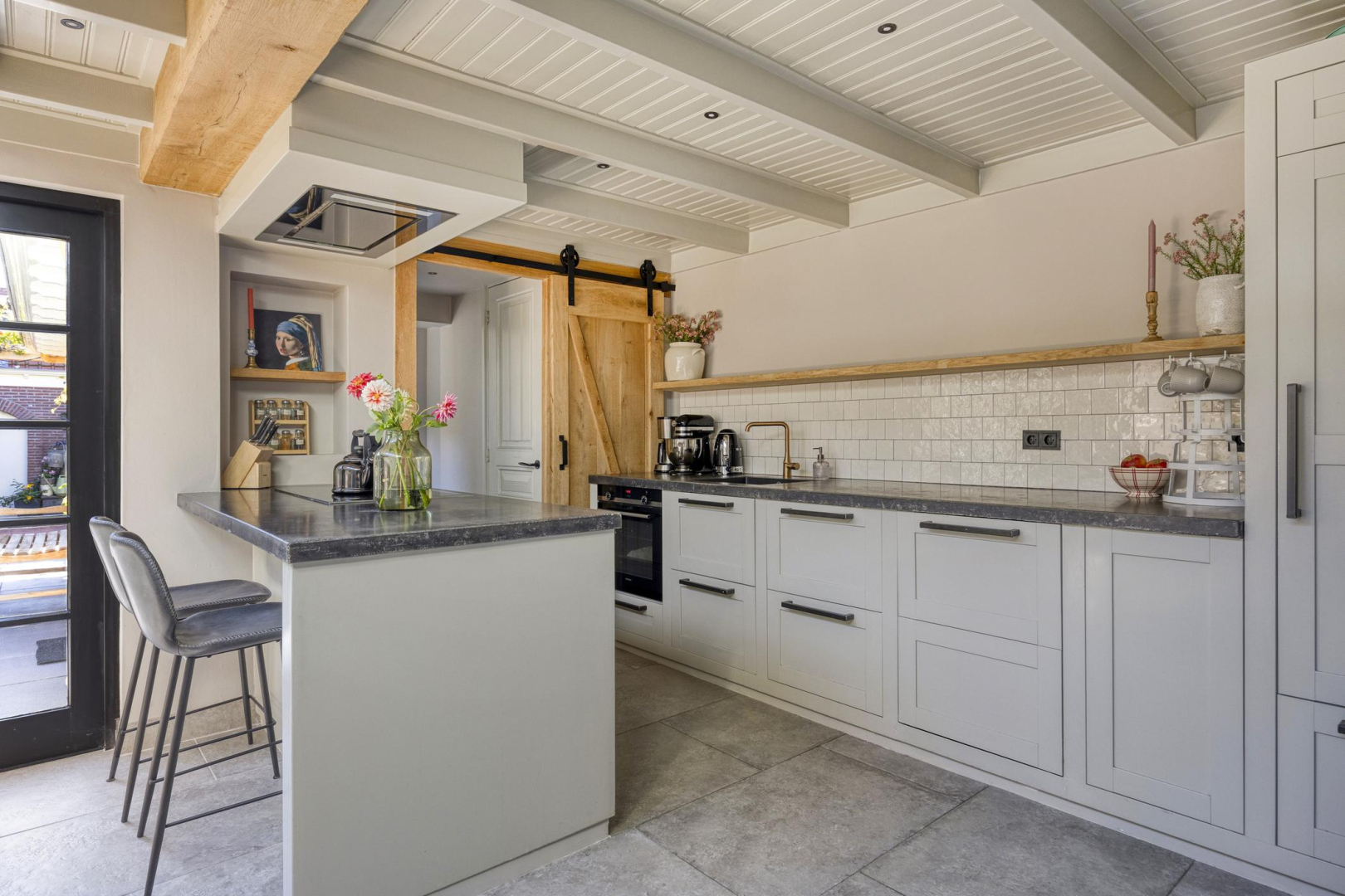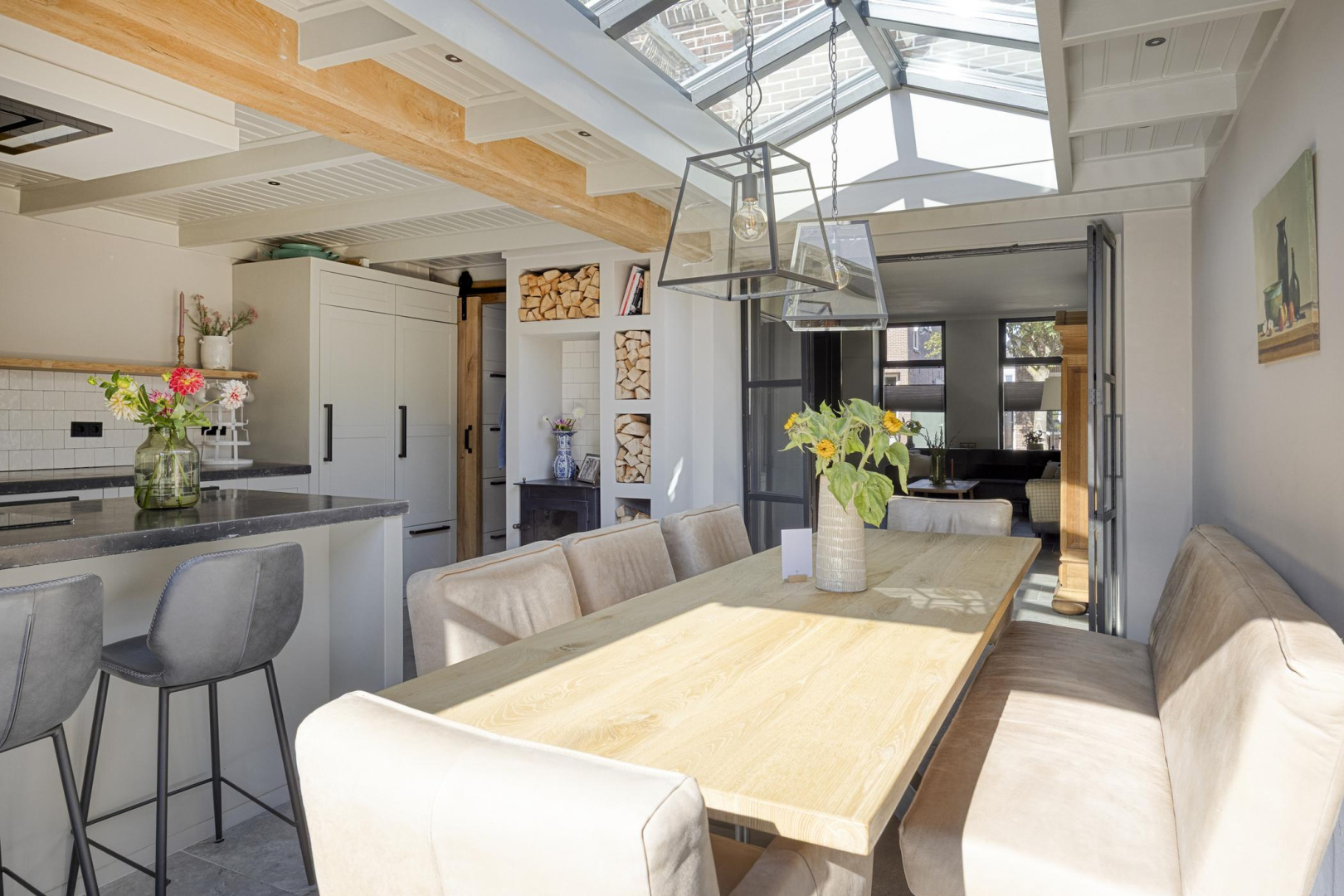 Via de entree komt u in de hal, met garderobe en de toiletruimte met wandcloset en fontein. Vanuit de hal is er toegang tot de woonkamer. De gezellige woonkamer straalt warmte uit met haar sfeervolle houtkachel en prachtige plavuizenvloer met vloerverwarming. De paneel- en schuifdeuren naar de woonkeuken zorgen voor een naadloze verbinding tussen de verschillende ruimtes. De woonkeuken is een echte eyecatcher: een ruim kook (schier)eiland met betonnen aanrechtblad, inductiekookplaat met (in het plafond verwerkt) afzuigsysteem, een combimagnetron. Daarnaast is er een rechte opstelling met nog meer werkblad, een oven, vaatwasser, koelkast en vriezer. De lichtstraat zorgt voor een natuurlijke lichtinval en de houtkachel maakt het geheel extra sfeervol. Via openslaande deuren is er toegang tot de tuin. Op de begane grond bevindt zich tevens een moderne badkamer met inloopdouche en stoer wastafelmeubel. Via de keuken bereikt u de bijkeuken. De bijkeuken is voorzien van prachtige inbouwkast als garderobe en een inloop was/stook ruimte met aansluiting wasapparatuur en opstelling CV-combiketel. Aansluitend vindt u een apart verblijf met eigen keuken, toilet en douche, vaste kast en trap naar de verdieping – ideaal als gastenverblijf, mantelzorgwoning of werkruimte.