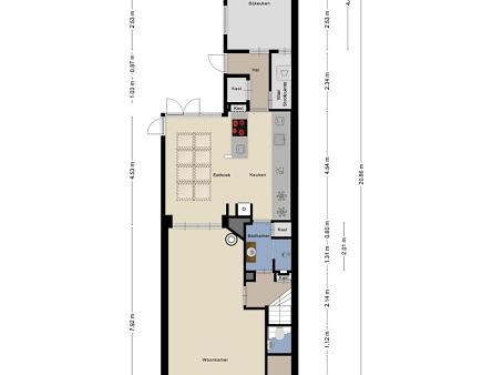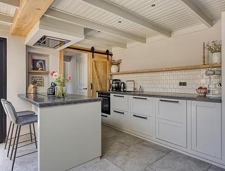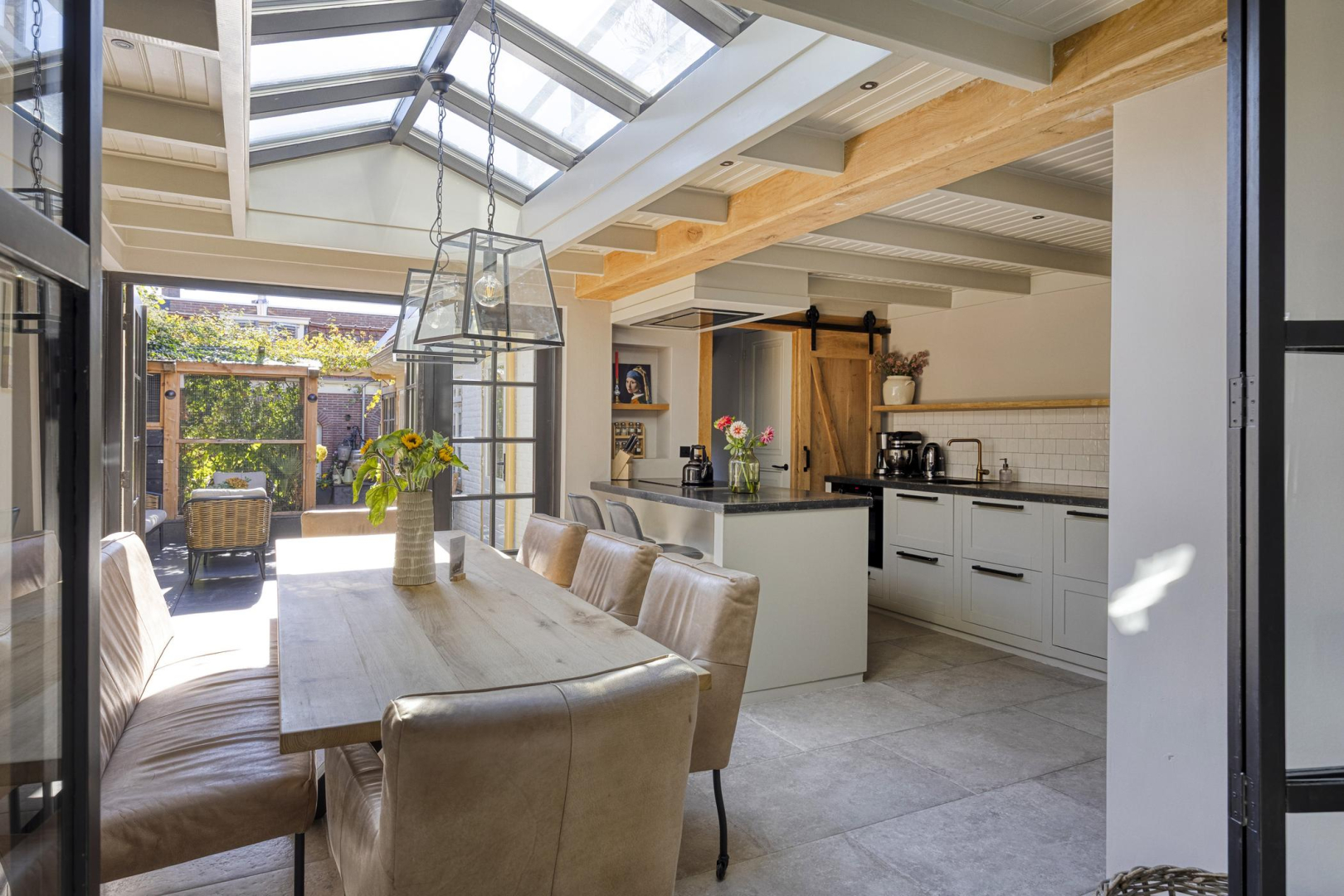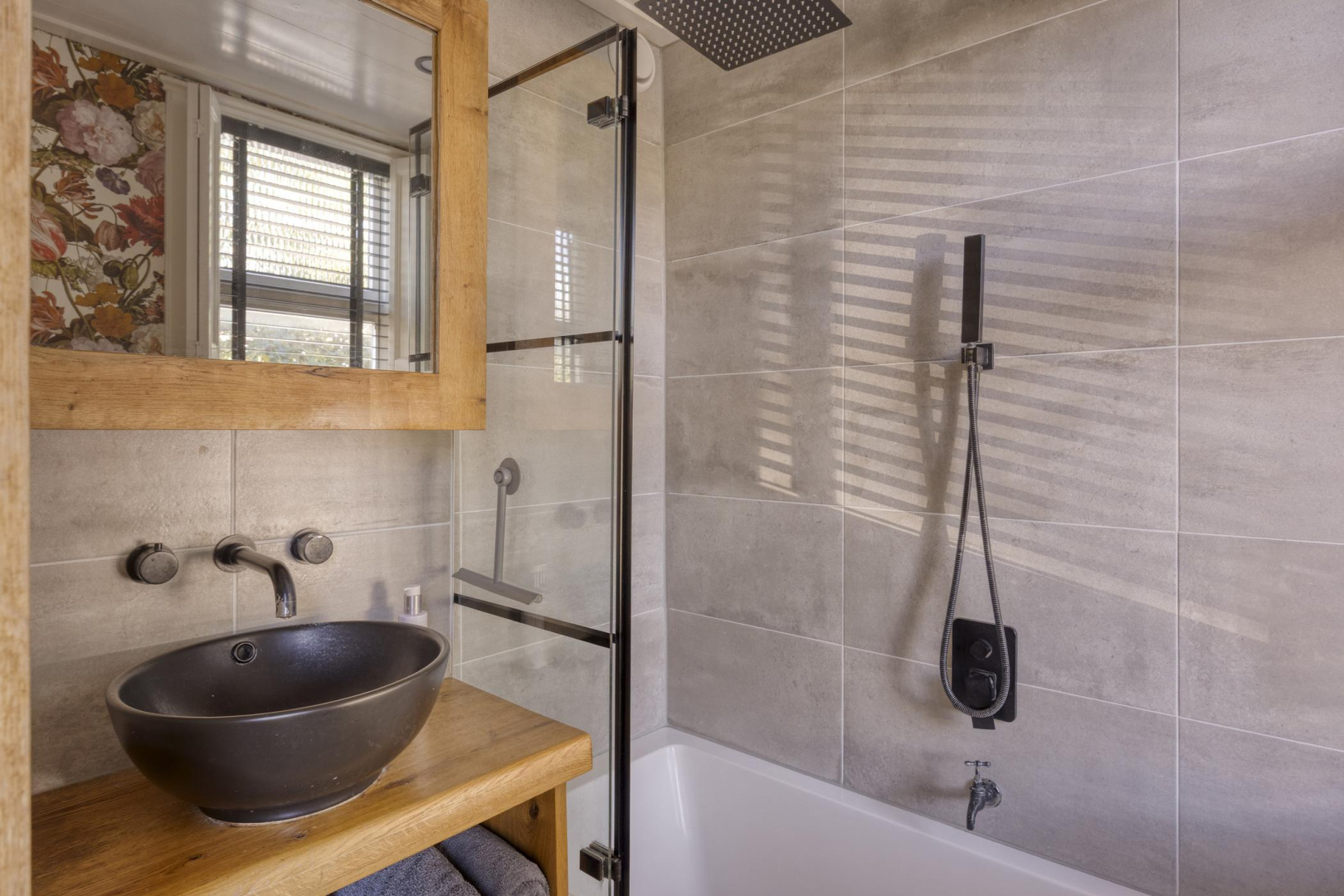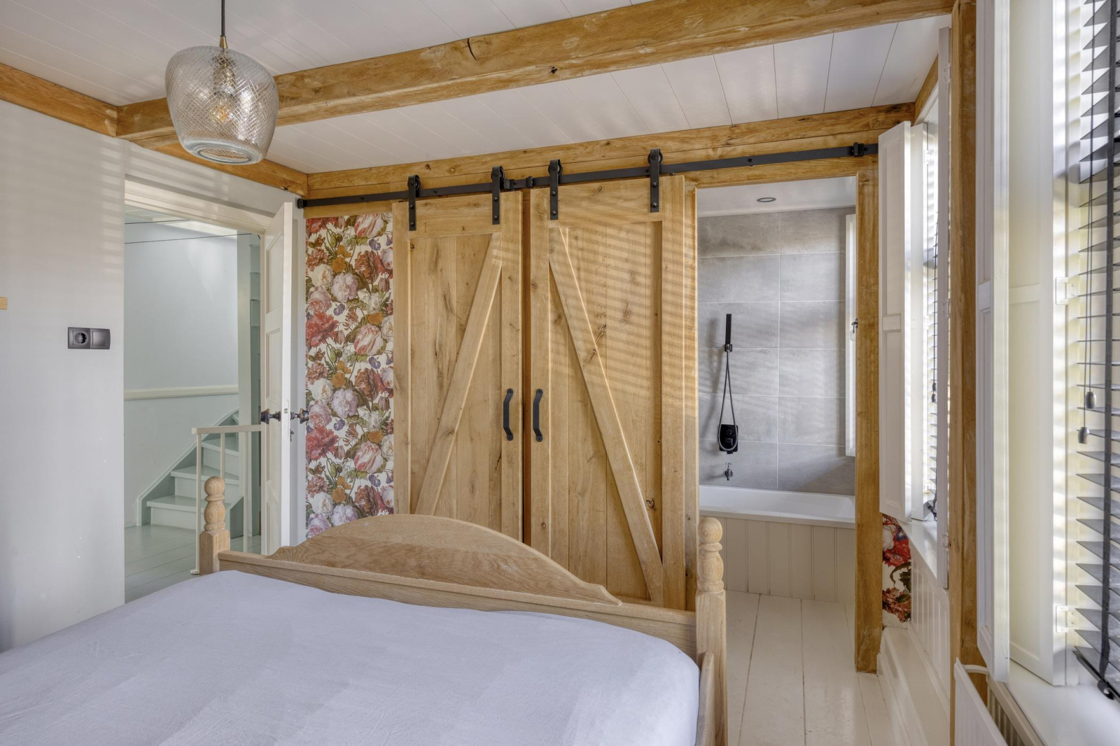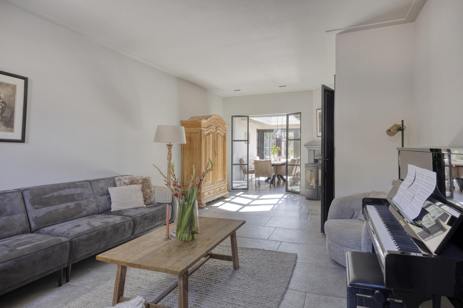 Via de entree komt u in de hal, met garderobe en de toiletruimte met wandcloset en fontein. Vanuit de hal is er toegang tot de woonkamer. De gezellige woonkamer straalt warmte uit met haar sfeervolle houtkachel en prachtige plavuizenvloer met vloerverwarming. De paneel- en schuifdeuren naar de woonkeuken zorgen voor een naadloze verbinding tussen de verschillende ruimtes. De woonkeuken is een echte eyecatcher: een ruim kook (schier)eiland met betonnen aanrechtblad, inductiekookplaat met (in het plafond verwerkt) afzuigsysteem, een combimagnetron. Daarnaast is er een rechte opstelling met nog meer werkblad, een oven, vaatwasser, koelkast en vriezer. De lichtstraat zorgt voor een natuurlijke lichtinval en de houtkachel maakt het geheel extra sfeervol. Via openslaande deuren is er toegang tot de tuin. Op de begane grond bevindt zich tevens een moderne badkamer met inloopdouche en stoer wastafelmeubel. Via de keuken bereikt u de bijkeuken. De bijkeuken is voorzien van prachtige inbouwkast als garderobe en een inloop was/stook ruimte met aansluiting wasapparatuur en opstelling CV-combiketel. Aansluitend vindt u een apart verblijf met eigen keuken, toilet en douche, vaste kast en trap naar de verdieping – ideaal als gastenverblijf, mantelzorgwoning of werkruimte.