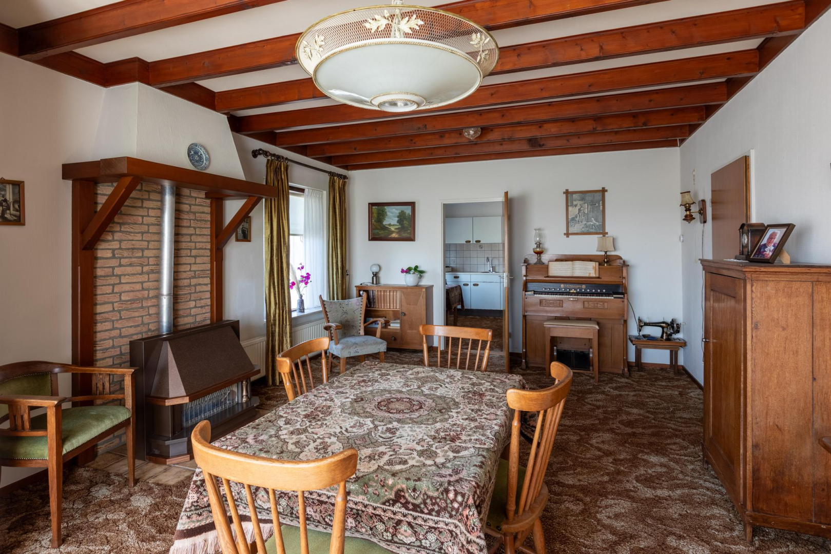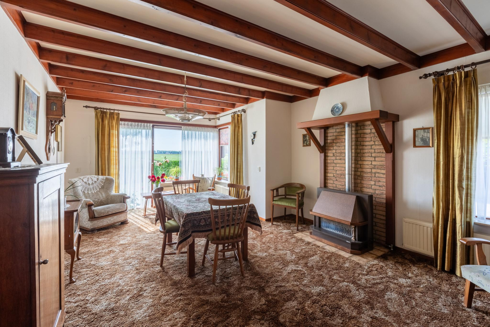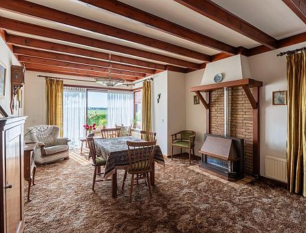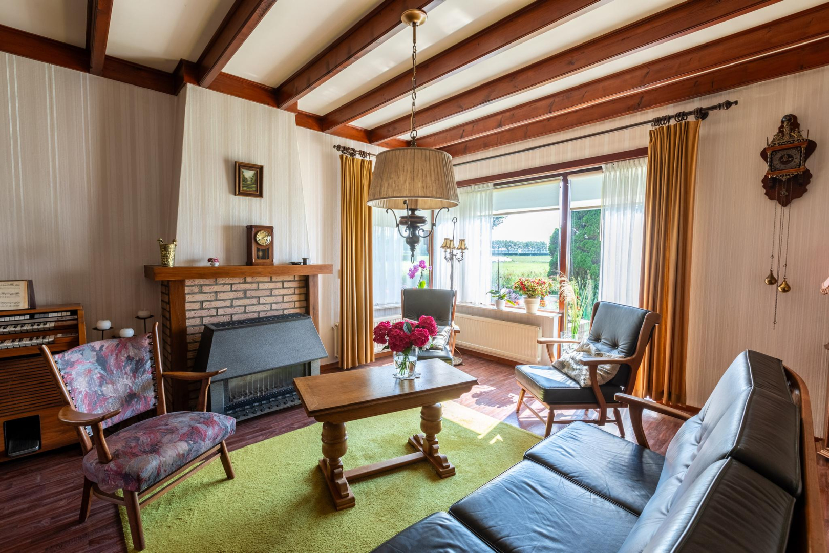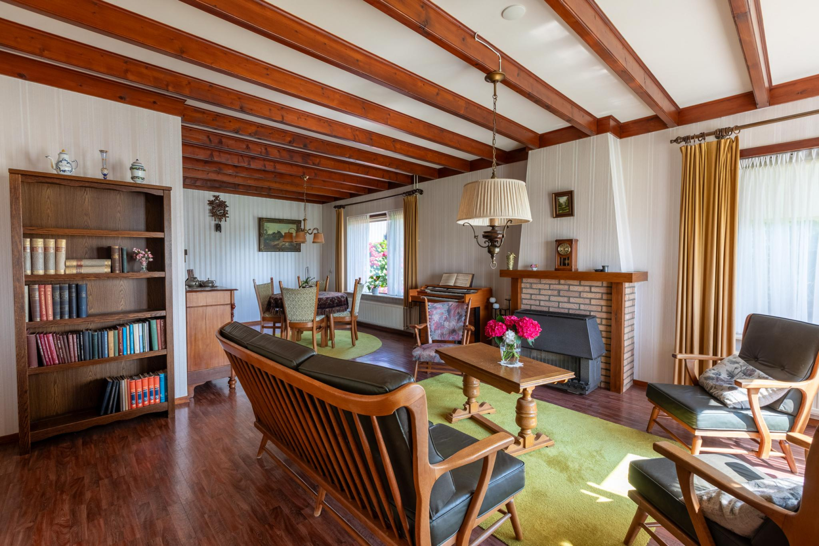 Ruime lichte woonkamer met sfeervolle gashaard en balkenplafond.