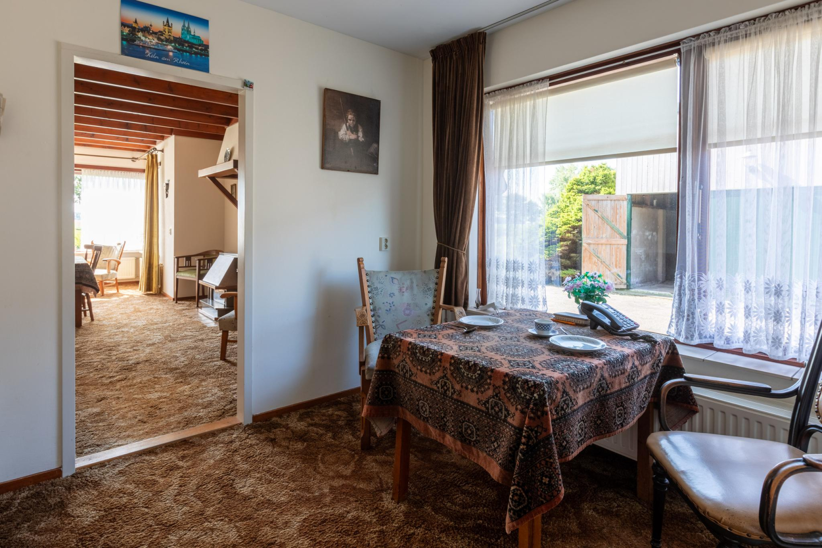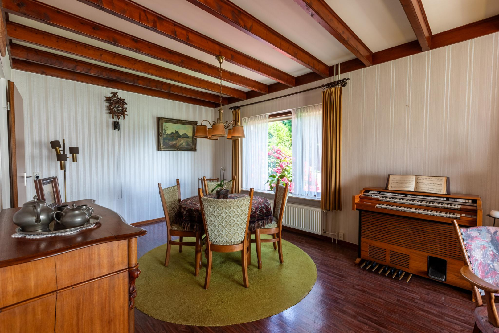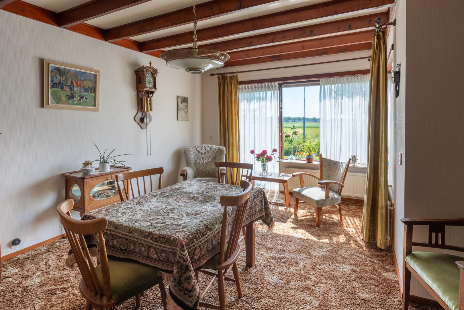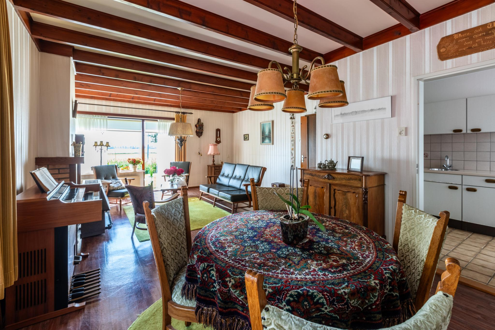 Ruime lichte woonkamer met sfeervolle gashaard en balkenplafond.