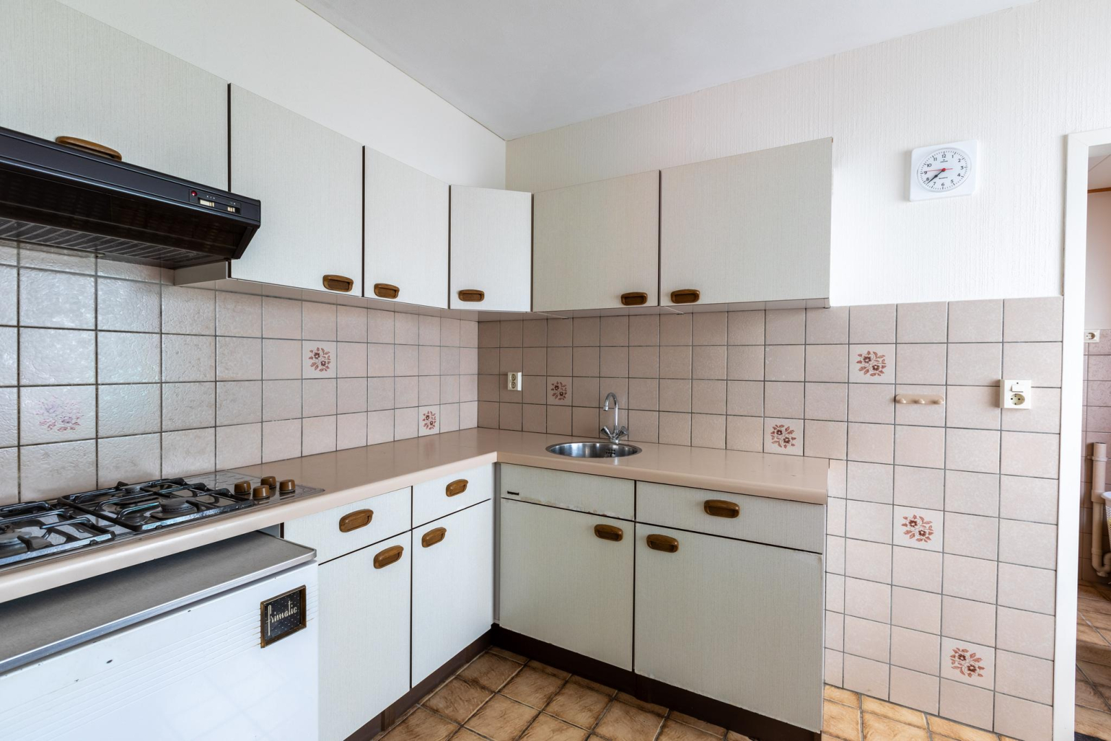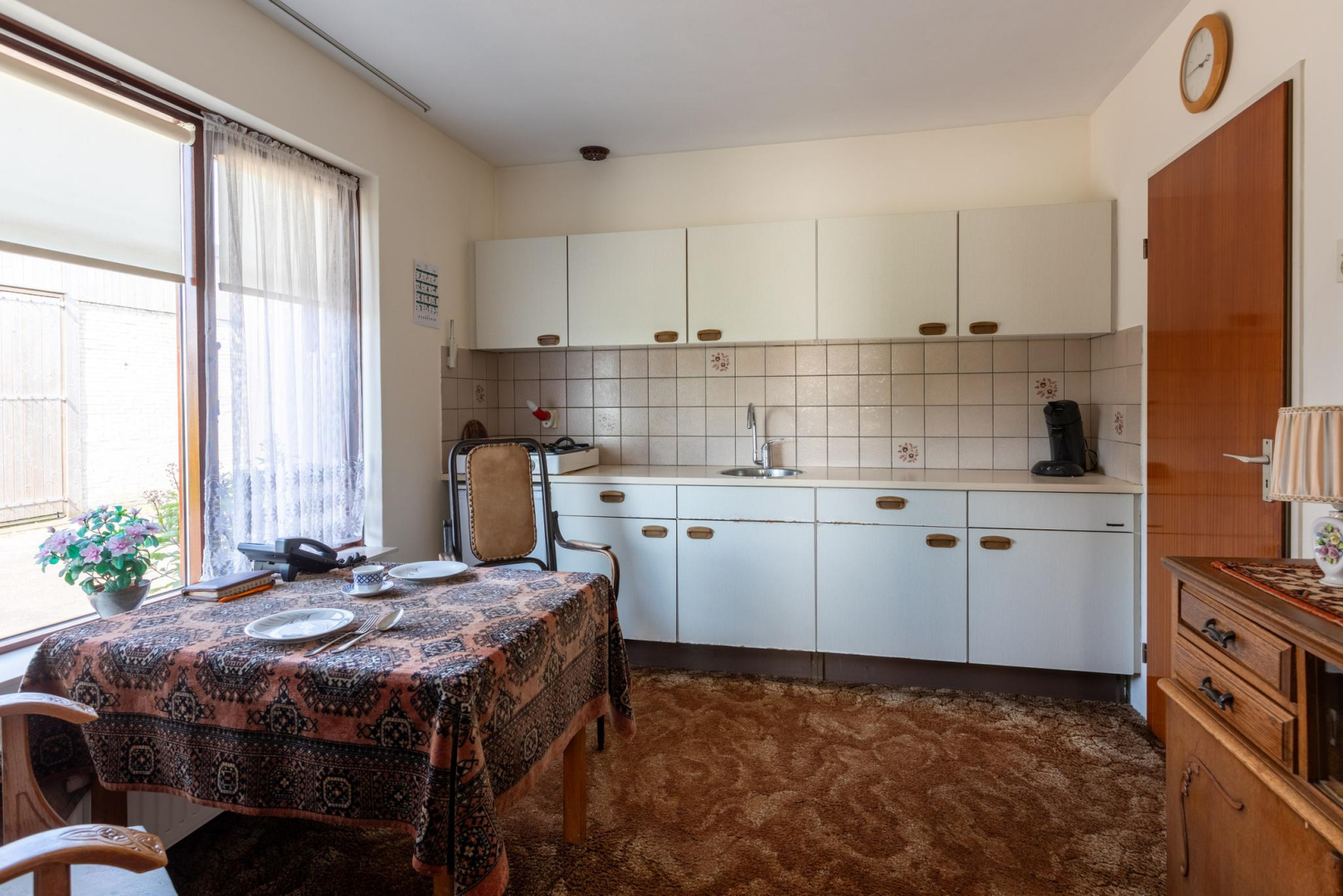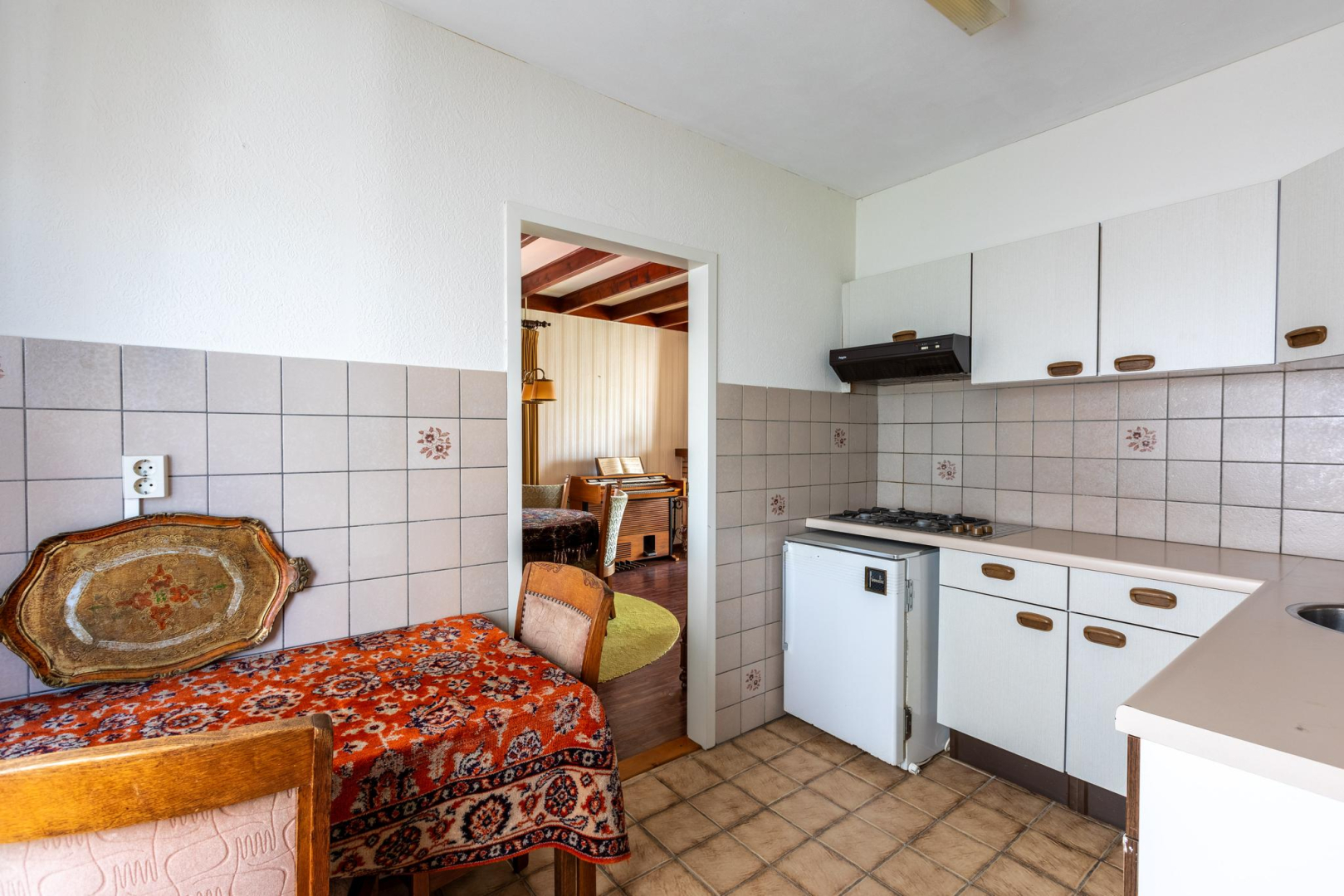 Eenvoudige keuken met keukenblok en toegang tot de bijkeuken met badkamer en een deur met toegang tot het terras en schuur aan de achterzijde.