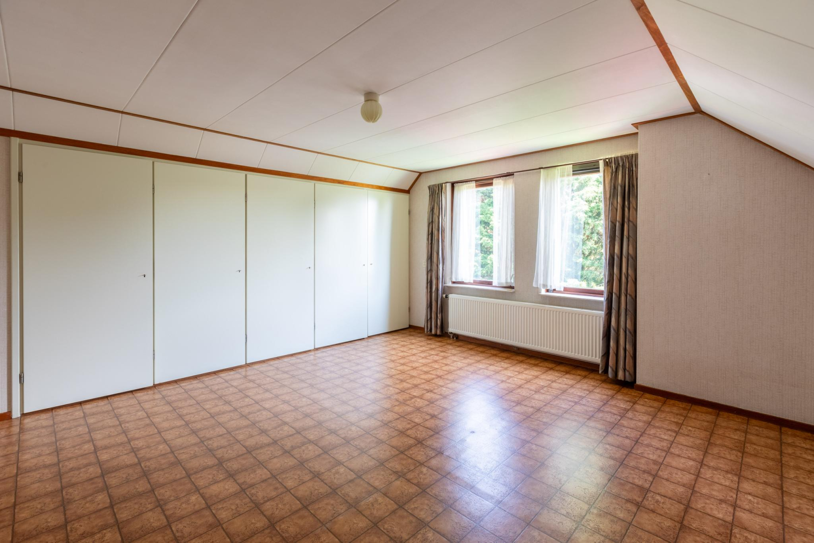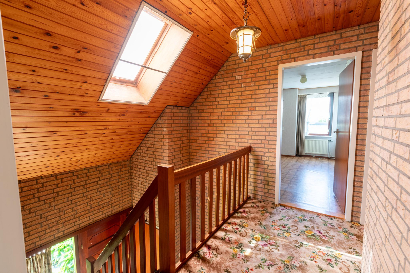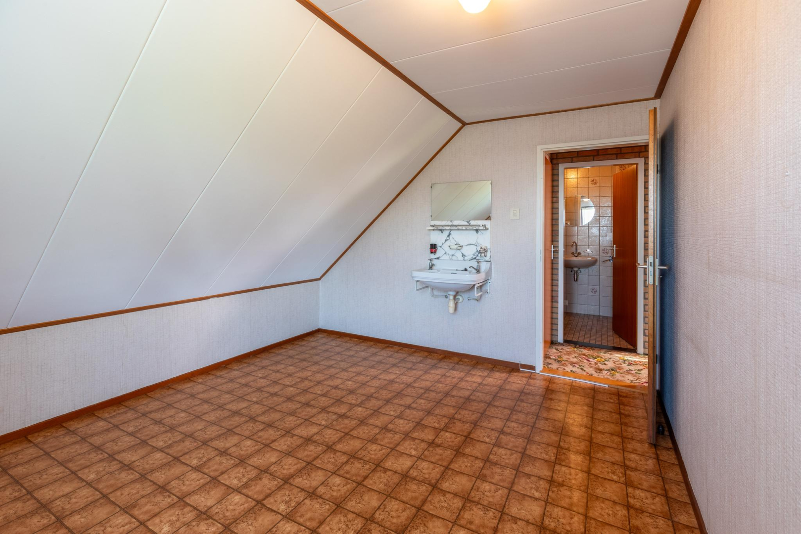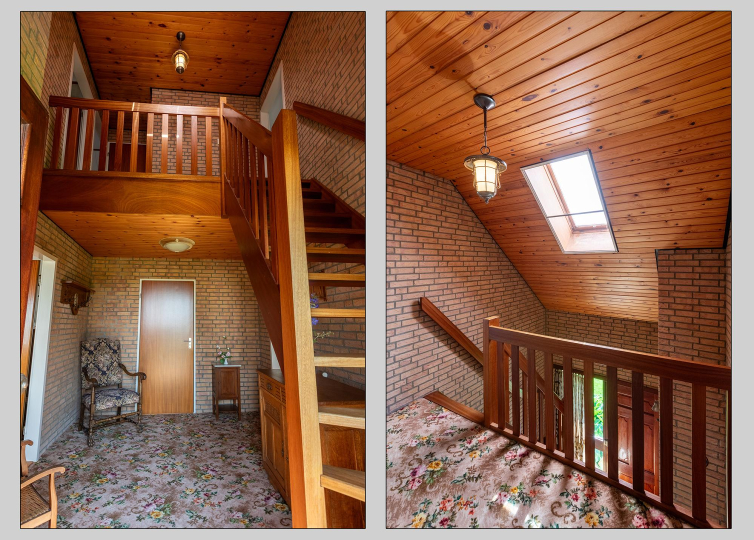 Ruime overloop met diepe bergkast waarin de cv ketel is geplaatst. De hoofdslaapkamer is ingericht met een vaste kastenwand en heeft extra bergruimte achter de knieschotten. De 2e slaapkamer is heerlijk ruim met een diepe lage vaste kast. 3e ruime slaapkamer bevindt zich tegenover de badkamer en heeft een wastafel.