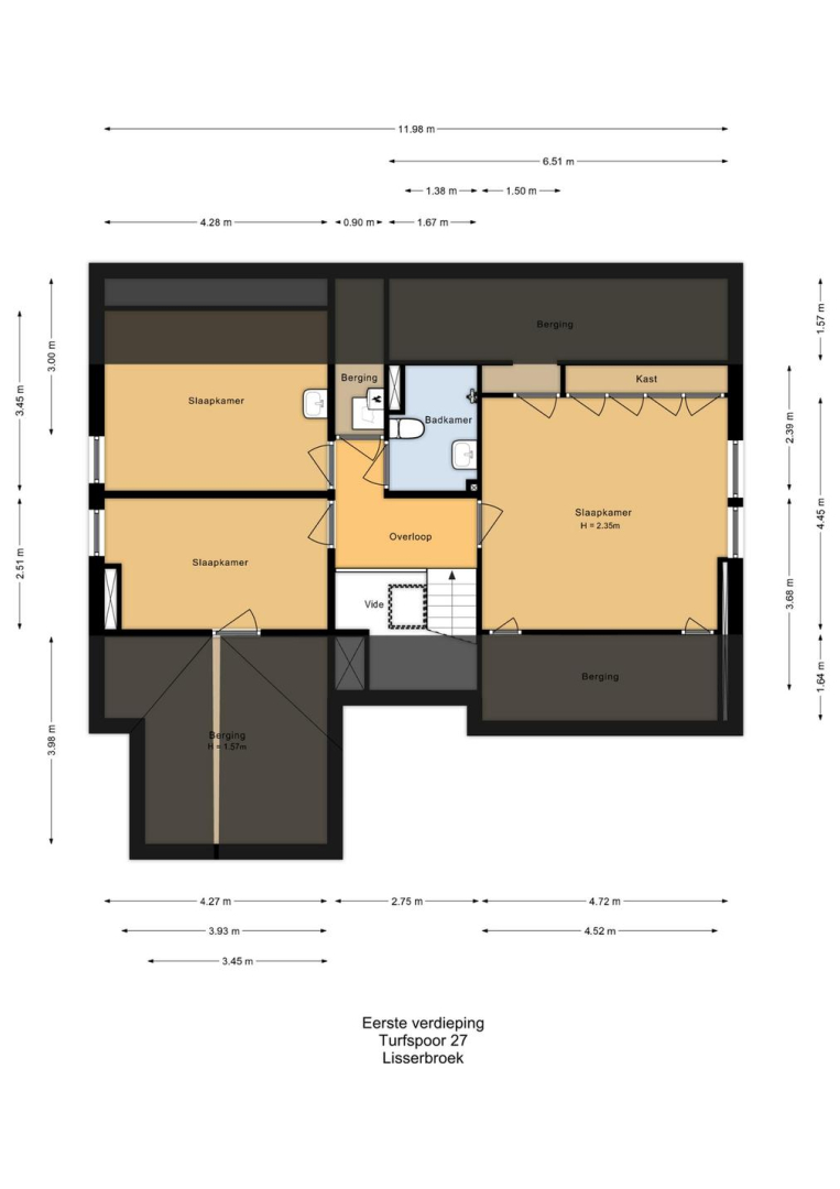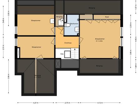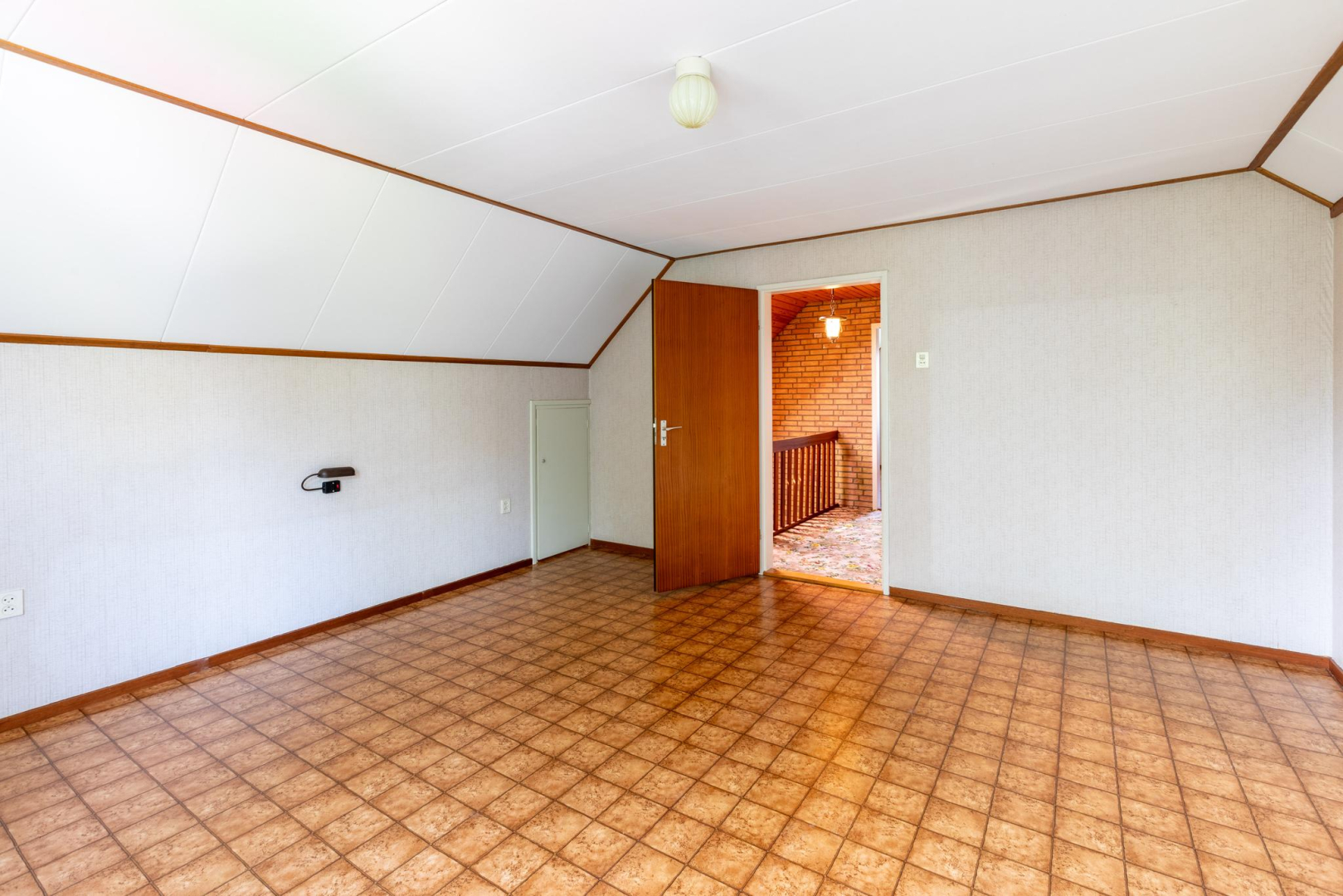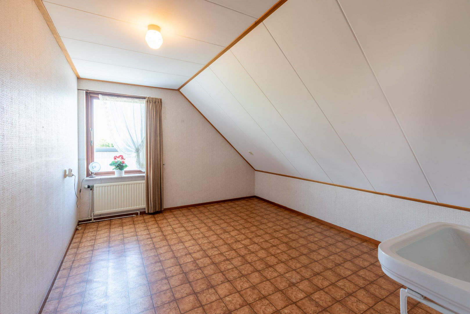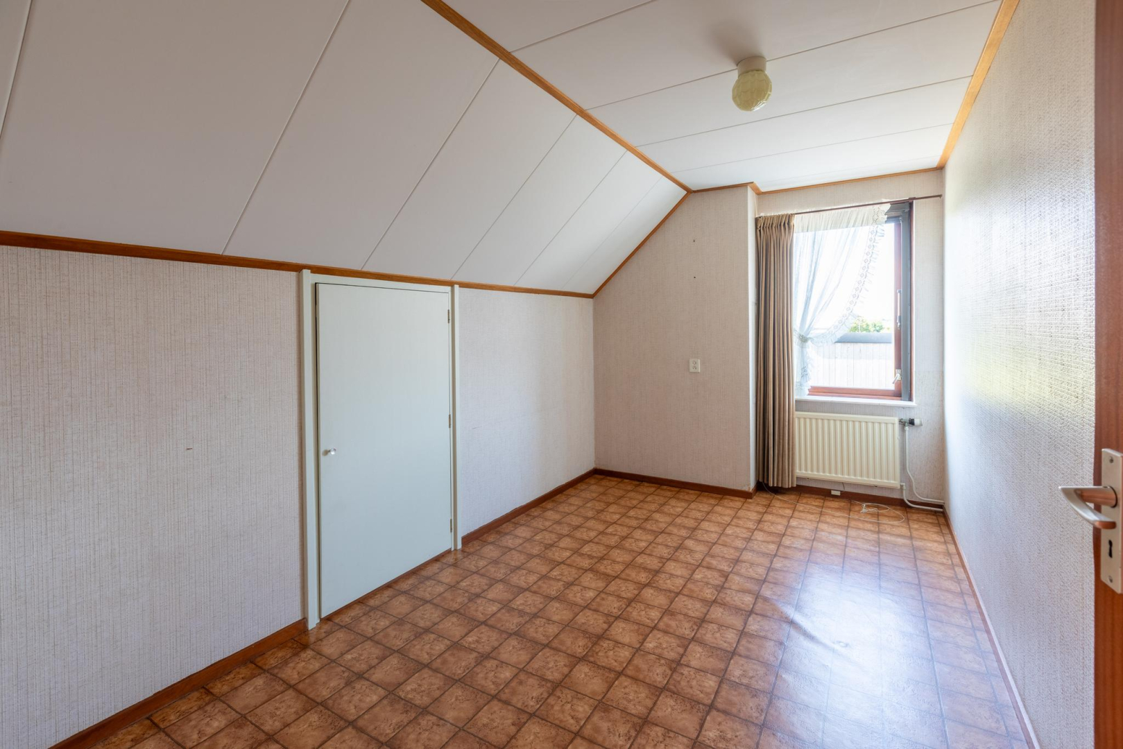 Ruime overloop met diepe bergkast waarin de cv ketel is geplaatst. De hoofdslaapkamer is ingericht met een vaste kastenwand en heeft extra bergruimte achter de knieschotten. De 2e slaapkamer is heerlijk ruim met een diepe lage vaste kast. 3e ruime slaapkamer bevindt zich tegenover de badkamer en heeft een wastafel.