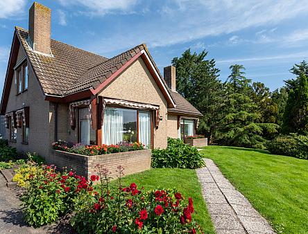 Riante voortuin met borders en pad naar de voordeur. De oprit geeft toegang tot de achtergelegen schuren.