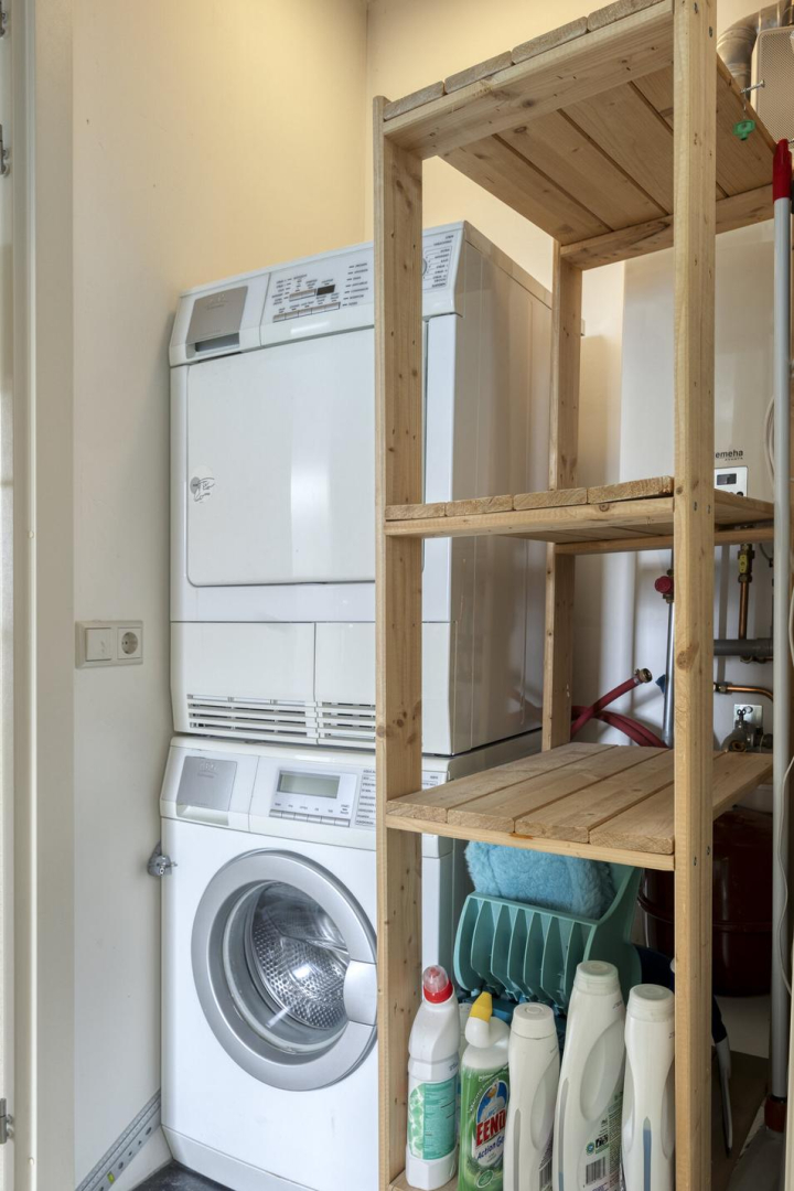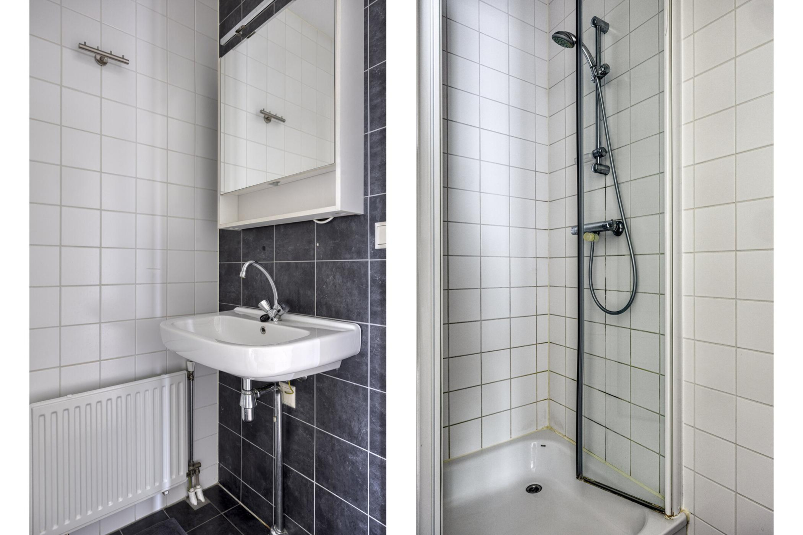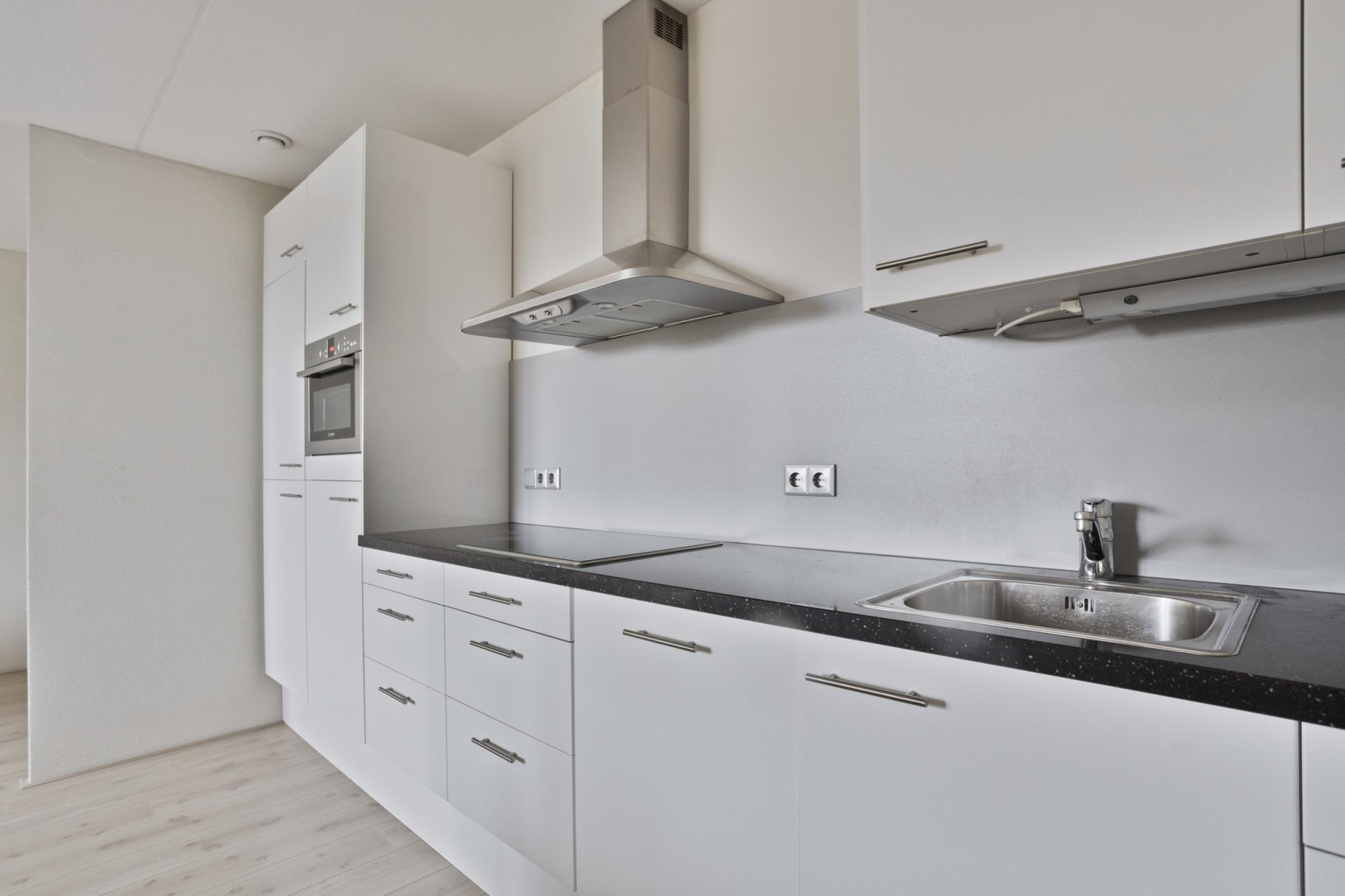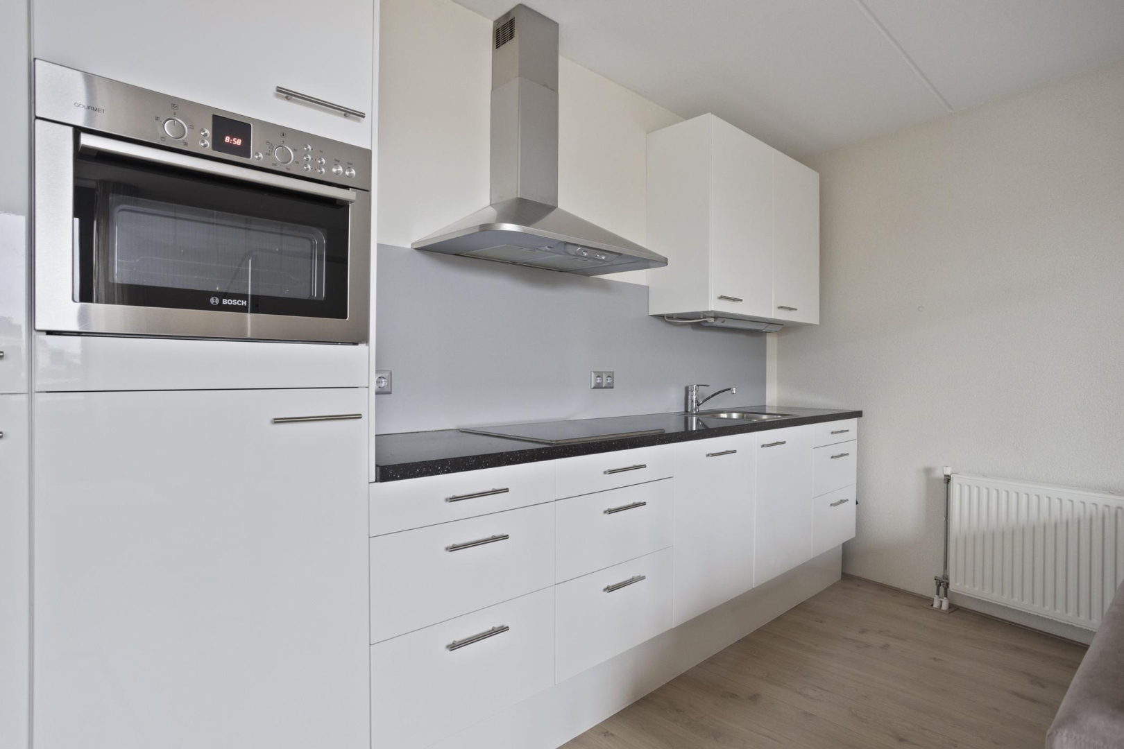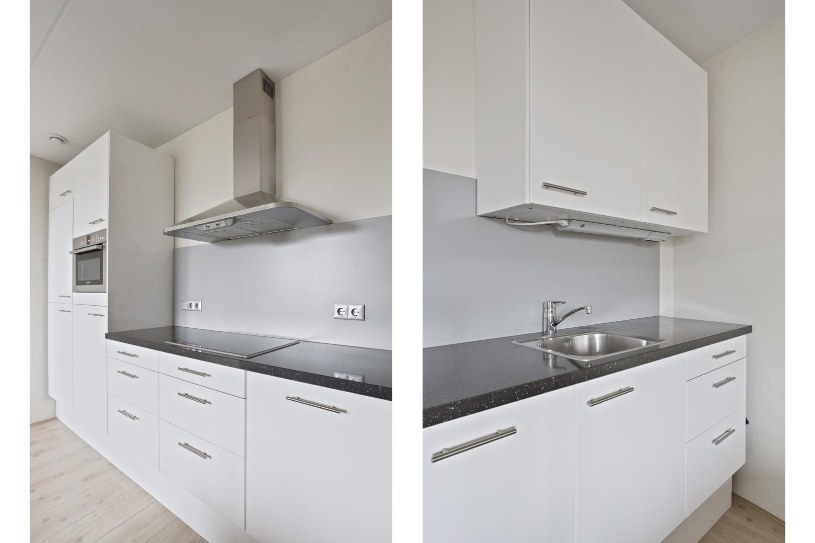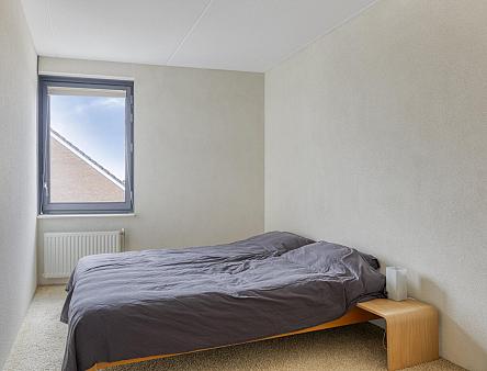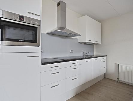 Entree/hal met meterkast en een bergkast met opstelplaats voor de CV-combiketel en aansluiting voor wasapparatuur. Vanuit de hal bereik je twee slaapkamers, een separate toiletruimte en de badkamer met douche en een wastafel met spiegelkast. Eén van de slaapkamers is ingericht met kledingkasten en een bureau - ideaal als werk- of logeerkamer. Zowel de badkamer als het toilet zijn afgewerkt met een donkere tegelvloer en witte wandtegels. Vanuit de hal stap je de lichte en ruime woonkamer binnen. Dankzij de grote ramen geniet je hier van veel daglicht en een fijne, open sfeer. Er is genoeg ruimte voor een royale eethoek om gezellig te tafelen met familie en vrienden. De open keuken vormt een prachtig geheel met de woonkamer en is van alle gemakken voorzien: een modern werkblad, inductiekookplaat, afzuigkap, combi-oven, vaatwasser, koelkast, vriezer en volop kastruimte.
