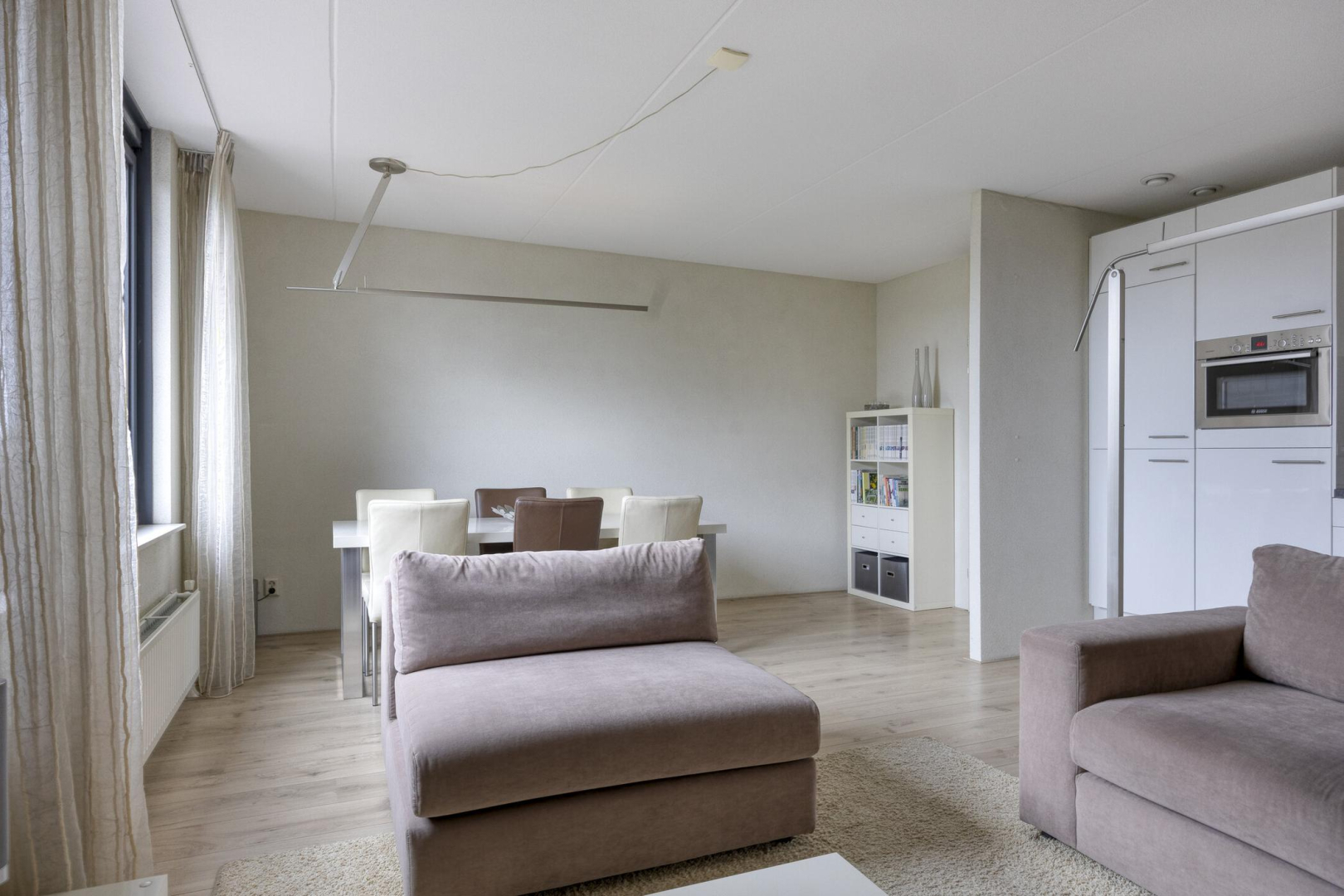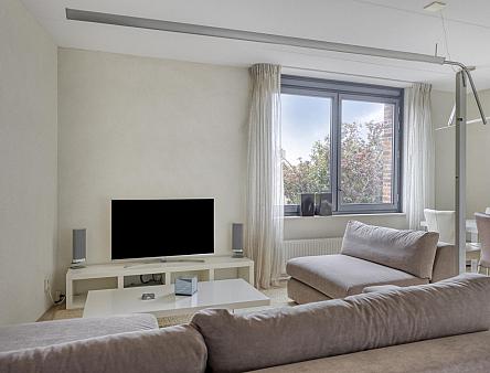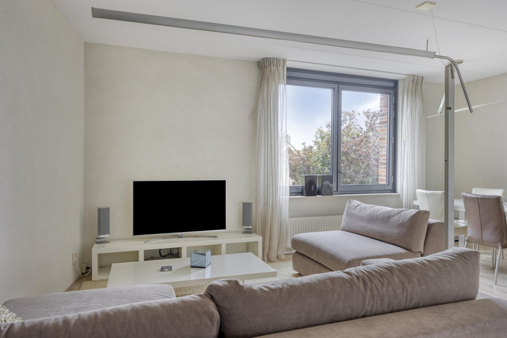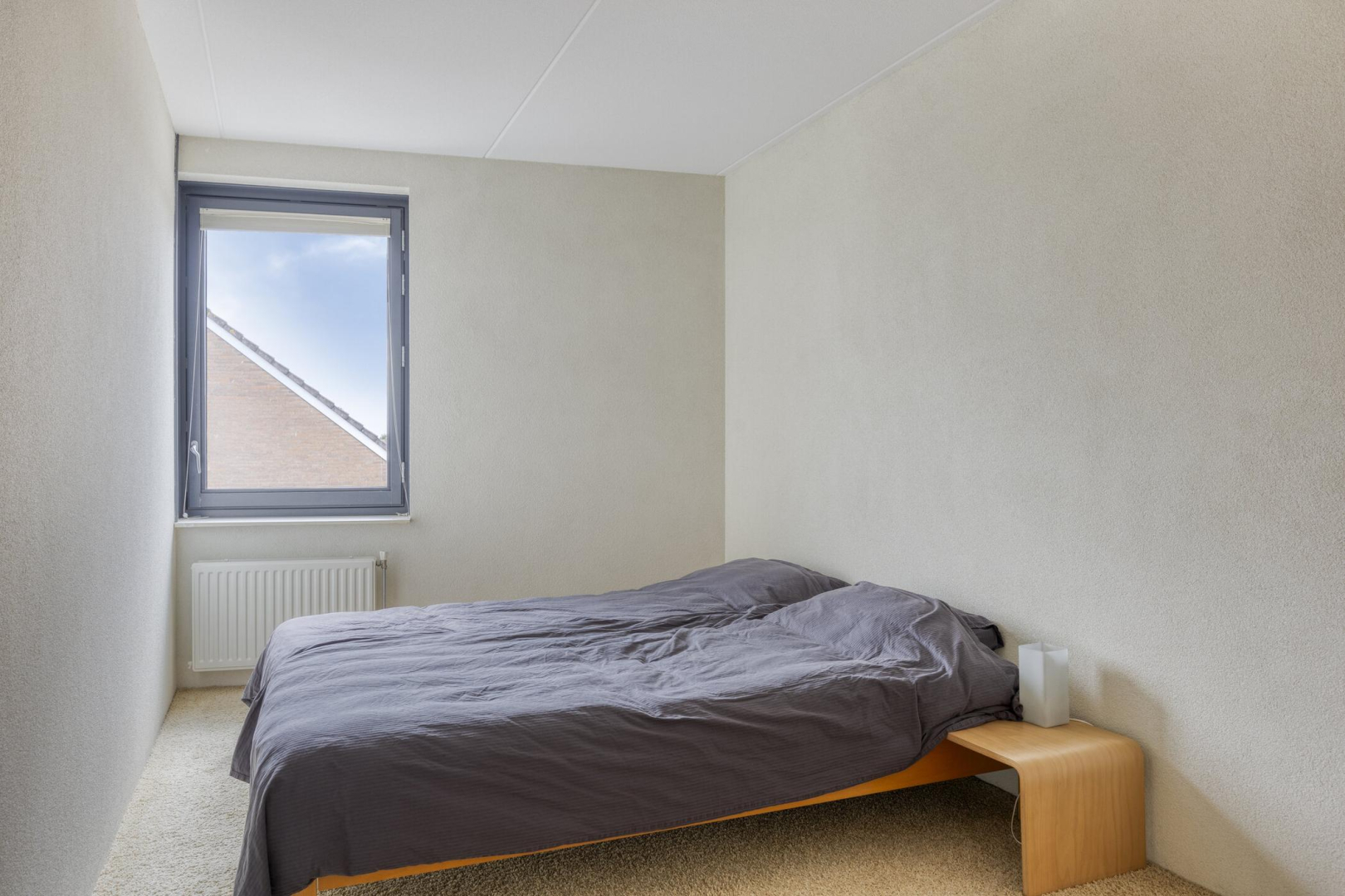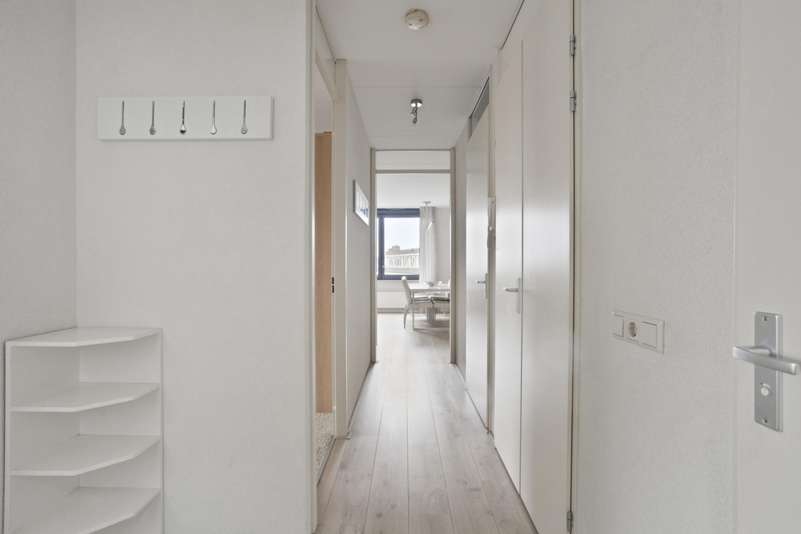 Entree/hal met meterkast en een bergkast met opstelplaats voor de CV-combiketel en aansluiting voor wasapparatuur. Vanuit de hal bereik je twee slaapkamers, een separate toiletruimte en de badkamer met douche en een wastafel met spiegelkast. Eén van de slaapkamers is ingericht met kledingkasten en een bureau - ideaal als werk- of logeerkamer. Zowel de badkamer als het toilet zijn afgewerkt met een donkere tegelvloer en witte wandtegels. Vanuit de hal stap je de lichte en ruime woonkamer binnen. Dankzij de grote ramen geniet je hier van veel daglicht en een fijne, open sfeer. Er is genoeg ruimte voor een royale eethoek om gezellig te tafelen met familie en vrienden. De open keuken vormt een prachtig geheel met de woonkamer en is van alle gemakken voorzien: een modern werkblad, inductiekookplaat, afzuigkap, combi-oven, vaatwasser, koelkast, vriezer en volop kastruimte.