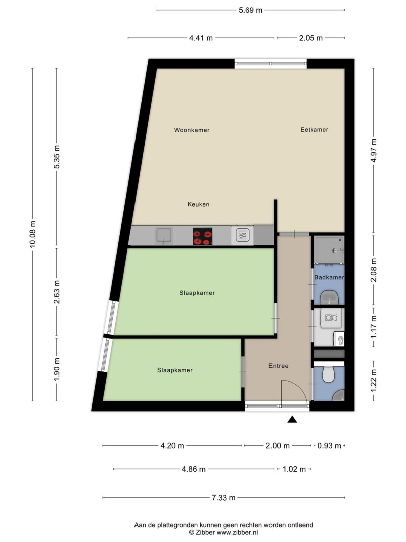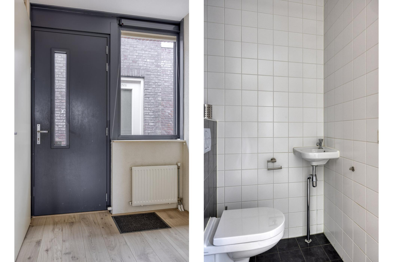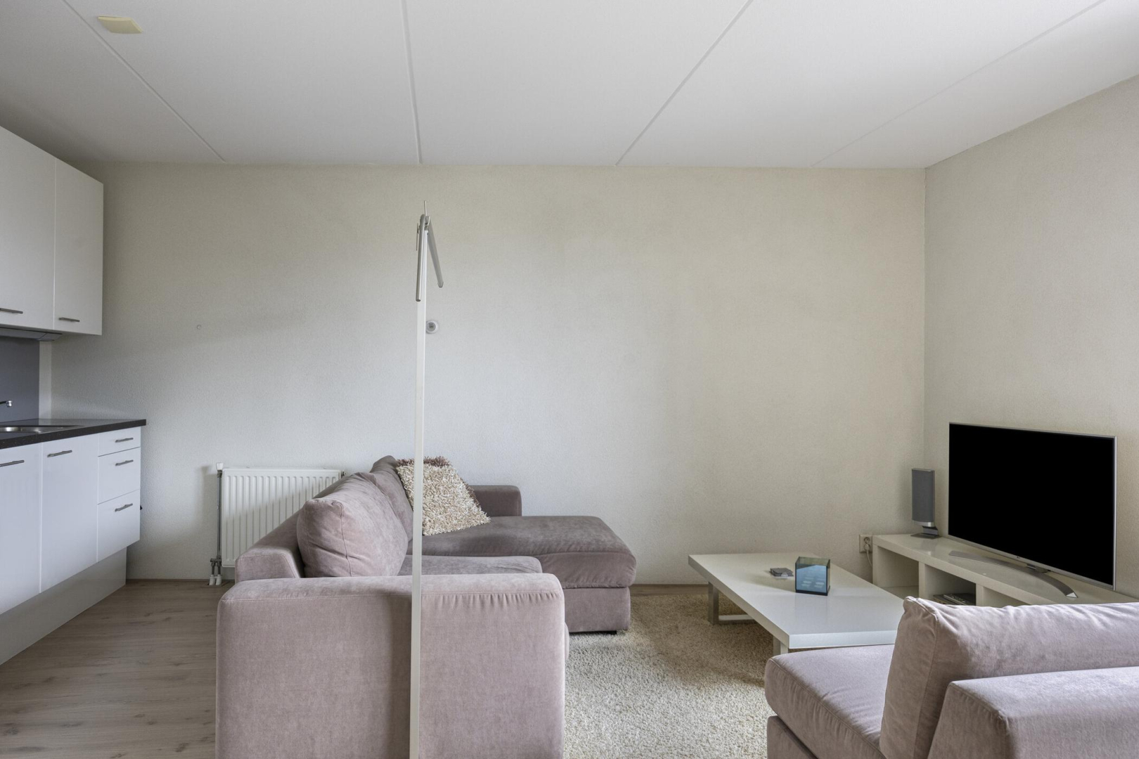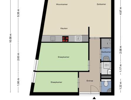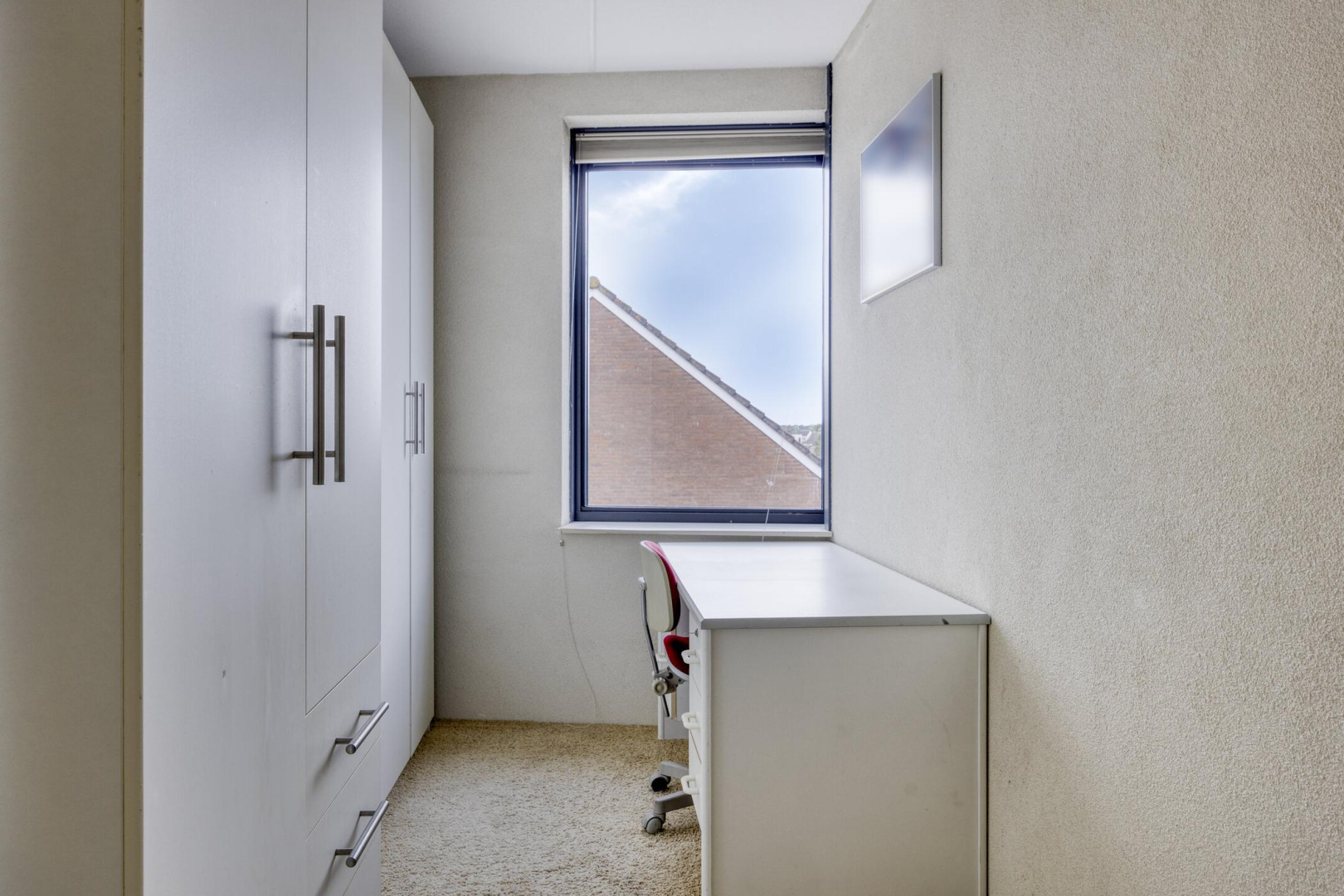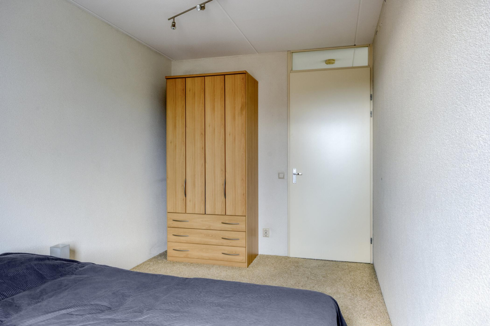 Entree/hal met meterkast en een bergkast met opstelplaats voor de CV-combiketel en aansluiting voor wasapparatuur. Vanuit de hal bereik je twee slaapkamers, een separate toiletruimte en de badkamer met douche en een wastafel met spiegelkast. Eén van de slaapkamers is ingericht met kledingkasten en een bureau - ideaal als werk- of logeerkamer. Zowel de badkamer als het toilet zijn afgewerkt met een donkere tegelvloer en witte wandtegels. Vanuit de hal stap je de lichte en ruime woonkamer binnen. Dankzij de grote ramen geniet je hier van veel daglicht en een fijne, open sfeer. Er is genoeg ruimte voor een royale eethoek om gezellig te tafelen met familie en vrienden. De open keuken vormt een prachtig geheel met de woonkamer en is van alle gemakken voorzien: een modern werkblad, inductiekookplaat, afzuigkap, combi-oven, vaatwasser, koelkast, vriezer en volop kastruimte.