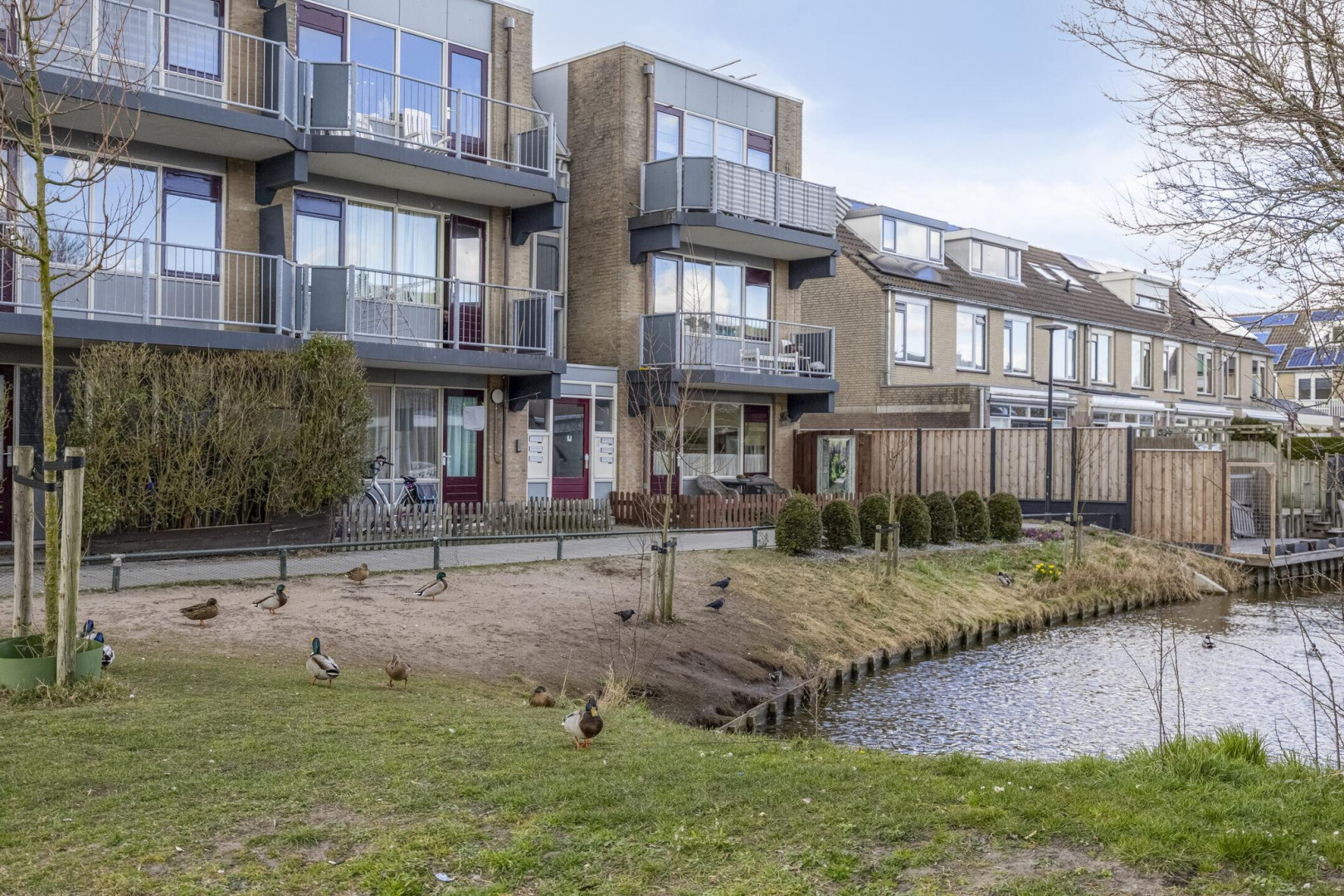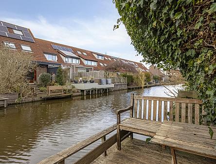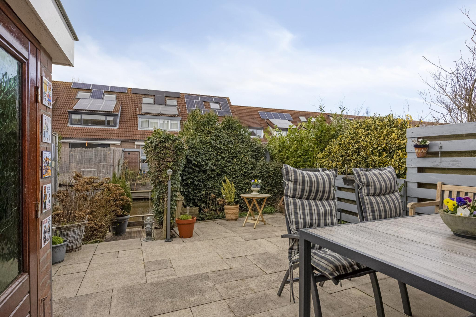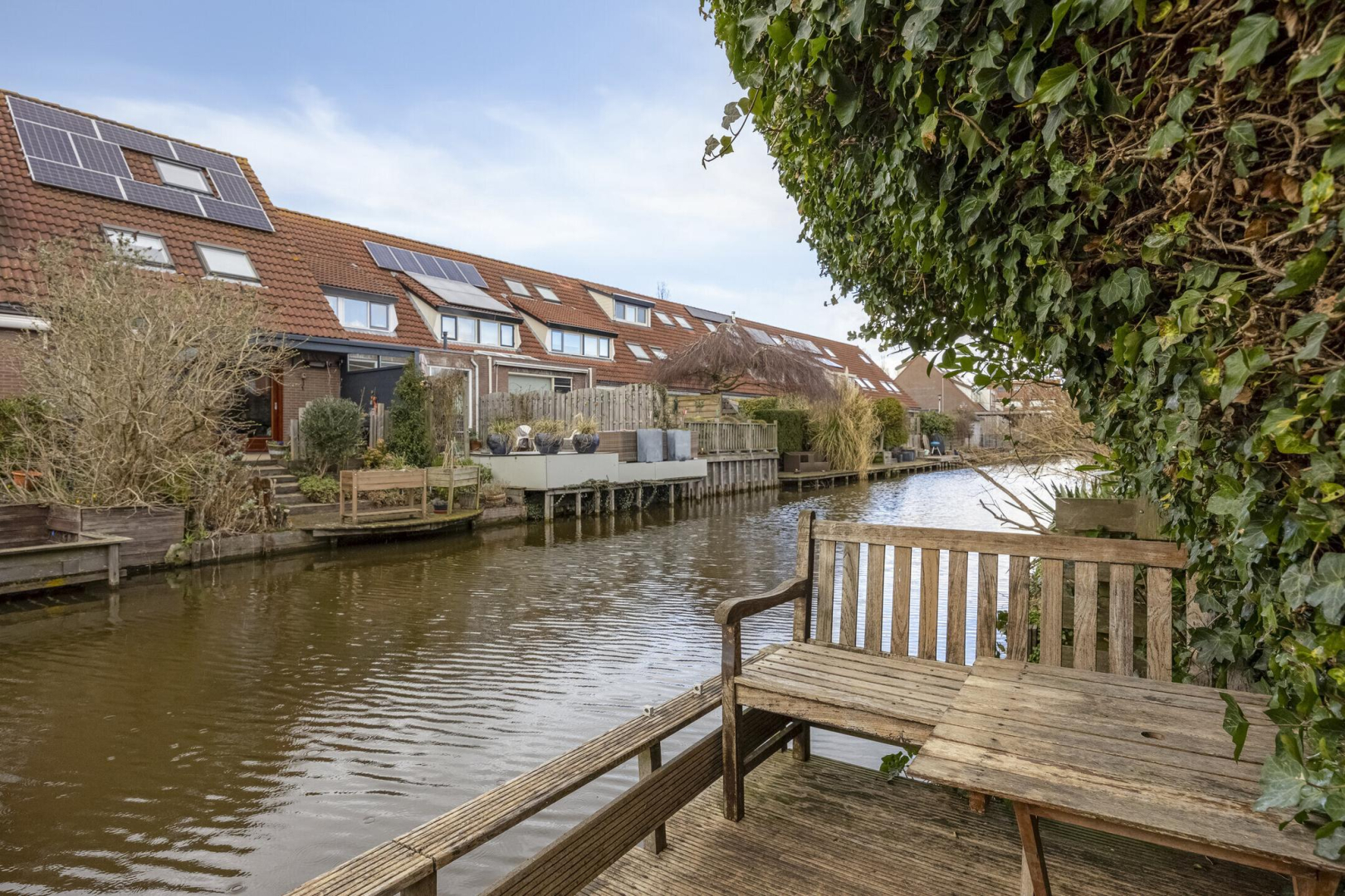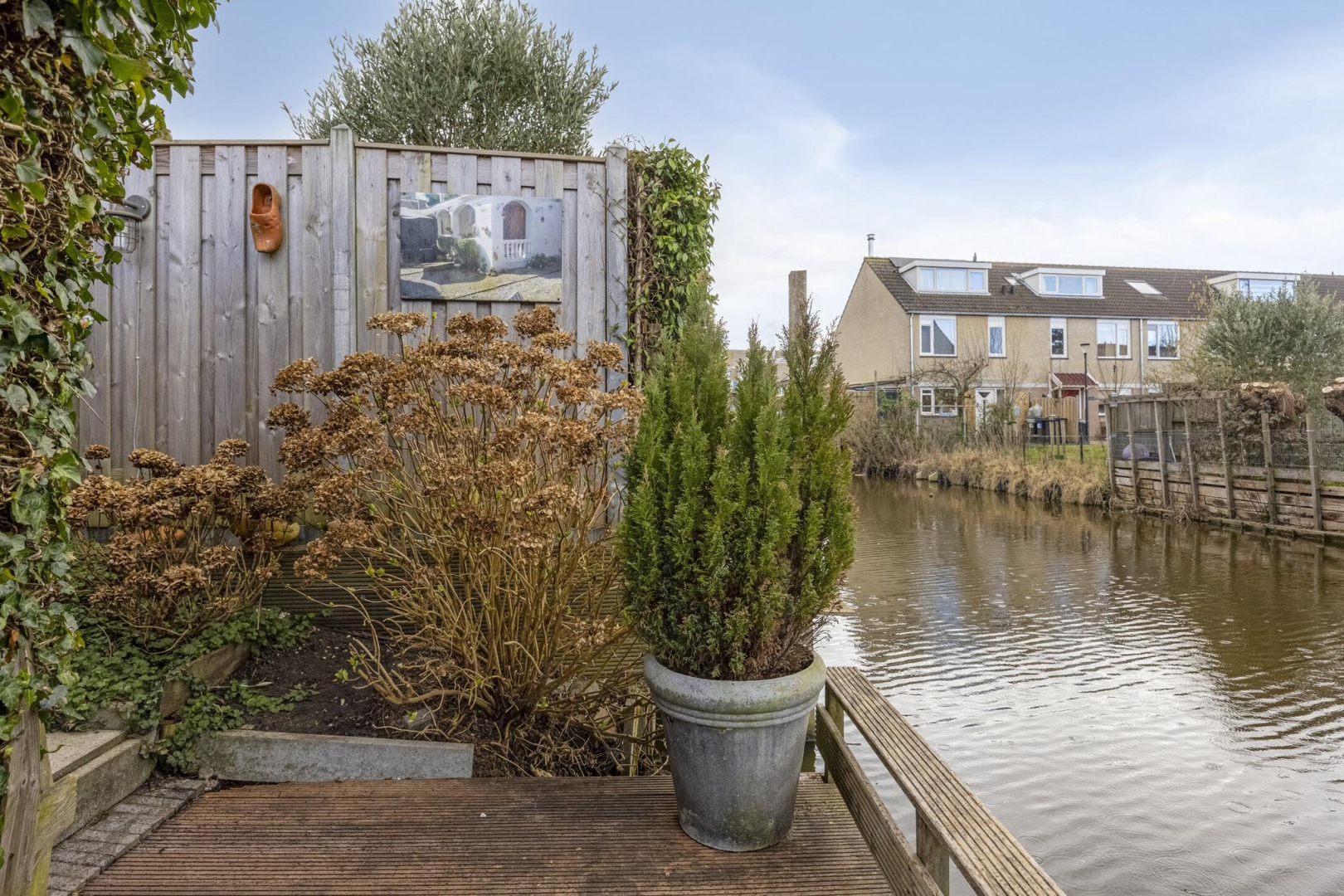De voortuin biedt een eigen parkeerplaats en ruime stenen berging voor fietsen en extra opslagruimte. De schuur is ook van binnenuit bereikbaar doordat er is aangebouwd tussen de woning en de schuur. De diepe, zonnige achtertuin heeft een ruim terras met nog een stenen berging. De mooie groene struiken bieden veel privacy. Wil je vissen of van de laatste zonnestralen genieten, dan kun je het trapje af naar de prachtige houten vlonder aan het water.