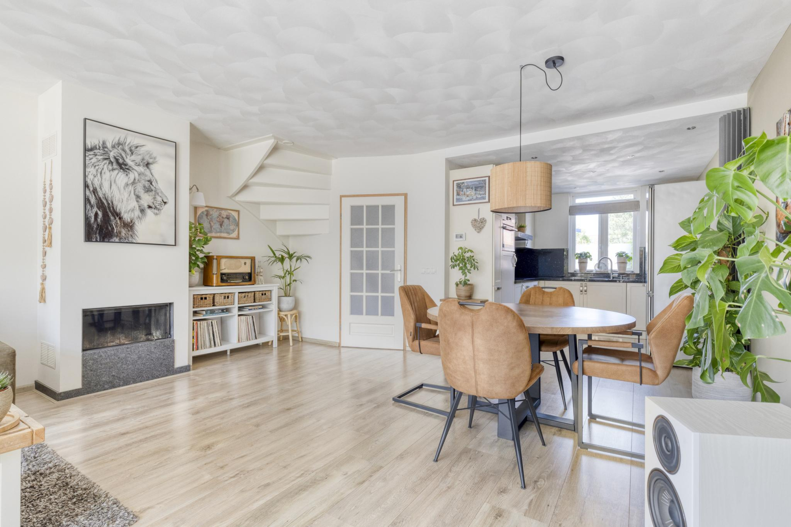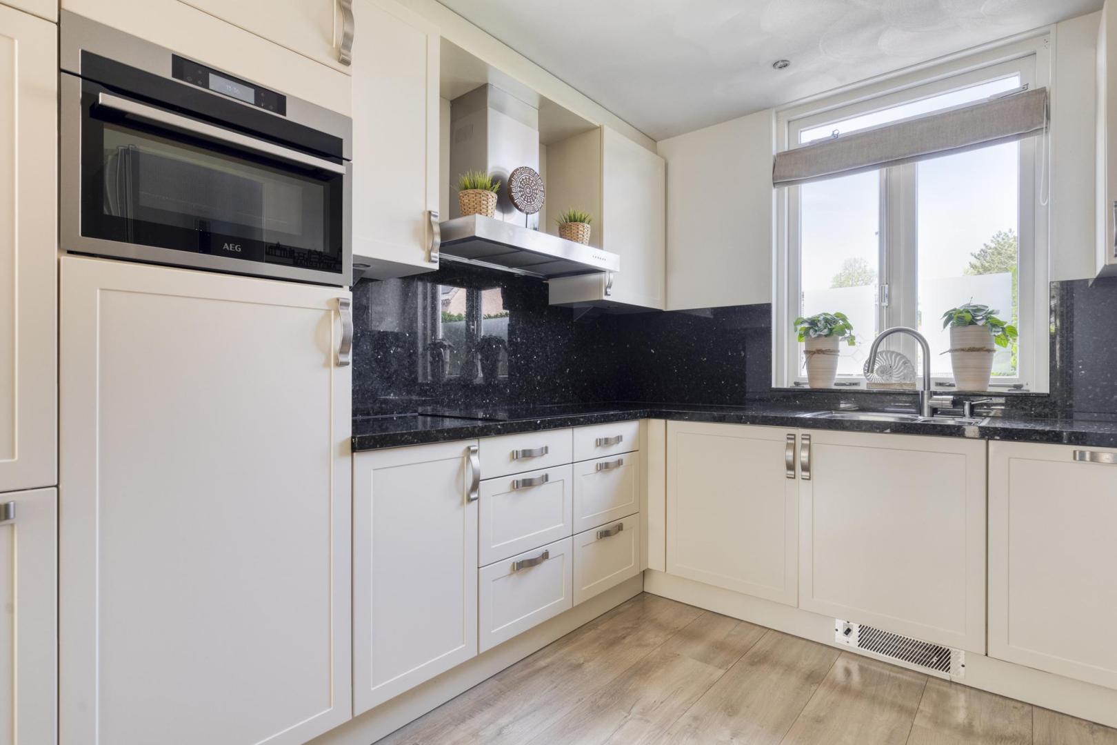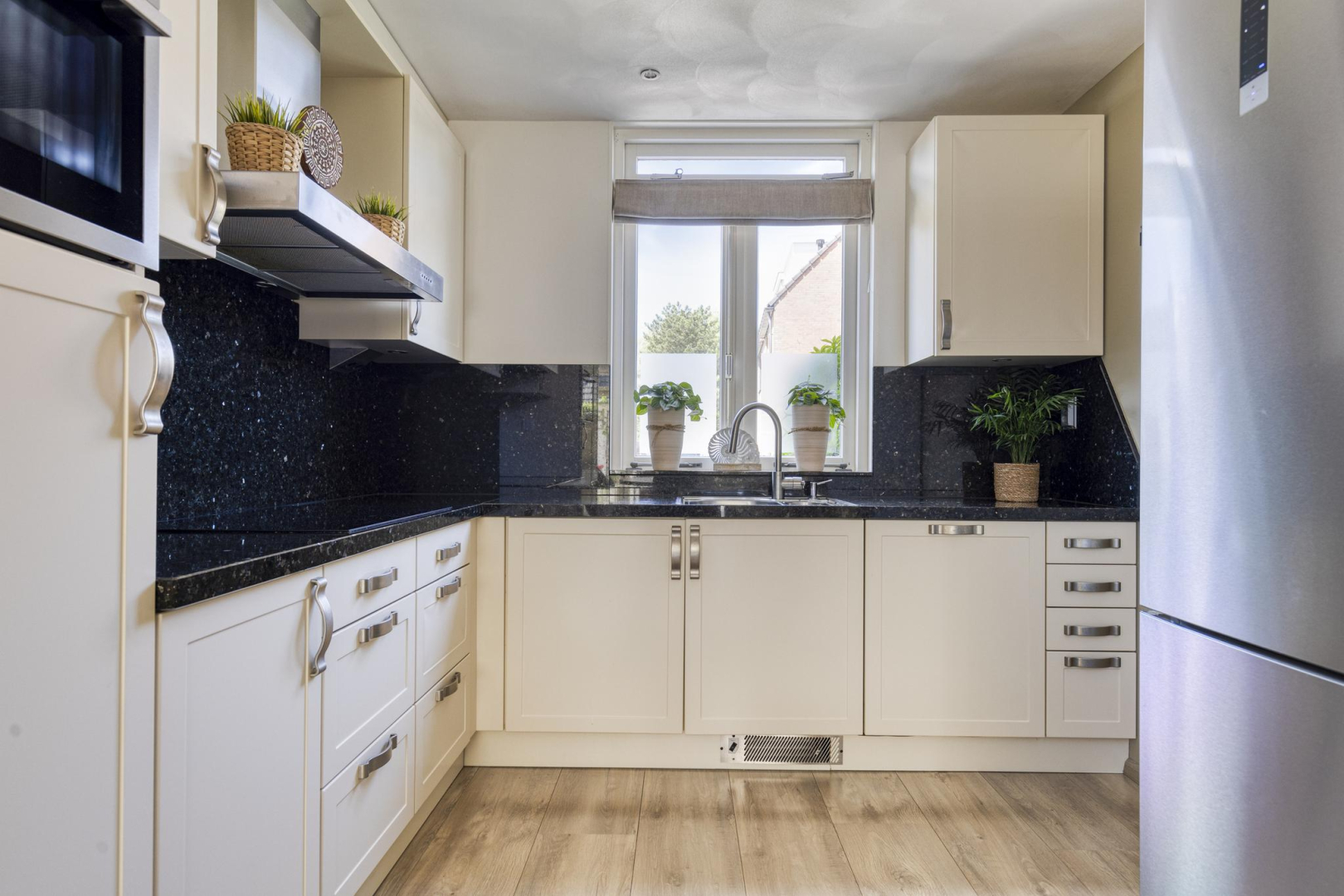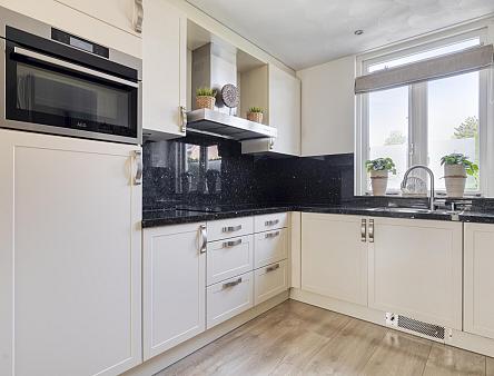 in de woonkamer. De open keuken heeft een lichte kleurstelling, een granieten aanrechtblad en diverse inbouwapparatuur, waaronder een combi-magnetron, vaatwasser, inductieplaat met rvs afzuigkap en een losse koelkast. De benedenverdieping is voorzien van een neutrale laminaatvloer.