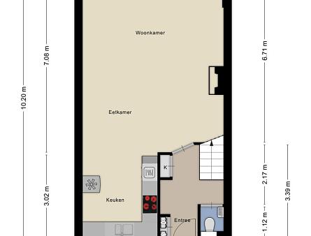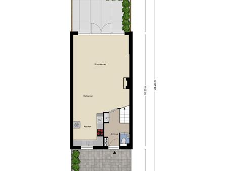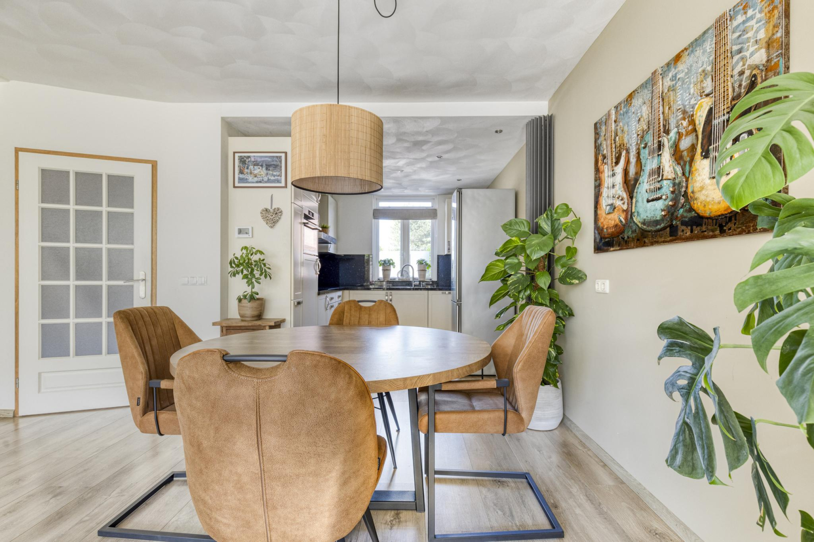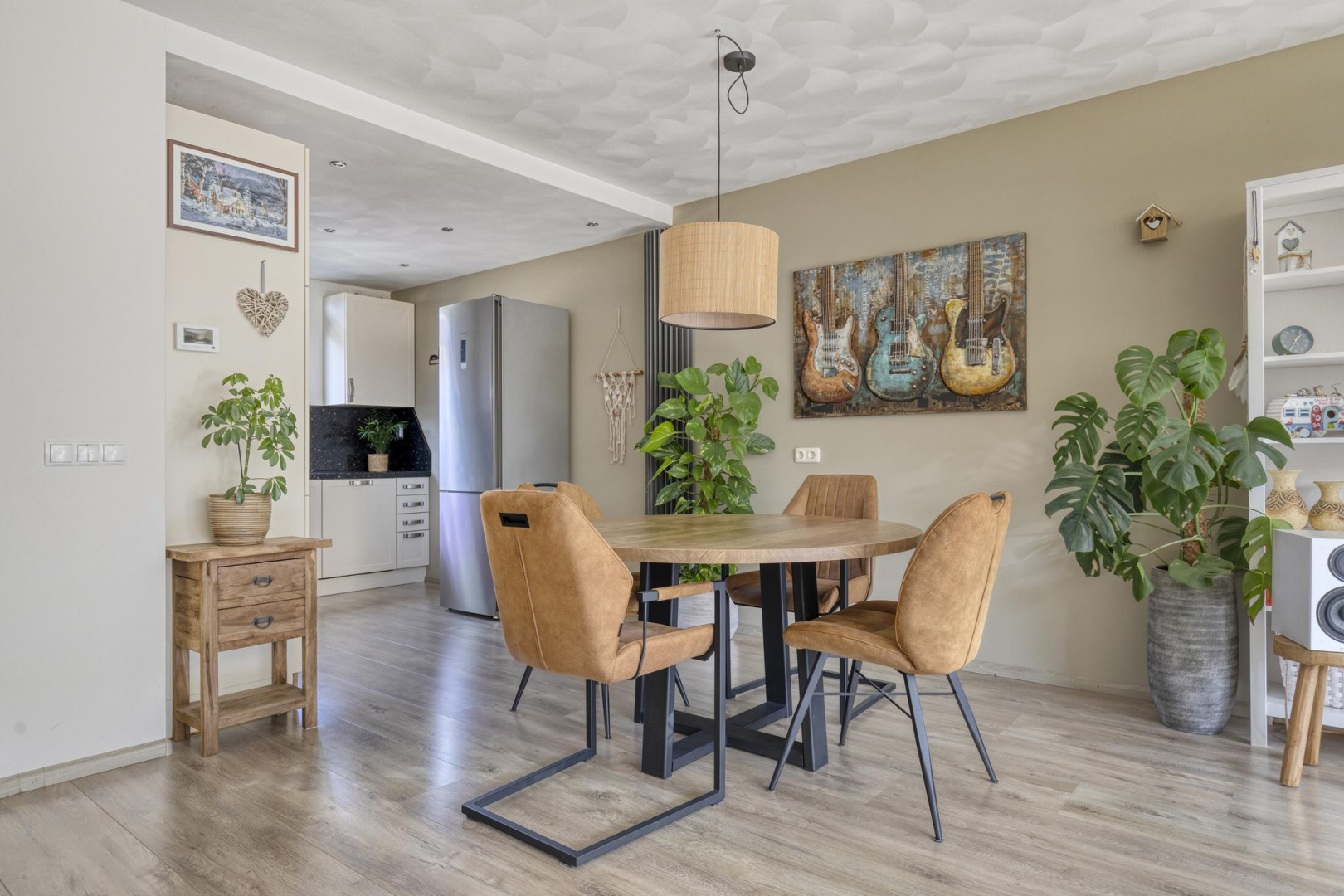 in de woonkamer. De open keuken heeft een lichte kleurstelling, een granieten aanrechtblad en diverse inbouwapparatuur, waaronder een combi-magnetron, vaatwasser, inductieplaat met rvs afzuigkap en een losse koelkast. De benedenverdieping is voorzien van een neutrale laminaatvloer.