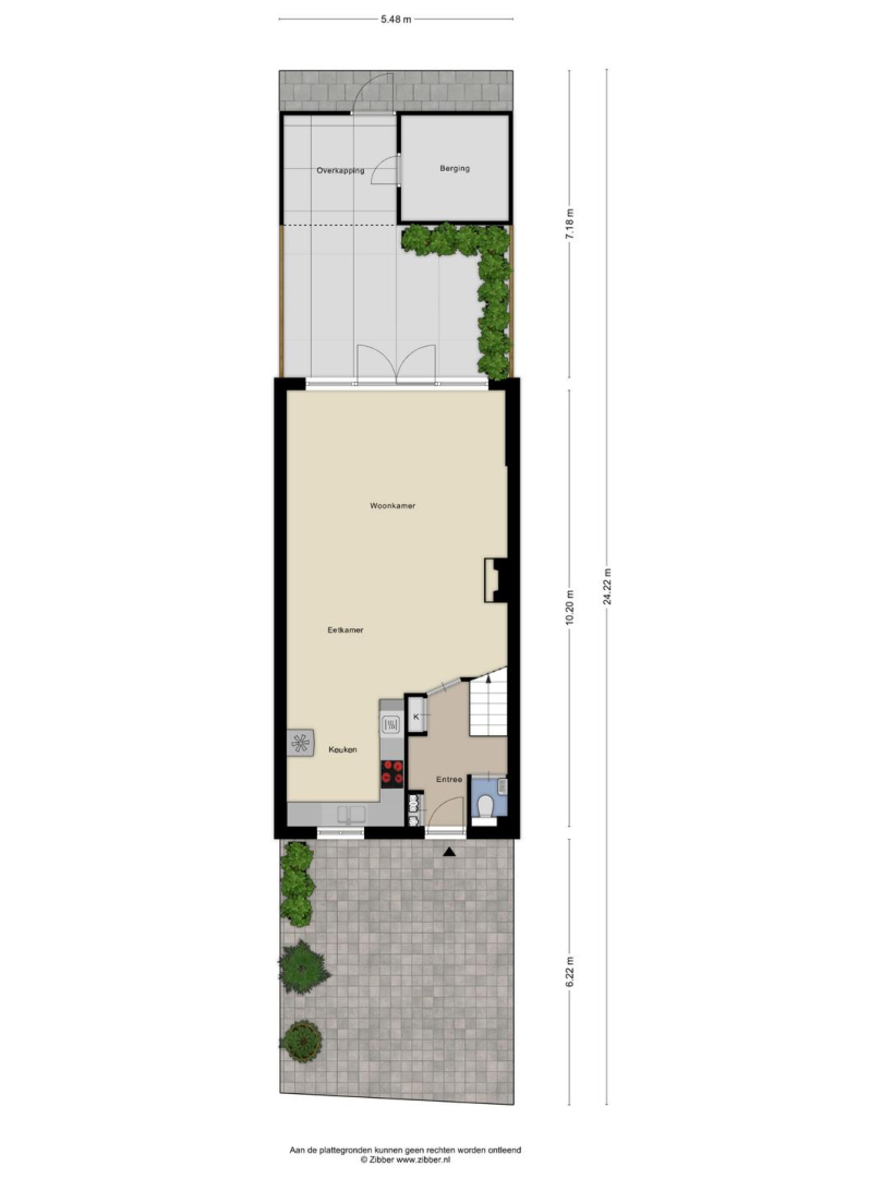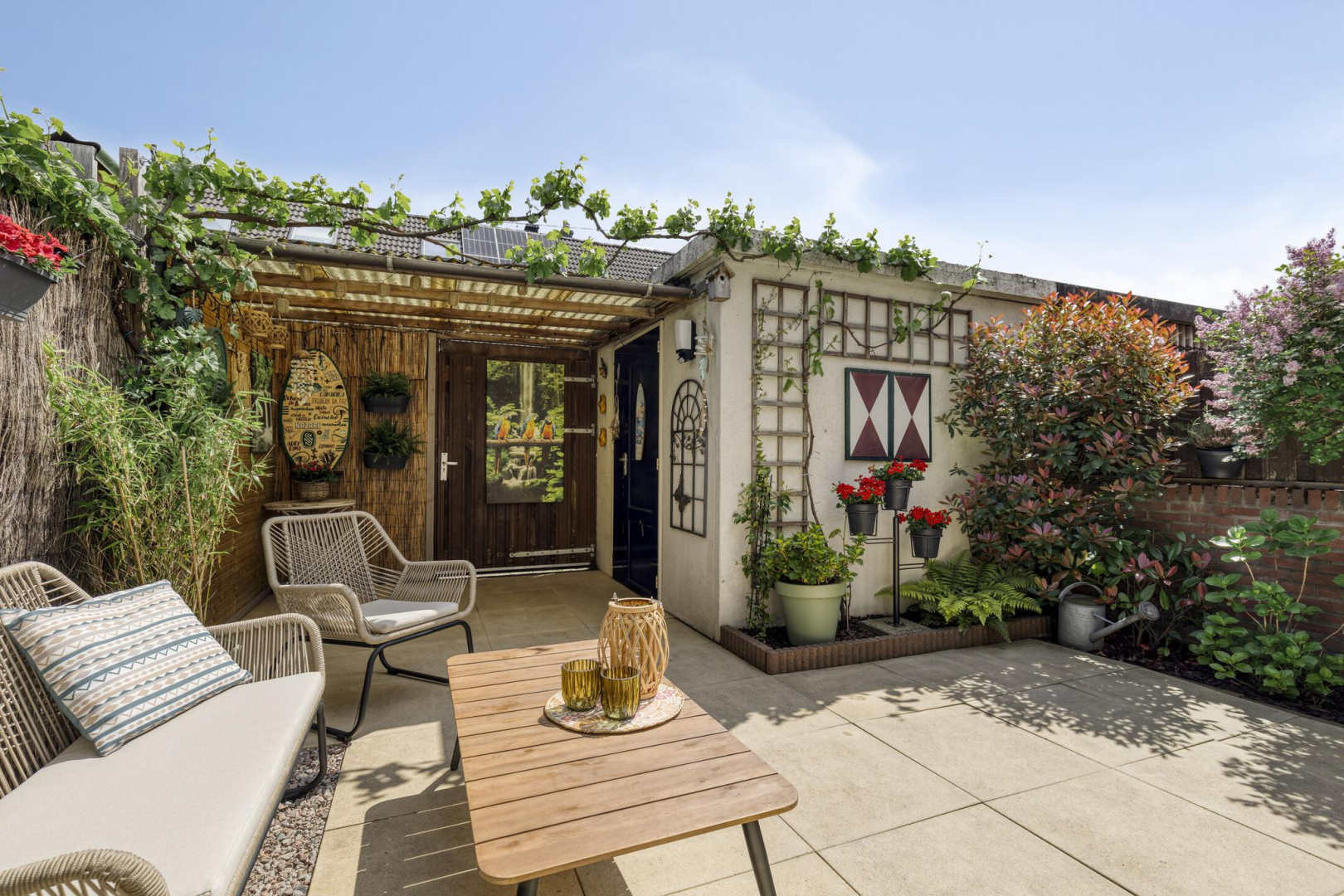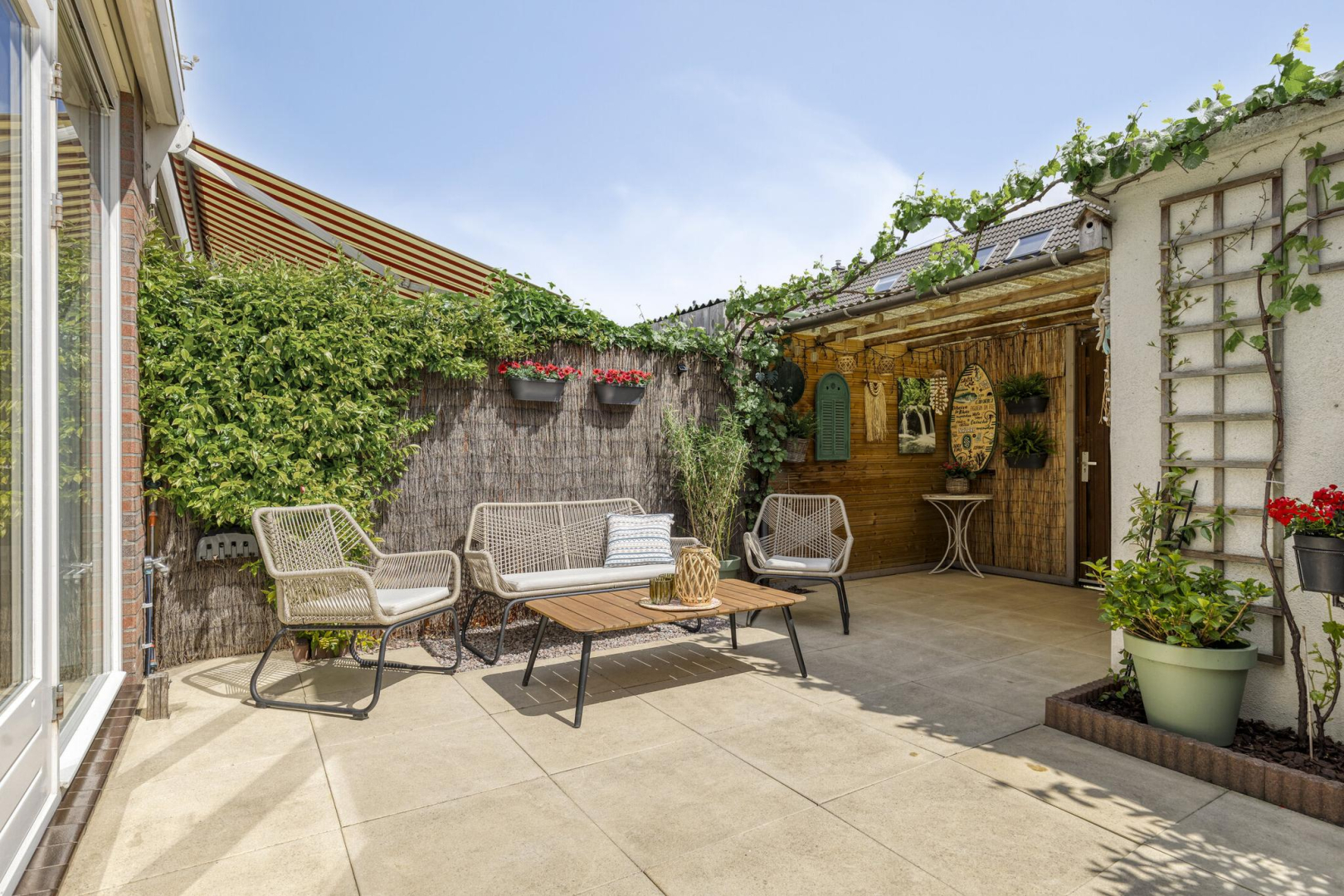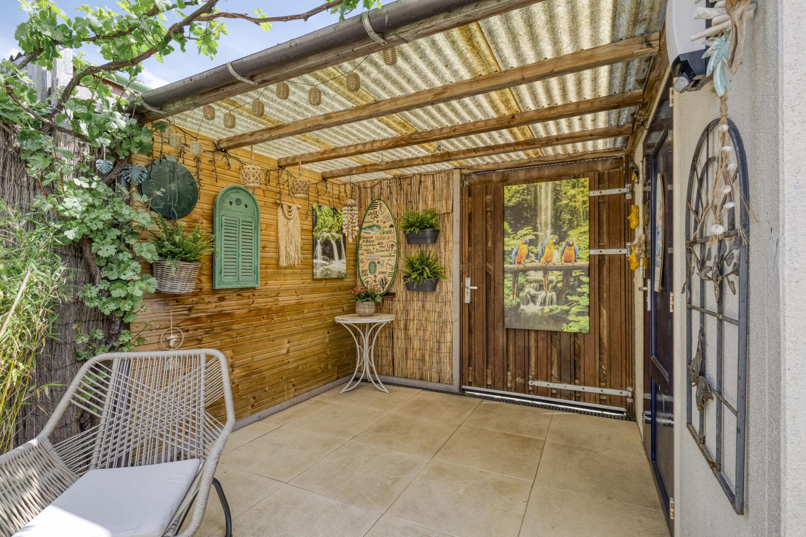 De onderhoudsvriendelijke achtertuin ligt op het zuidoosten en voorzien van een elektrisch zonnescherm, stenen berging, overkapping en een achterom.
