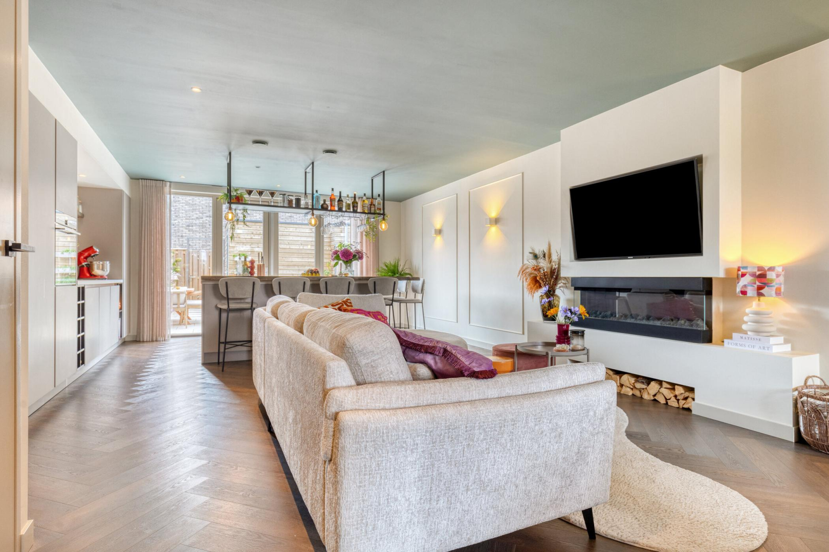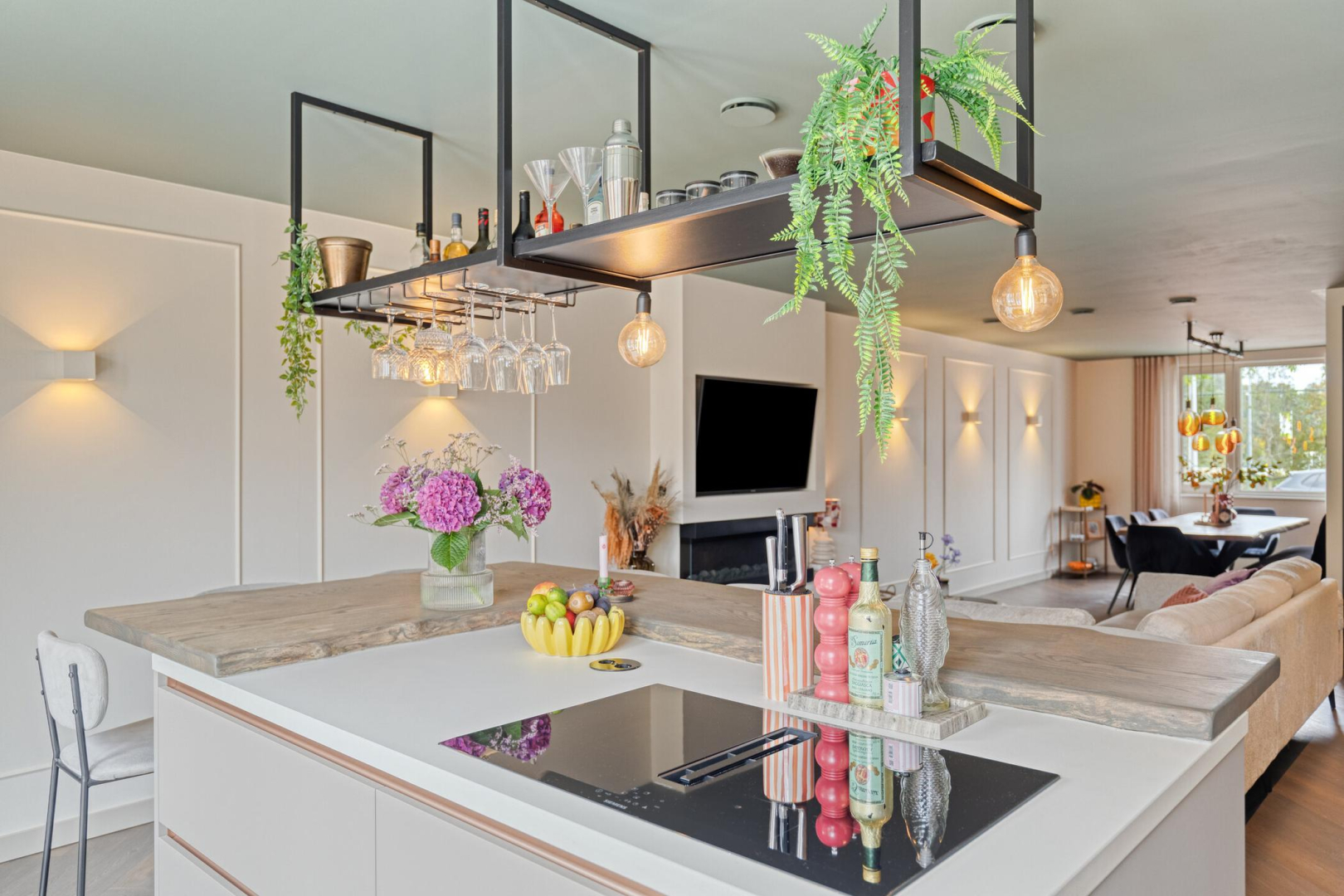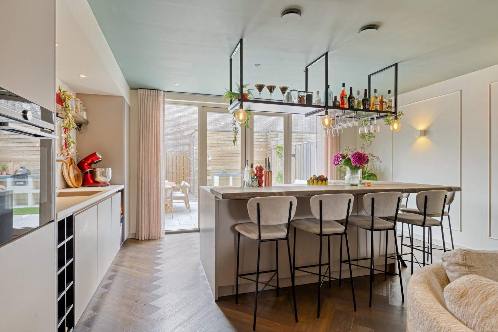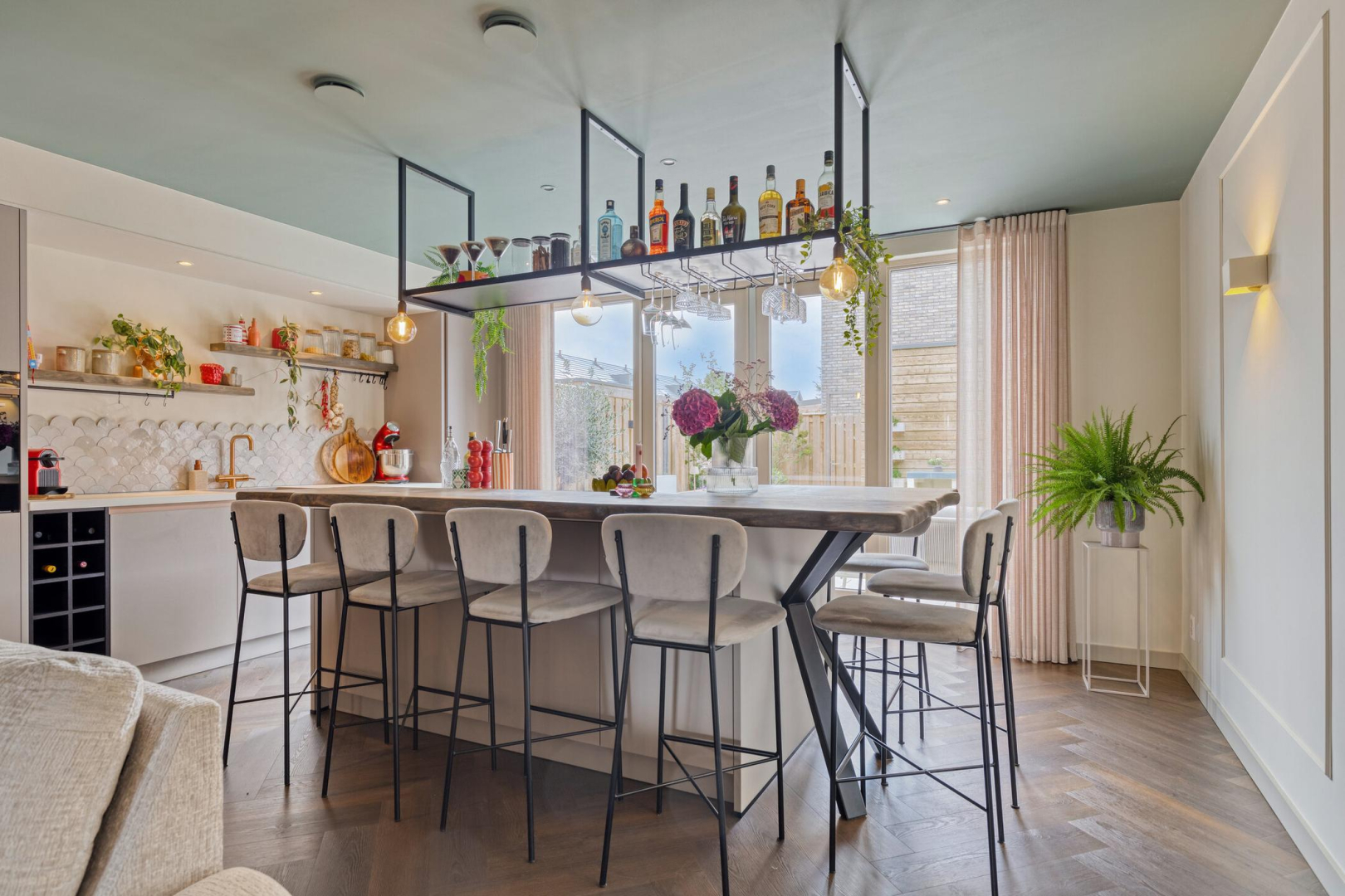 Via de entree met garderobe, meterkast en een modern toilet met fonteintje, loopt u door een stijlvolle glazen deur de lichte woonkamer binnen. Hier valt direct de prachtige kookeiland en de gezellige bar op. Aan de voorzijde bevindt zich een ruime eetkamer, terwijl de zithoek, centraal in de woning, is voorzien van een sfeervolle cinewall met elektrische haard. De keuken is volledig ingericht met hoogwaardige inbouwapparatuur: een inductiekookplaat, grote koelkast en vriezer, kokend water kraan, vaatwasser, oven en volop praktische bergruimte. Dankzij de openslaande deuren bij het kookeiland loopt u zo de zonnige tuin in, perfect voor wie houdt van binnen en buiten in één. De gehele begane grond is afgewerkt met een stijlvolle en onderhoudsvriendelijke PVC-vloer, wat de ruimte een moderne en warme uitstraling geeft.