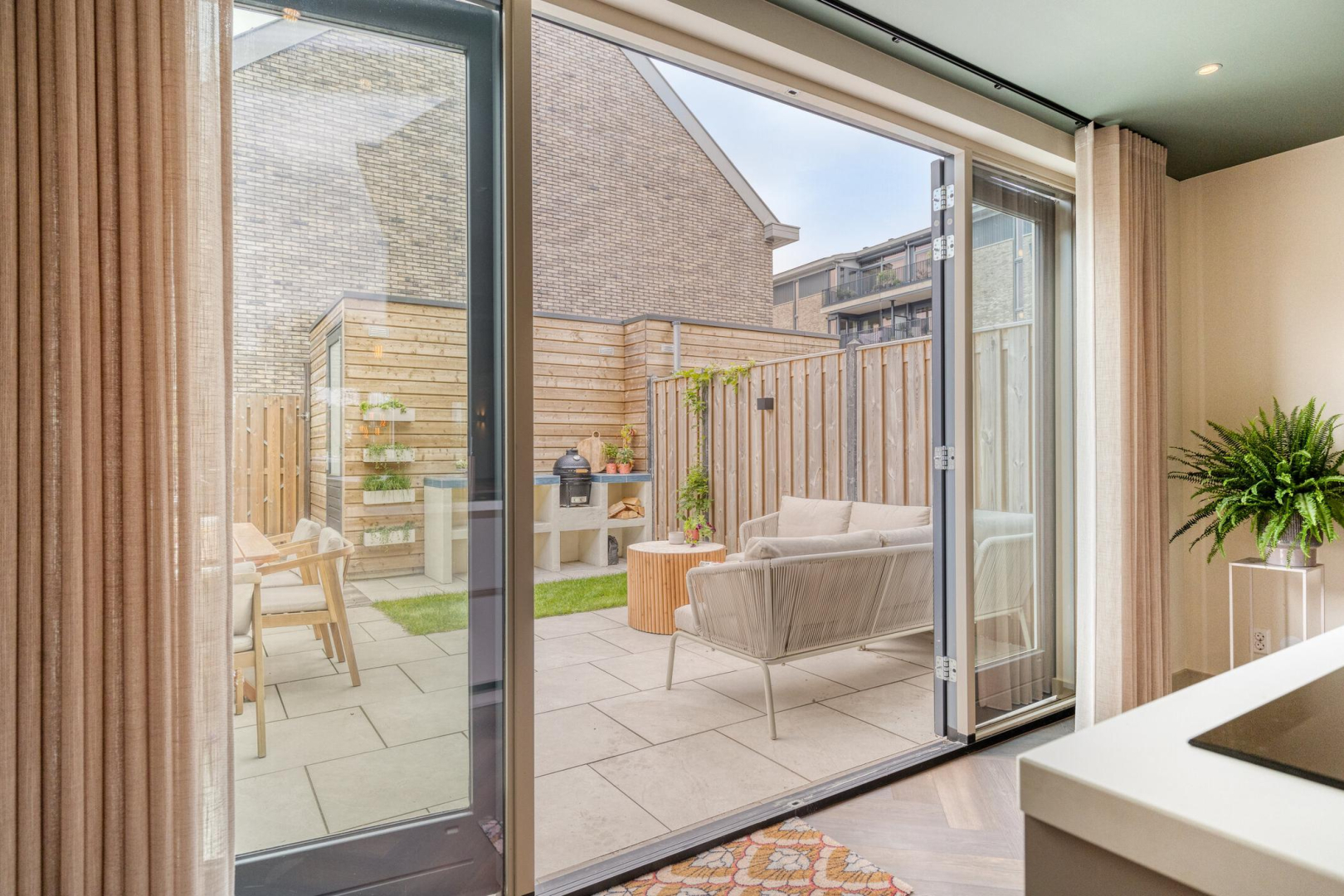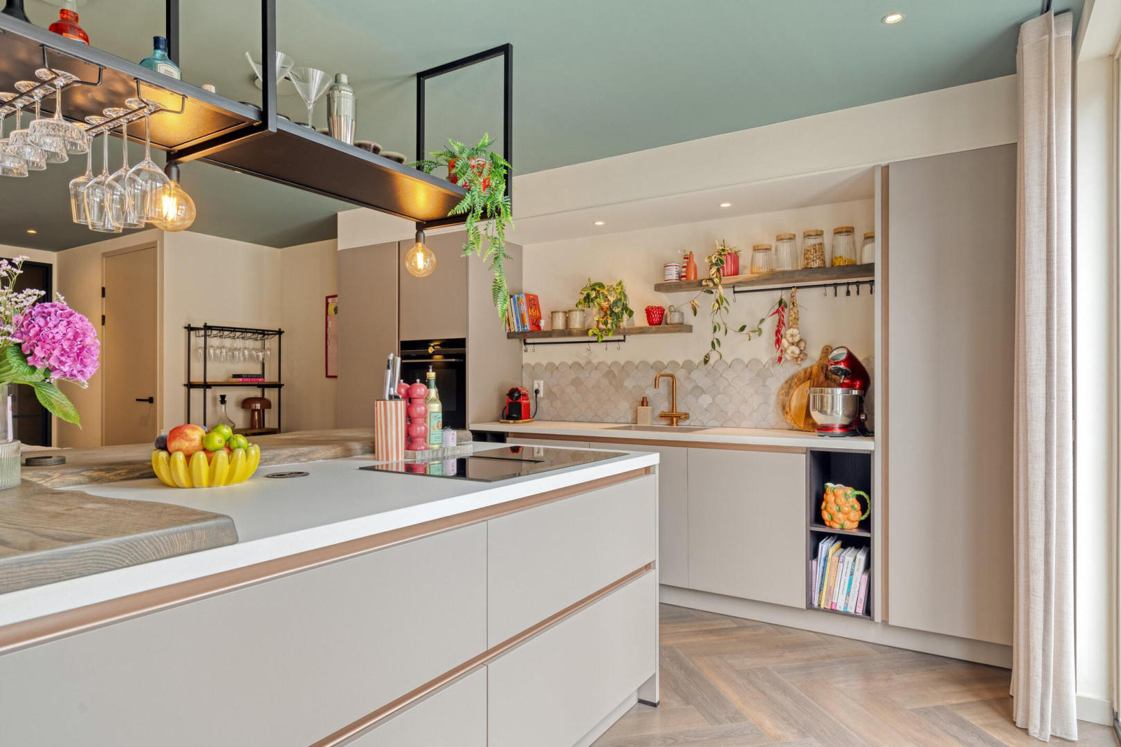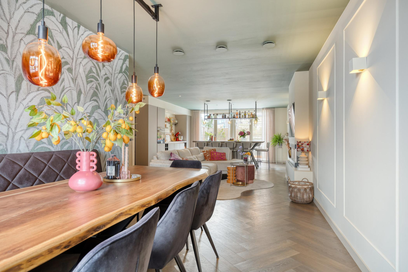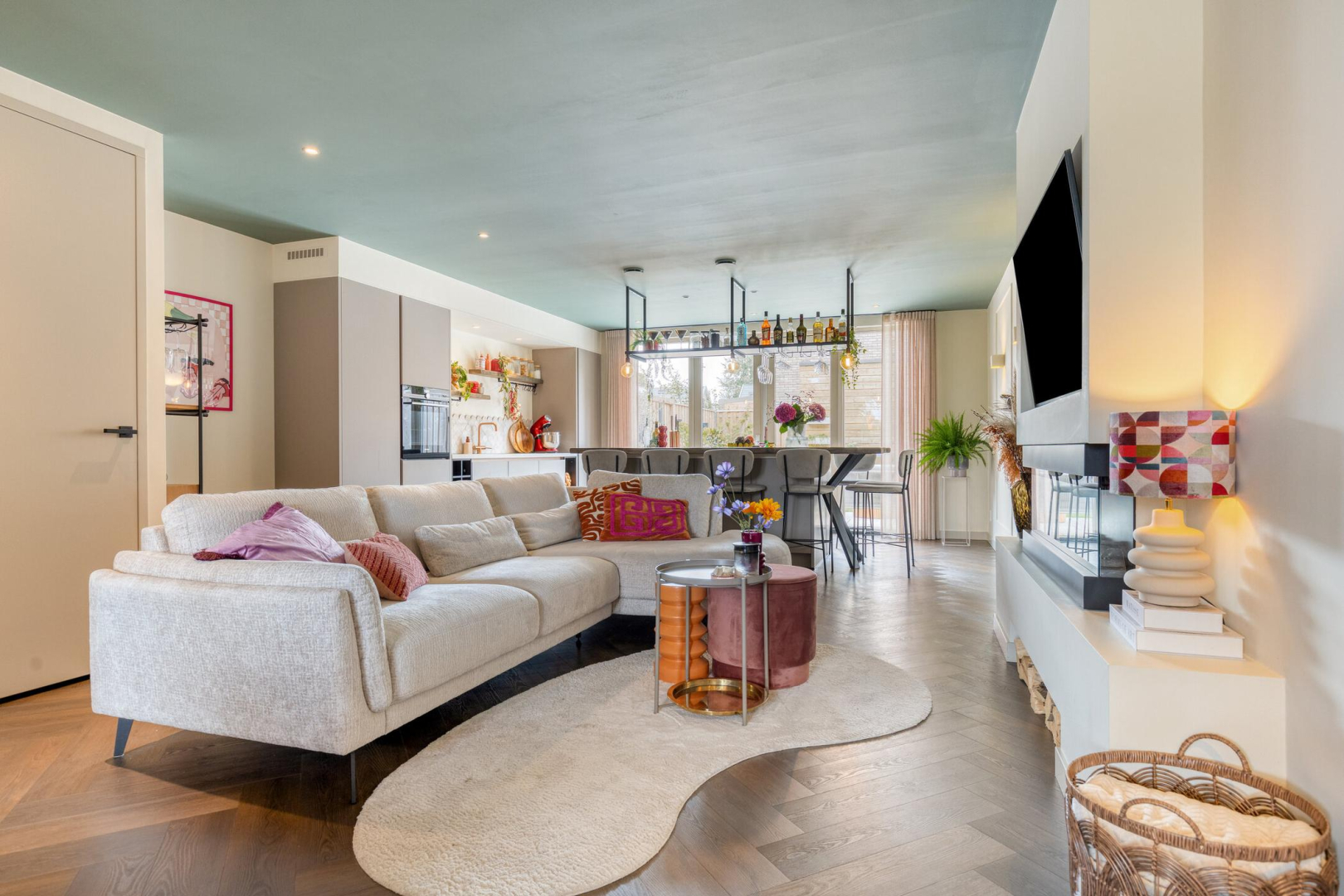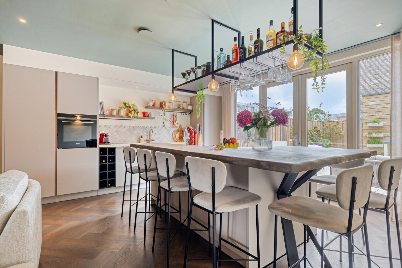 Via de entree met garderobe, meterkast en een modern toilet met fonteintje, loopt u door een stijlvolle glazen deur de lichte woonkamer binnen. Hier valt direct de prachtige kookeiland en de gezellige bar op. Aan de voorzijde bevindt zich een ruime eetkamer, terwijl de zithoek, centraal in de woning, is voorzien van een sfeervolle cinewall met elektrische haard. De keuken is volledig ingericht met hoogwaardige inbouwapparatuur: een inductiekookplaat, grote koelkast en vriezer, kokend water kraan, vaatwasser, oven en volop praktische bergruimte. Dankzij de openslaande deuren bij het kookeiland loopt u zo de zonnige tuin in, perfect voor wie houdt van binnen en buiten in één. De gehele begane grond is afgewerkt met een stijlvolle en onderhoudsvriendelijke PVC-vloer, wat de ruimte een moderne en warme uitstraling geeft.
