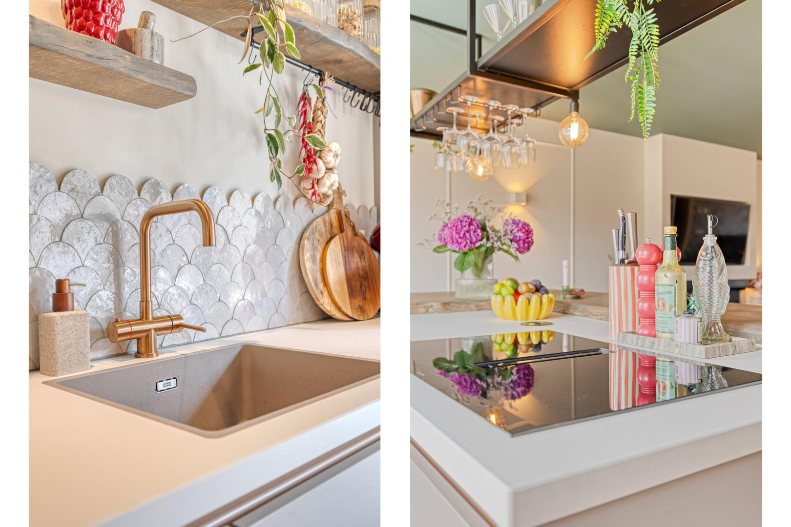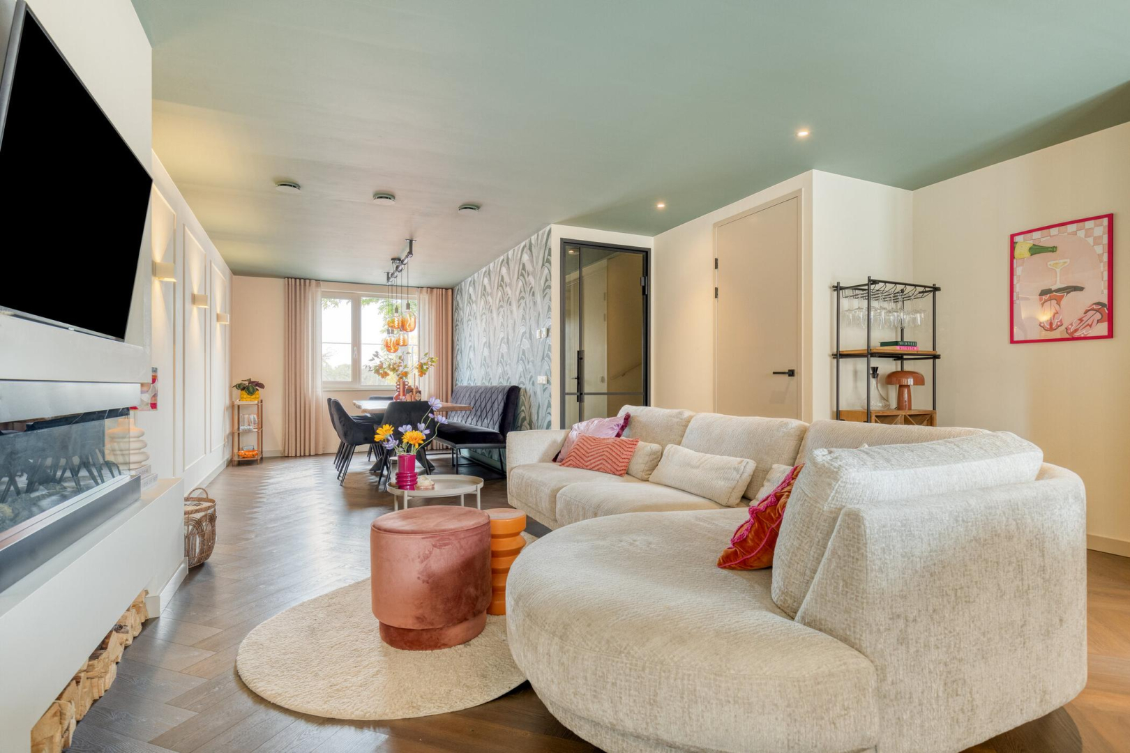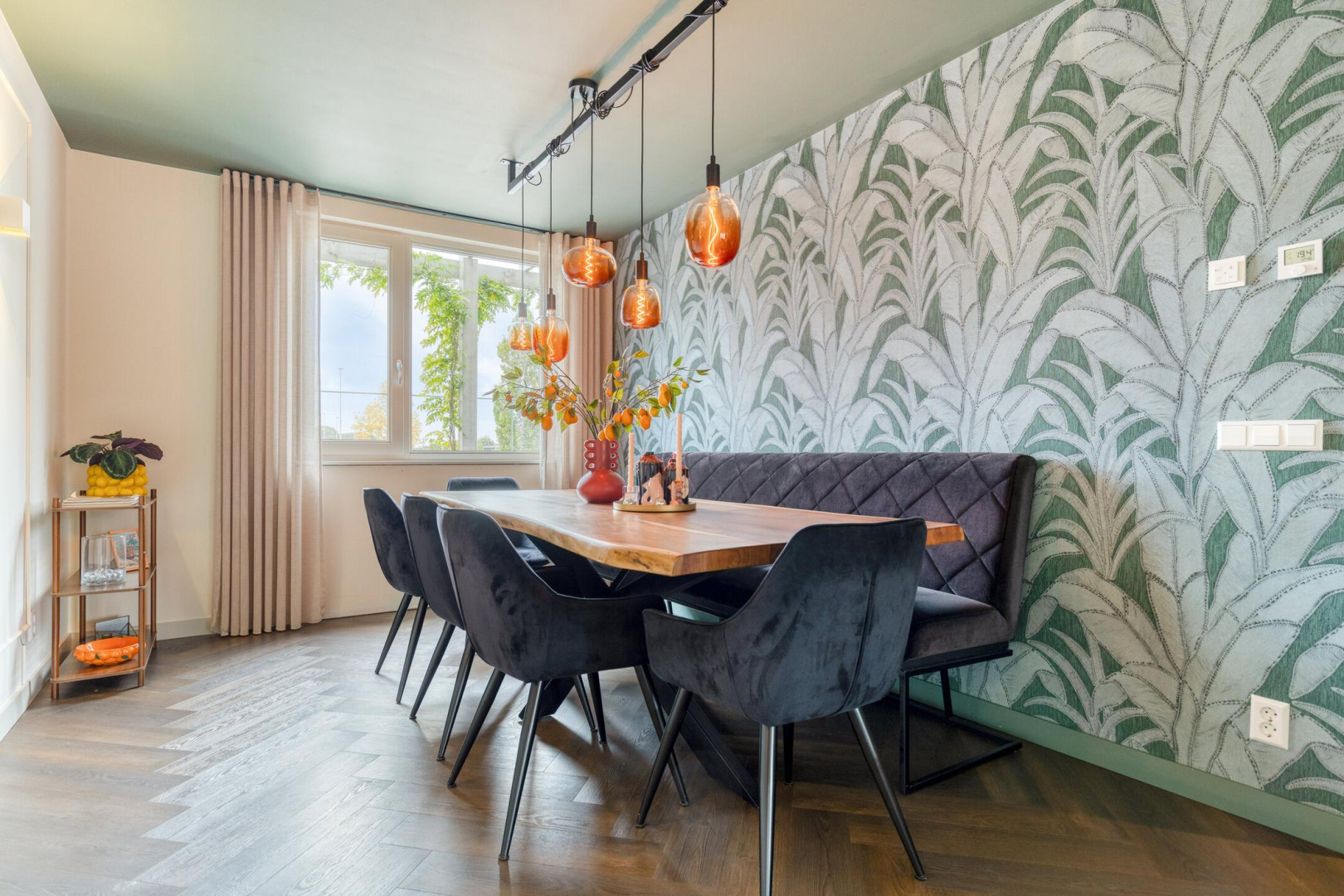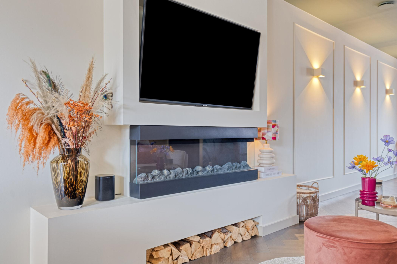 Via de entree met garderobe, meterkast en een modern toilet met fonteintje, loopt u door een stijlvolle glazen deur de lichte woonkamer binnen. Hier valt direct de prachtige kookeiland en de gezellige bar op. Aan de voorzijde bevindt zich een ruime eetkamer, terwijl de zithoek, centraal in de woning, is voorzien van een sfeervolle cinewall met elektrische haard. De keuken is volledig ingericht met hoogwaardige inbouwapparatuur: een inductiekookplaat, grote koelkast en vriezer, kokend water kraan, vaatwasser, oven en volop praktische bergruimte. Dankzij de openslaande deuren bij het kookeiland loopt u zo de zonnige tuin in, perfect voor wie houdt van binnen en buiten in één. De gehele begane grond is afgewerkt met een stijlvolle en onderhoudsvriendelijke PVC-vloer, wat de ruimte een moderne en warme uitstraling geeft.