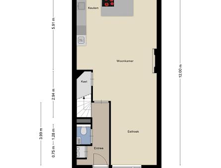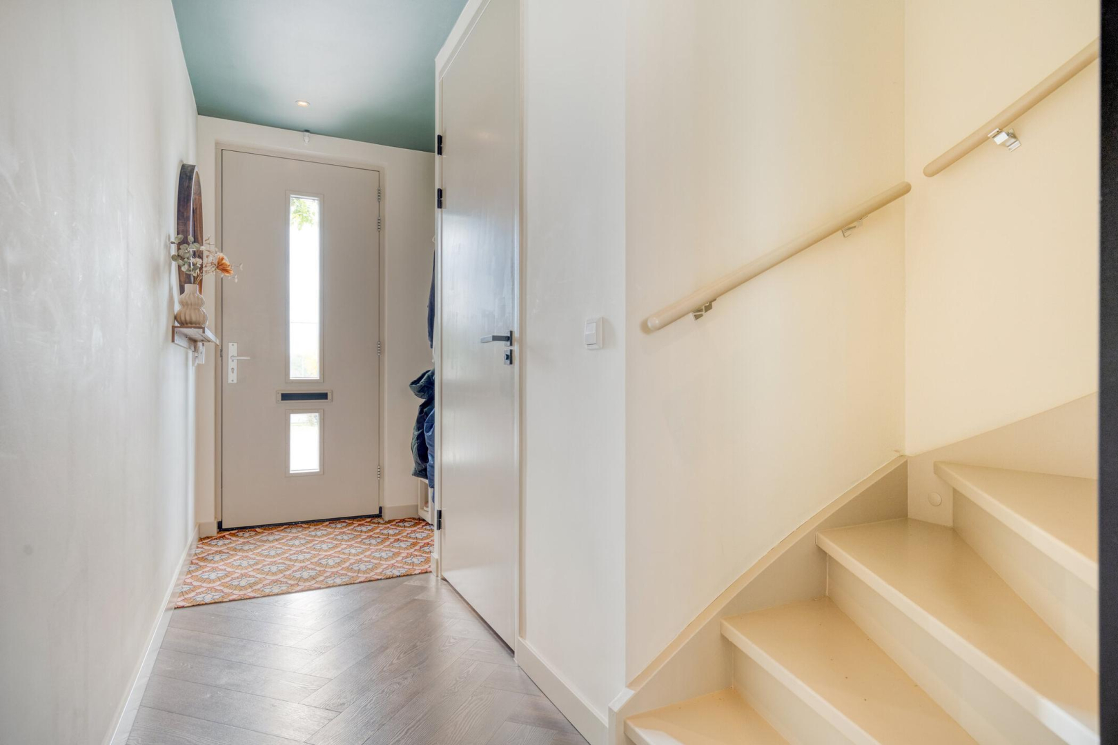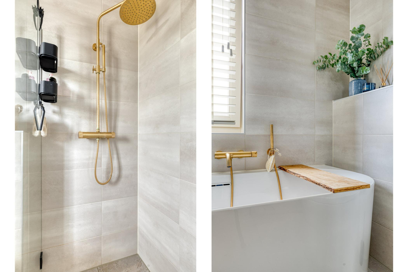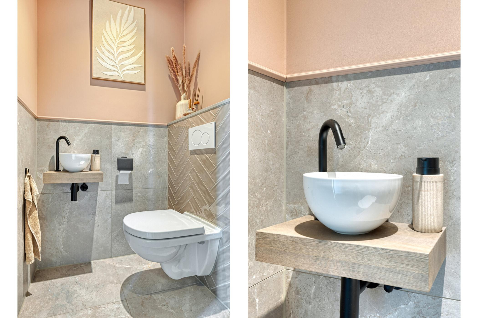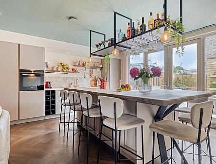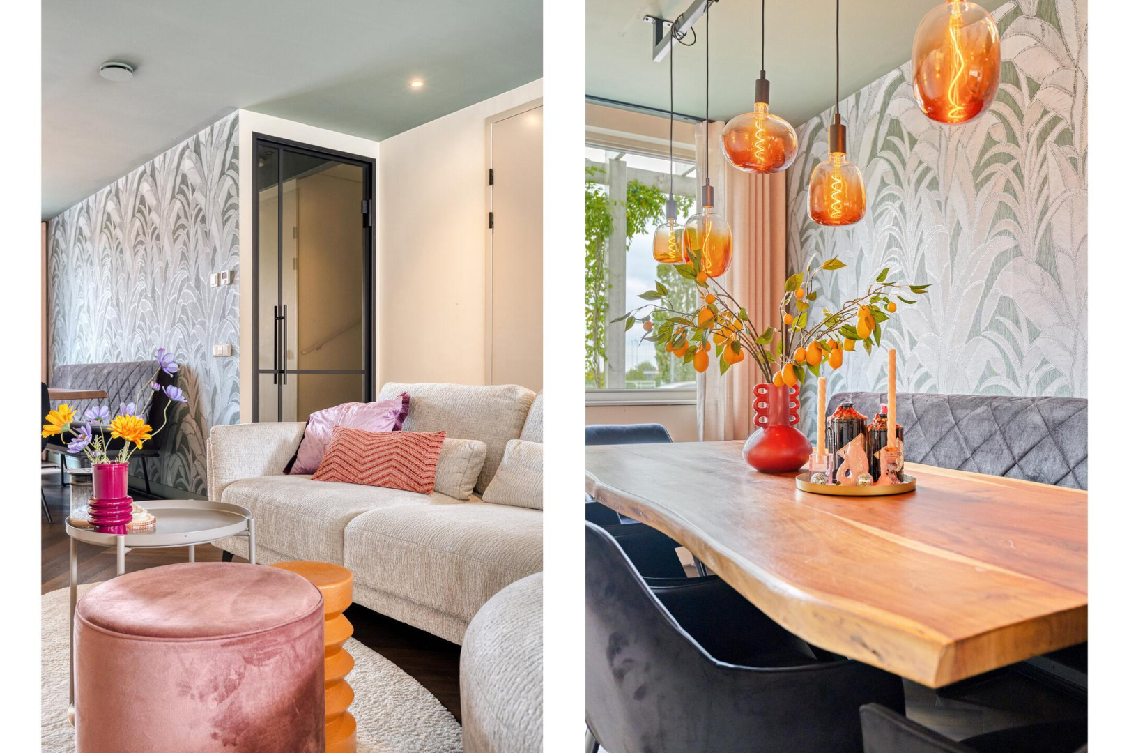 Via de entree met garderobe, meterkast en een modern toilet met fonteintje, loopt u door een stijlvolle glazen deur de lichte woonkamer binnen. Hier valt direct de prachtige kookeiland en de gezellige bar op. Aan de voorzijde bevindt zich een ruime eetkamer, terwijl de zithoek, centraal in de woning, is voorzien van een sfeervolle cinewall met elektrische haard. De keuken is volledig ingericht met hoogwaardige inbouwapparatuur: een inductiekookplaat, grote koelkast en vriezer, kokend water kraan, vaatwasser, oven en volop praktische bergruimte. Dankzij de openslaande deuren bij het kookeiland loopt u zo de zonnige tuin in, perfect voor wie houdt van binnen en buiten in één. De gehele begane grond is afgewerkt met een stijlvolle en onderhoudsvriendelijke PVC-vloer, wat de ruimte een moderne en warme uitstraling geeft.