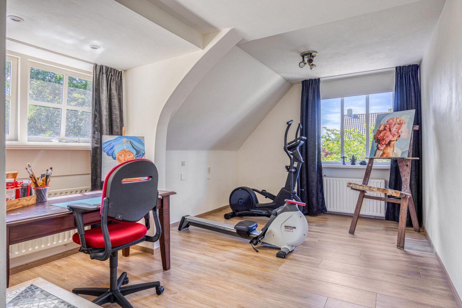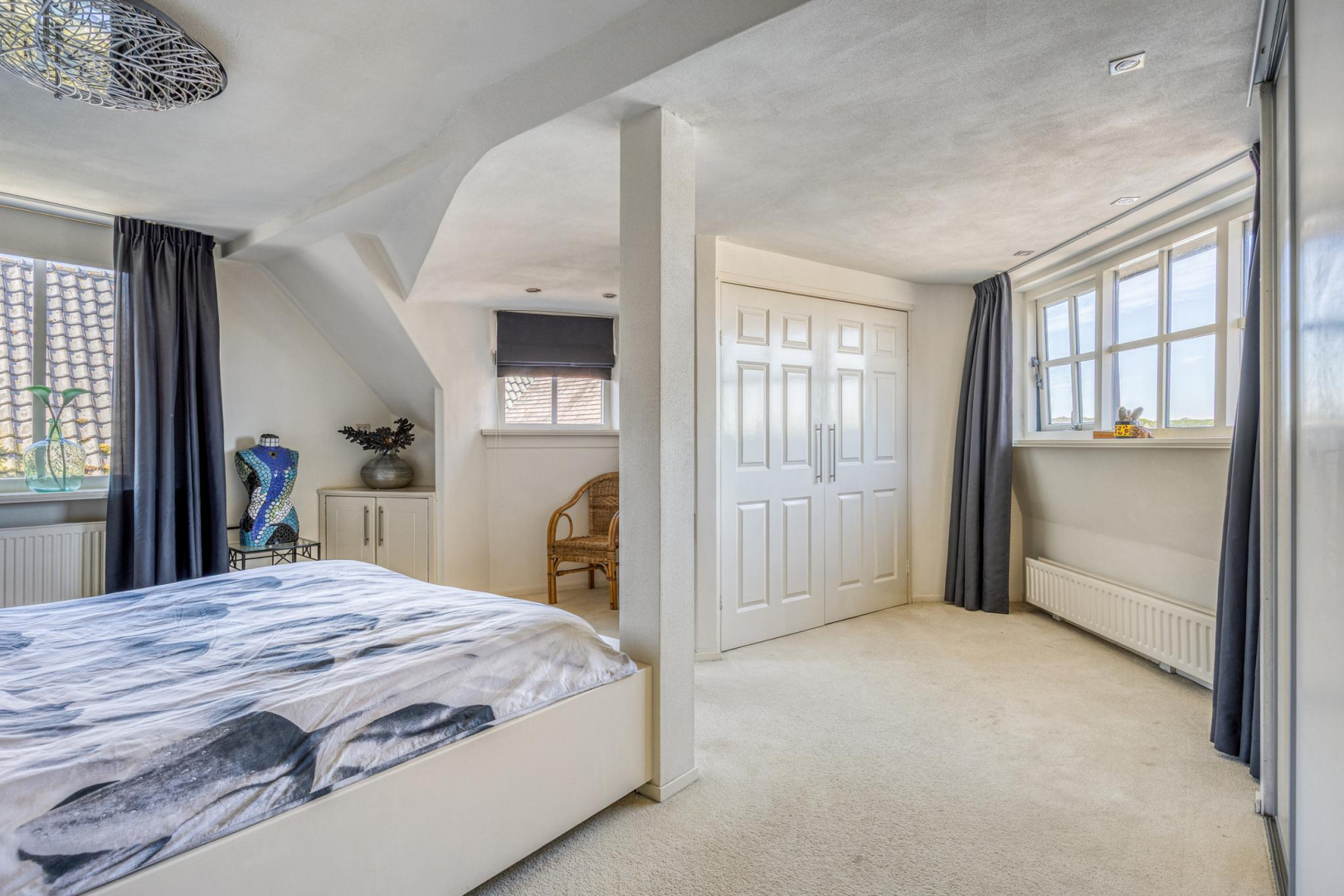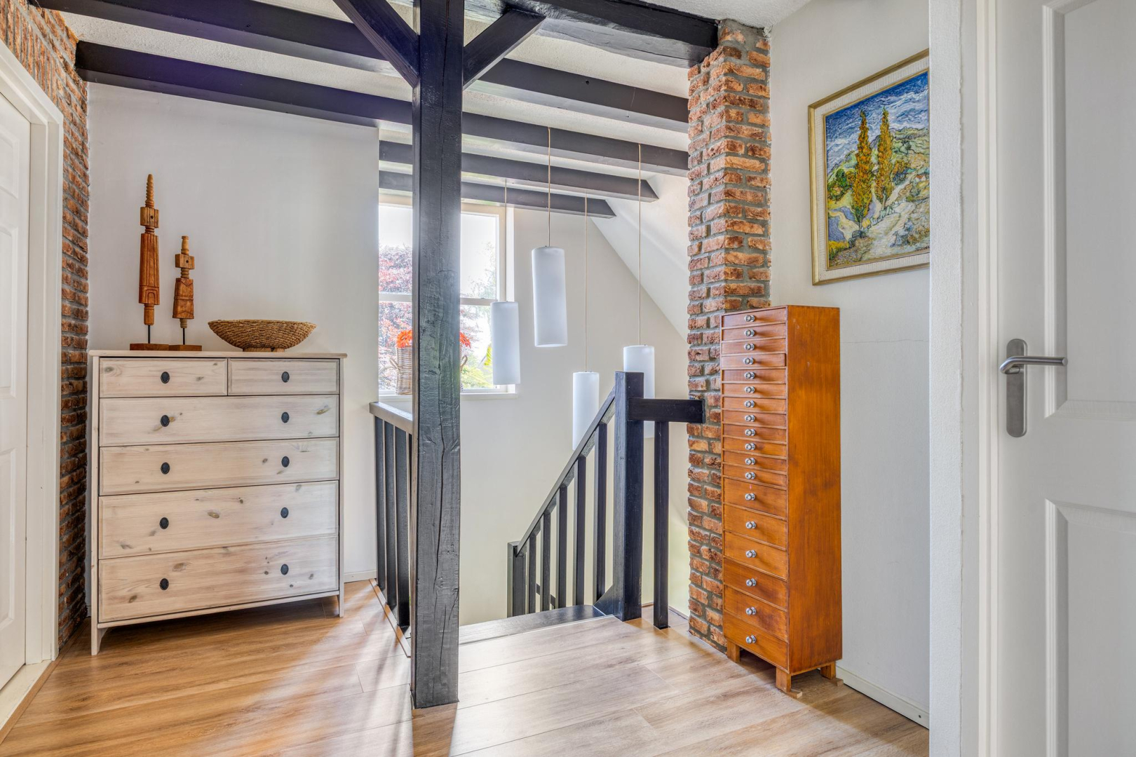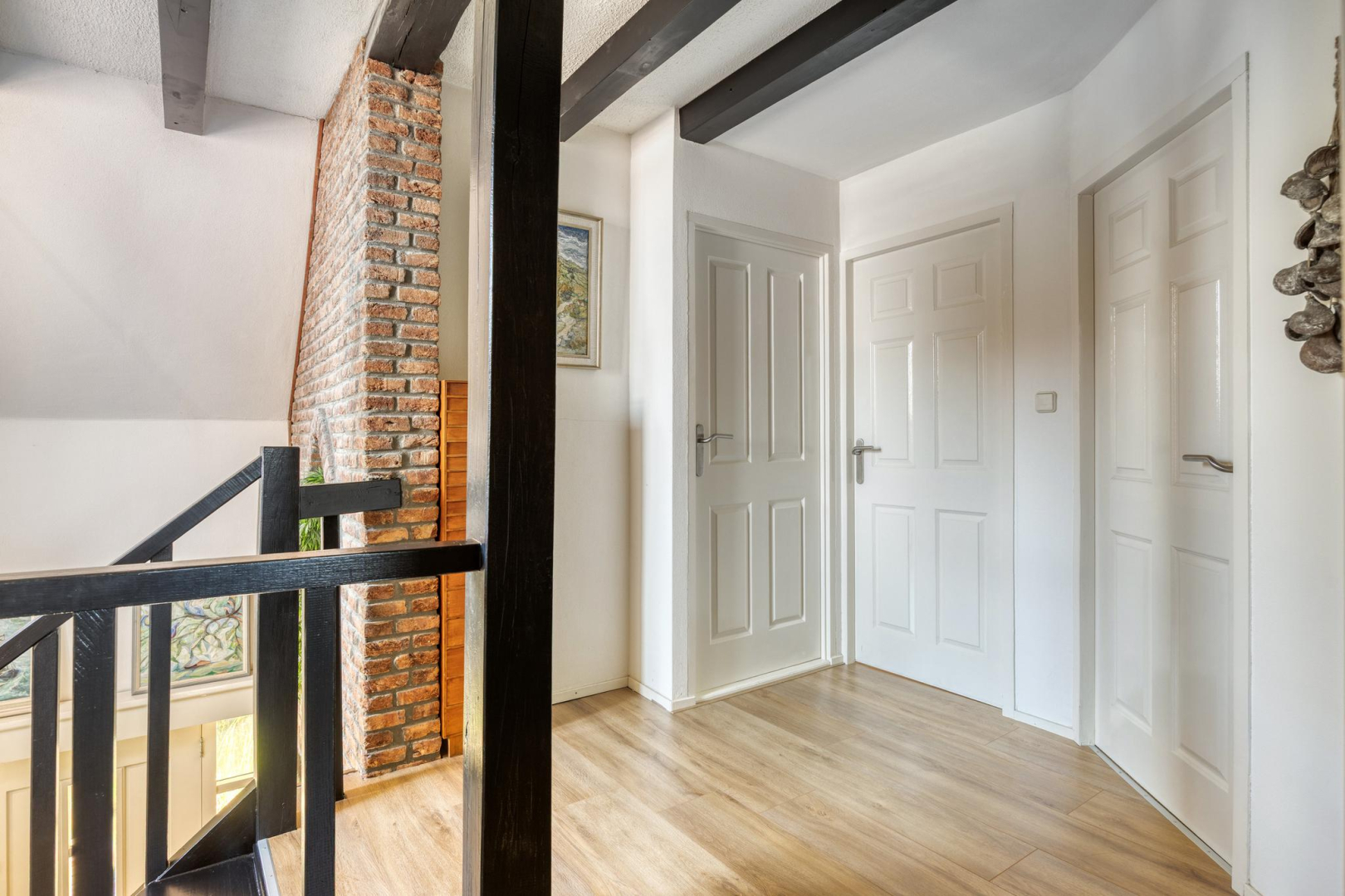 Een vaste trap leidt naar de eerste verdieping met een nette laminaatvloer op de overloop en prachtige paneeldeuren. Hier bevinden zich drie slaapkamers. Een ruime kamer met dakkapel, laminaat, veel licht en momenteel in gebruik als sport-/werkkamer. Een royale master bedroom met vaste kast, aparte inloopkast, vloerbedekking, dakkapel en meerdere ramen. Een derde, L-vormige slaapkamer met dakkapel en vloerbedekking. Ook op deze verdieping bevindt zich een badkamer met douchecabine, wastafel, wandcloset en handdoekradiator – ideaal voor een groot gezin of gasten.