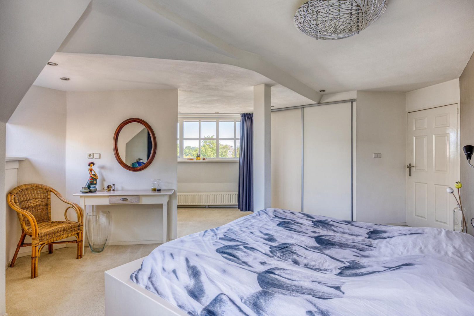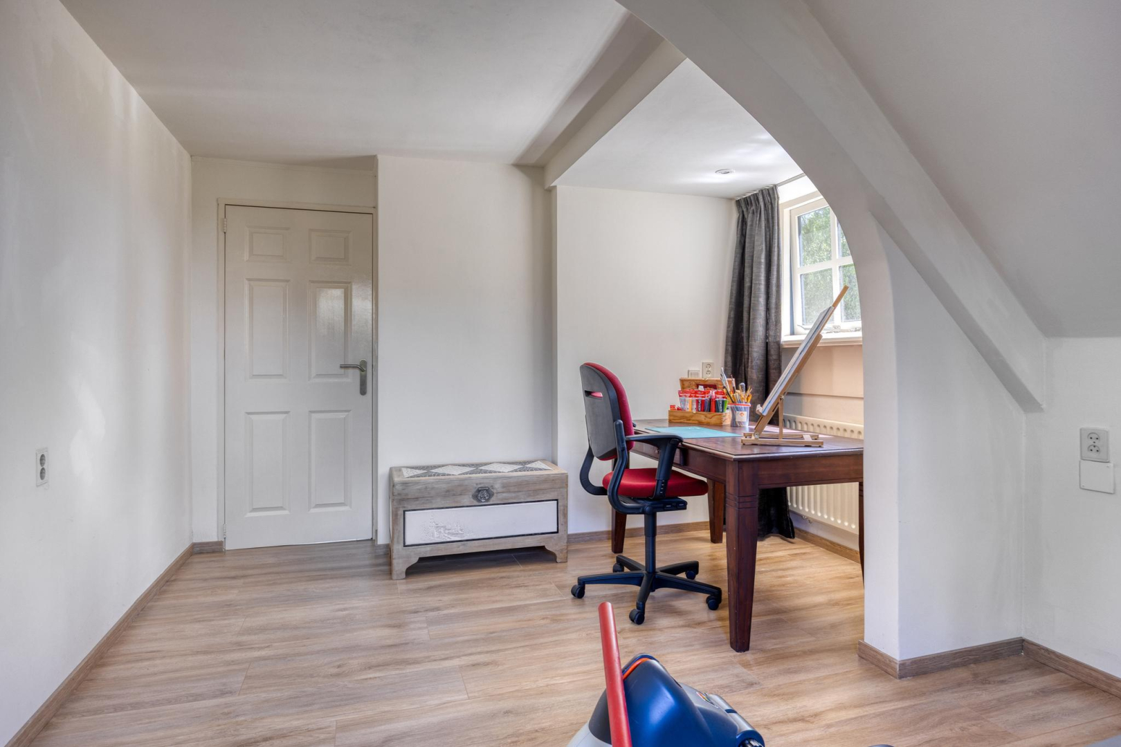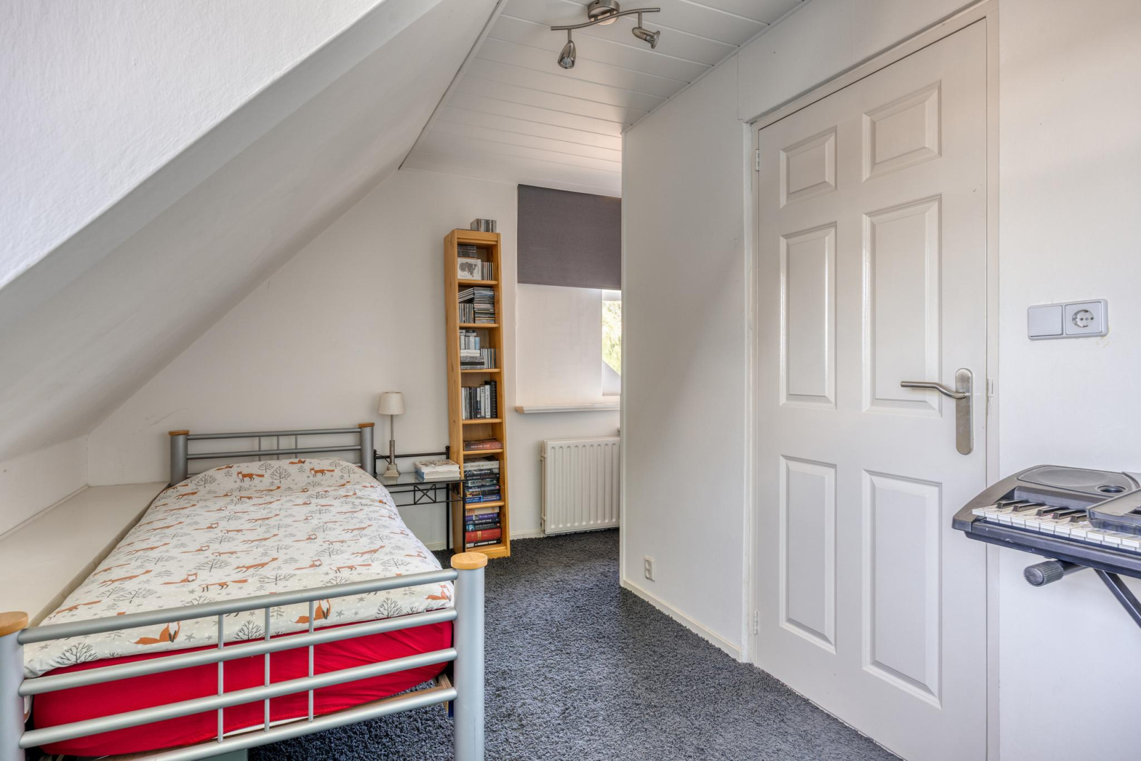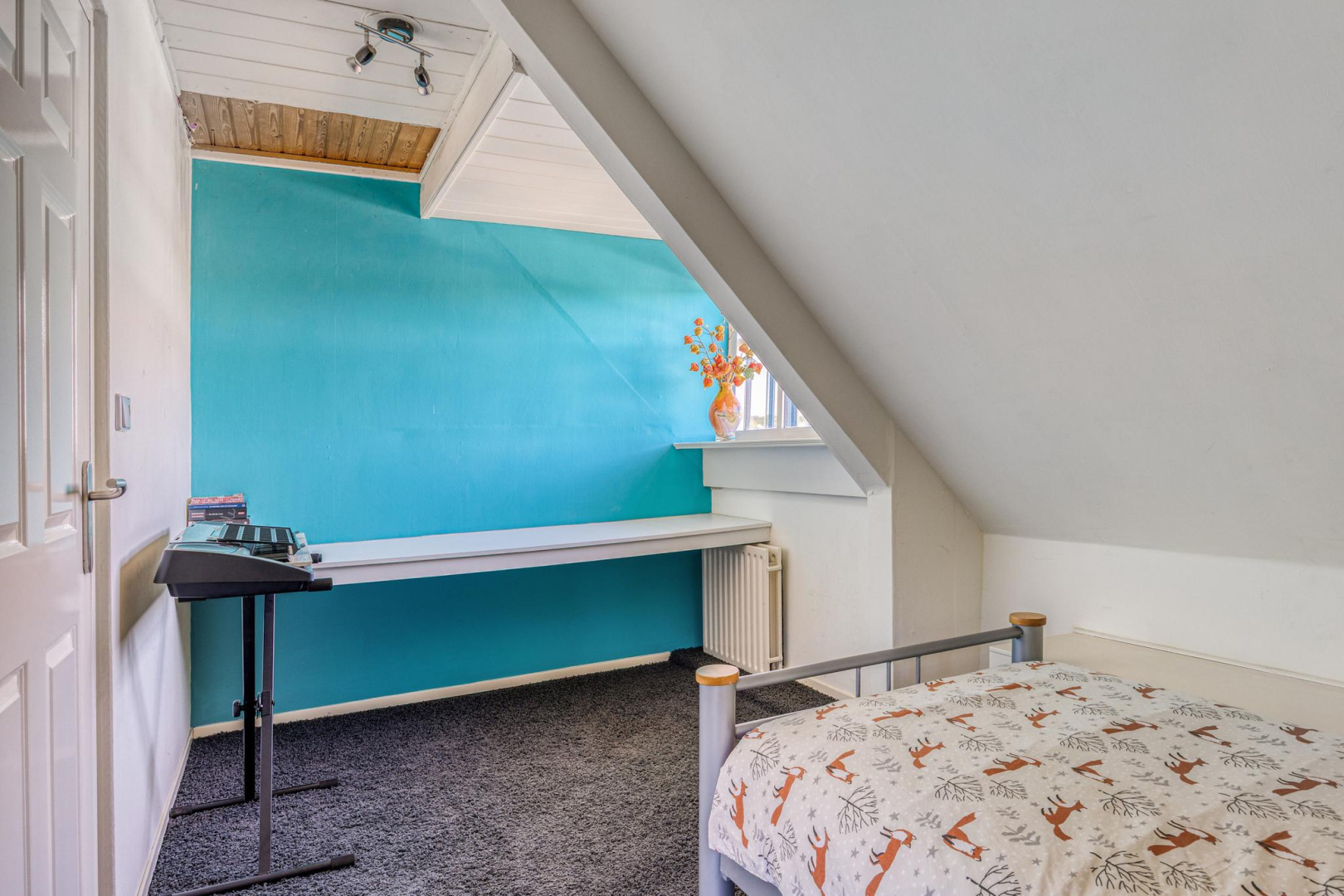 Een vaste trap leidt naar de eerste verdieping met een nette laminaatvloer op de overloop en prachtige paneeldeuren. Hier bevinden zich drie slaapkamers. Een ruime kamer met dakkapel, laminaat, veel licht en momenteel in gebruik als sport-/werkkamer. Een royale master bedroom met vaste kast, aparte inloopkast, vloerbedekking, dakkapel en meerdere ramen. Een derde, L-vormige slaapkamer met dakkapel en vloerbedekking. Ook op deze verdieping bevindt zich een badkamer met douchecabine, wastafel, wandcloset en handdoekradiator – ideaal voor een groot gezin of gasten.